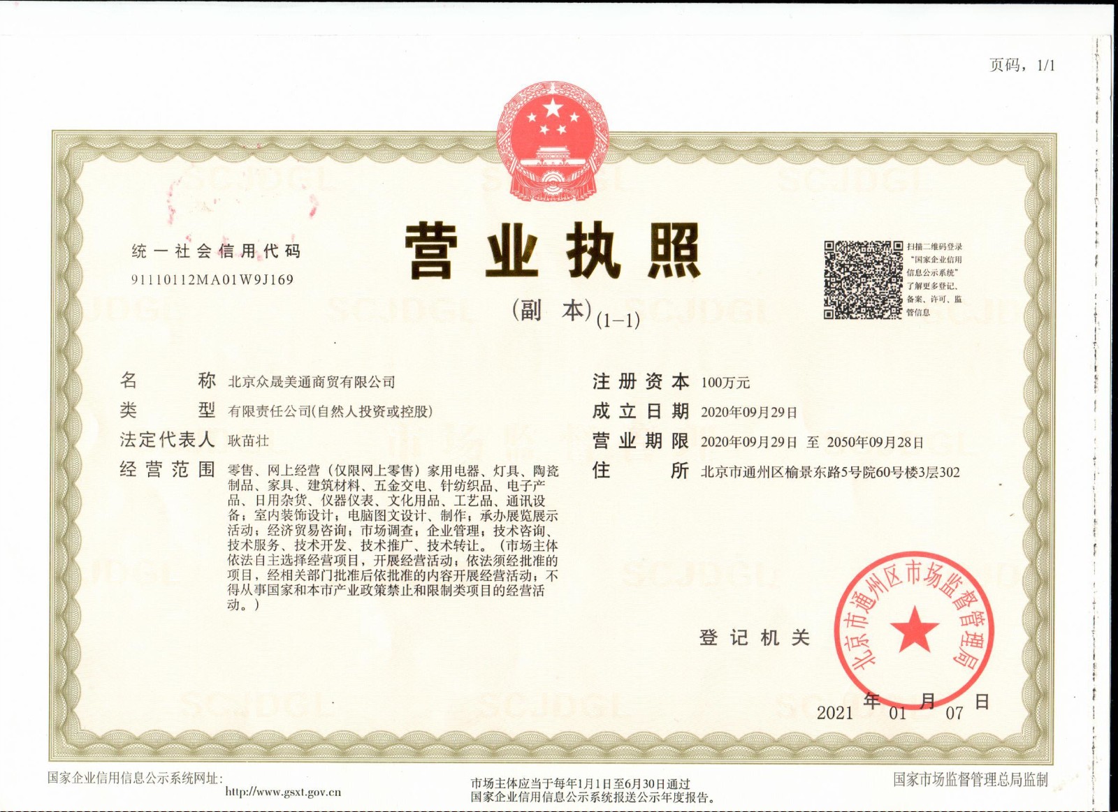 - 经营范围:零售、网上经营(仅限网上零售)家用电器、灯具、陶瓷制品、家具、建筑材料、五金交电、针纺织品、电子产品、日用杂货、仪器仪表、文化用品、工艺品、通讯设备;室内装饰设计;电脑图文设计、制作;承办展览展示活动;经济贸易咨询;市场调查;企业管理;技术咨询、技术服务、技术开发、技术推广、技术转让。(市场主体依法自主选择经营项目,开展经营活动;依法须经批准的项目,经相关部门批准后依批准的内容开展经营活动;不得从事国家和本市产业政策禁止和限制类项目的经营活动。)