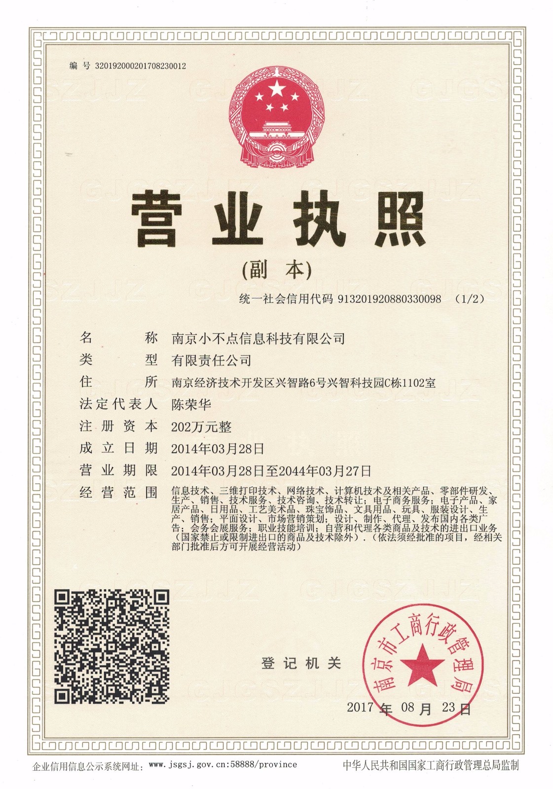 - 经营范围:信息技术、三维打印技术、网络技术、计算机技术及相关产品、零部件研发、生产、销售、技术服务、技术咨询、技术转让;电子商务服务;电子产品、家居产品、日用品、工艺美术品、珠宝饰品、文具用品、玩具、服装设计、生产、销售;平面设计、市场营销策划;设计、制作、代理、发布国内各类广告;会务会展服务;职业技能培训;自营和代理各类商品及技术的进出口业务(国家禁止或限制进出口的商品及技术除外).(依法须经批准的项目,经相关部门批准后方可开展经营活动)