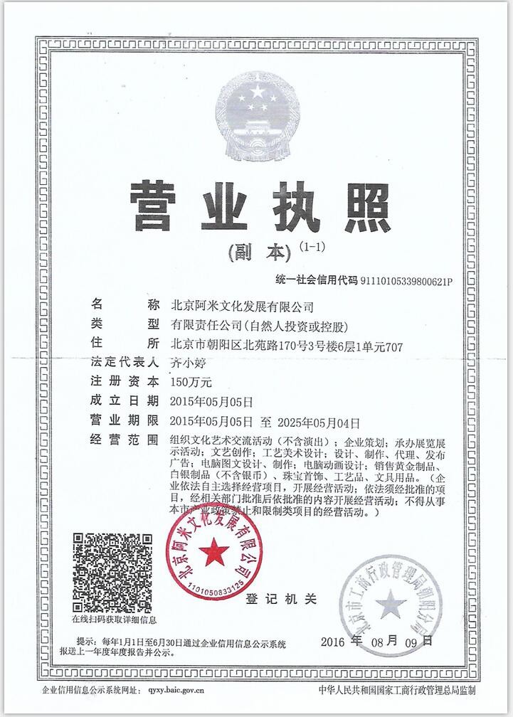 - 经营范围:组织文化艺术交流活动(不含演出);企业策划;承办展览展示活动;文艺创作;工艺美术设计;设计、制作、代理、发布广告;电脑图文设计、制作;电脑动画设计;销售黄金制品、白银制品(不含银币)、珠宝首饰、工艺品、文具用品。(企业依法自主选择经营项目,开展经营活动;依法须经批准的项目,经相关部门批准后依批准的内容开展经营活动;不得从事本市产业政策禁止和限制类项目的经营活动。)