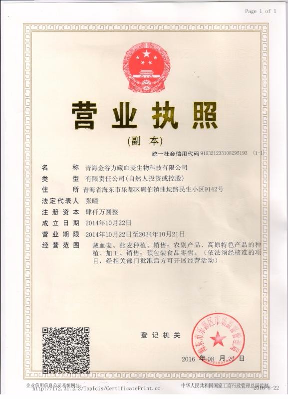 藏血麦、燕麦种植、销售;农副产品、高原特色产品的种植、加工、销售;预包装食品零售。(依法须经核准的项目,经相关部门批准后方可开展经营活动)