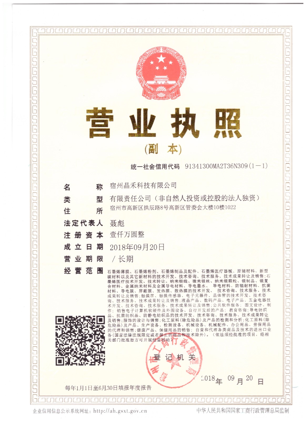 - 经营范围:石墨烯薄膜、石墨烯粉剂、石墨烯制品及配件、石墨烯医疗器械、原辅材料、新型碳材料以及其它新材料的技术开发、技术咨询、技术服务、技术成果转让及销售;石墨烯医疗技术开发、技术转让。纳米银线、微米银丝、纳米银颗粒、银制品、银复合材料、金属纳米材料及金属导电材料、导电墨水、导电材料、防辐射材料、抗菌材料、导电膜、屏蔽膜、发热膜、散热膜的技术开发、技术咨询、技术服务、技术成果转让及销售;触摸屏、触摸传感器、电子元器件、晶体管的技术开发、技术咨询、技术服务、技术成果转让及销售;液晶产品、数码产品、电子产品、五金电器技术开发、技术咨询、技术服务、技术成果成果转让及销售;公共软件服务;图文设计、制作;销售电子计算机软硬件及外围设备、自行开发后的产品;教育咨询;导电纺织品、抗菌纺织品、防静电纺织品的技术开发、技术咨询、技术服务、技术成果转让及销售;服饰的设计与销售;化工原料(除危险品)及产品的检测和分析;化工原料(除危险品)及产品、生产设备、检测设备、机械设备、机械配件、办公用品、劳保用品的代理和销售;健康产品、保健用品的销售;自营和代理各类商品及技术的进出口业务(国家法律法规限定或者禁止的商品和技术除外)。(依法须经批准的项目,经相关部门批准后方可开展经营活动)