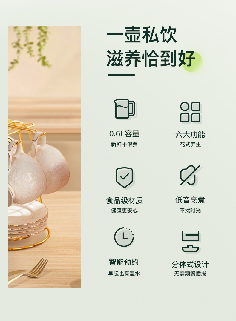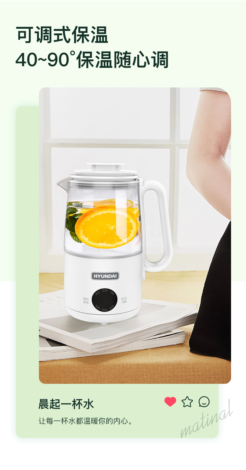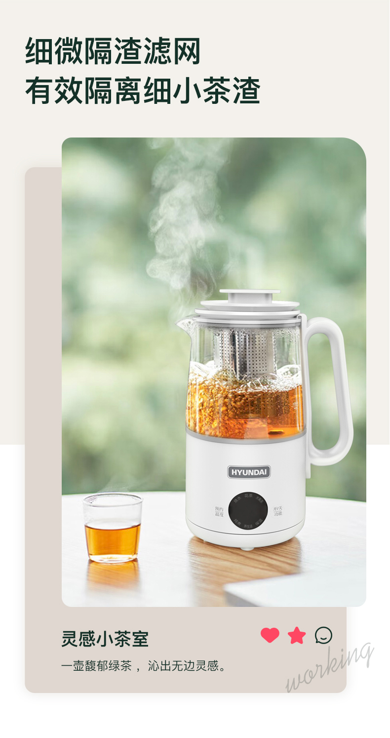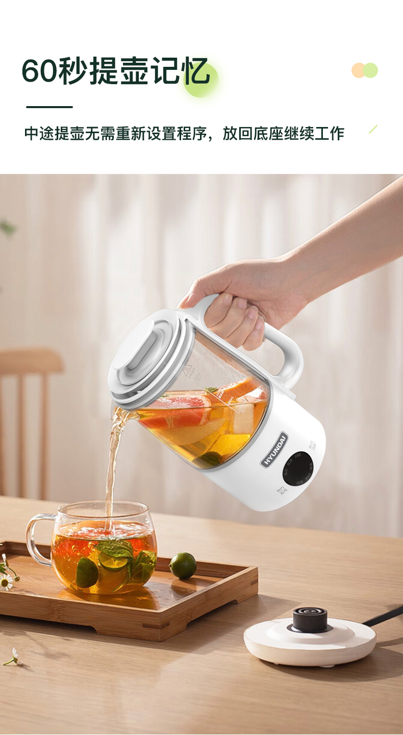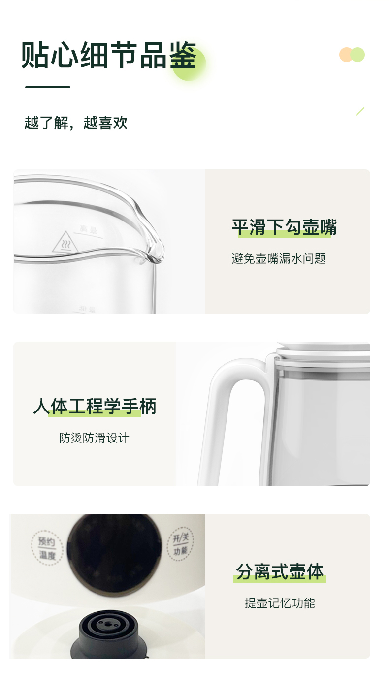 1、大杯口、分体设计,提壶倒水和清洗更便捷; 2、600ML轻盈便携,养生壶+水杯二合一 3、灵敏触控6种模式:烧水、花茶、水果茶、炖煮、养生汤、保温 4、8小时预约、40~90°保温随心调、60S提壶记忆功能 5、304不锈钢滤网可拆卸,易清洗,不锈钢发热底盘,防干烧不粘底 6、高硼硅玻璃壶身冷热骤变不开裂,卡扣防溅壶盖一旋即可; 7、人体工程学手柄设计,倾倒不烫手,舒适省力