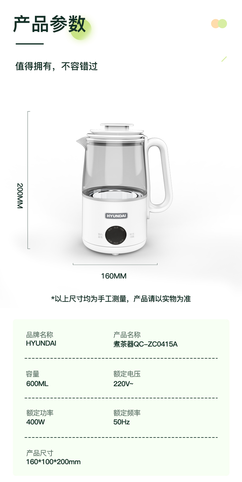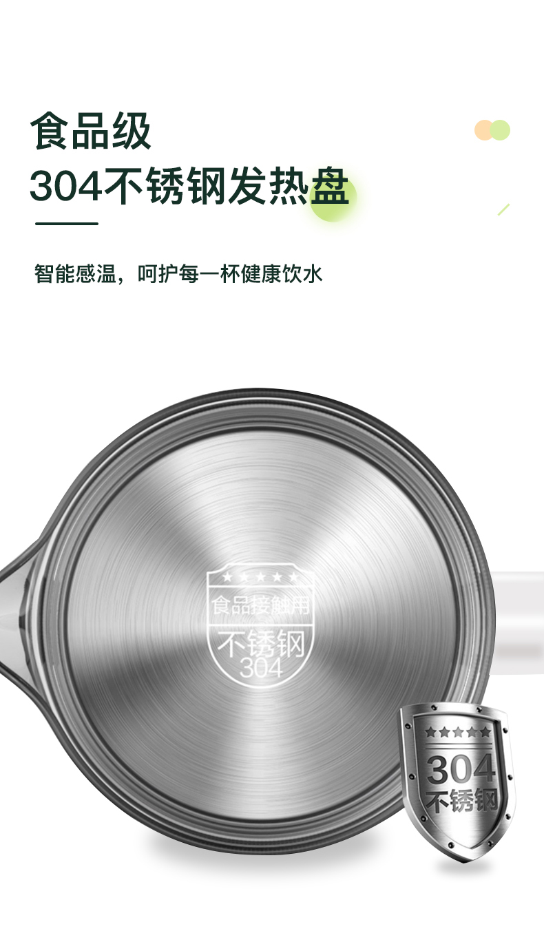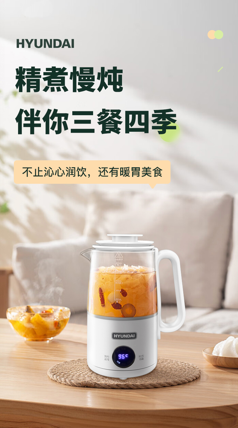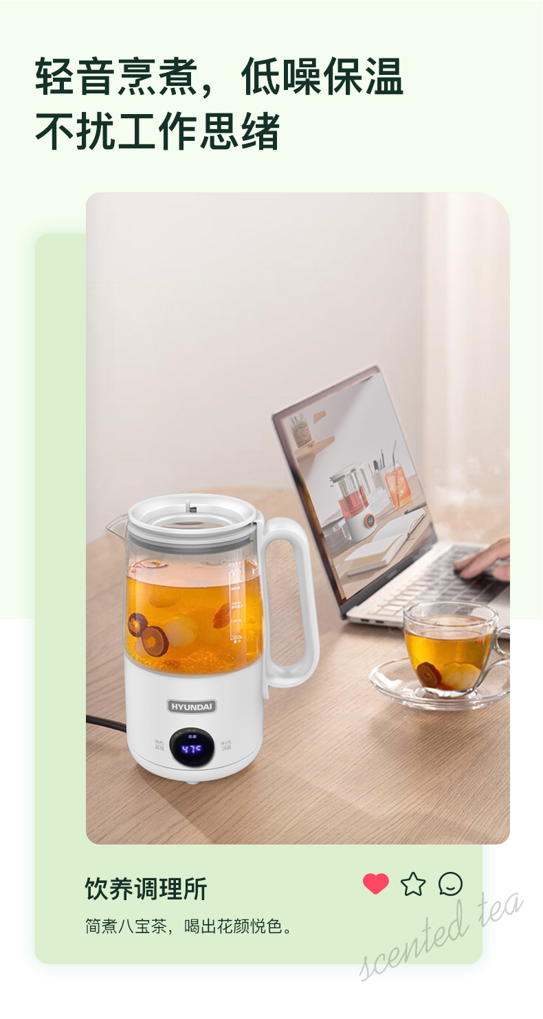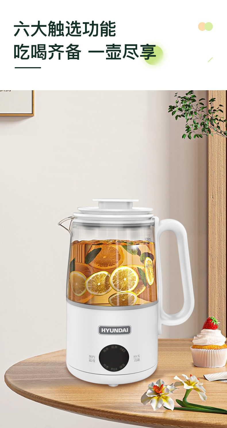 1、大杯口、分体设计,提壶倒水和清洗更便捷; 2、600ML轻盈便携,养生壶+水杯二合一 3、灵敏触控6种模式:烧水、花茶、水果茶、炖煮、养生汤、保温 4、8小时预约、40~90°保温随心调、60S提壶记忆功能 5、304不锈钢滤网可拆卸,易清洗,不锈钢发热底盘,防干烧不粘底 6、高硼硅玻璃壶身冷热骤变不开裂,卡扣防溅壶盖一旋即可; 7、人体工程学手柄设计,倾倒不烫手,舒适省力