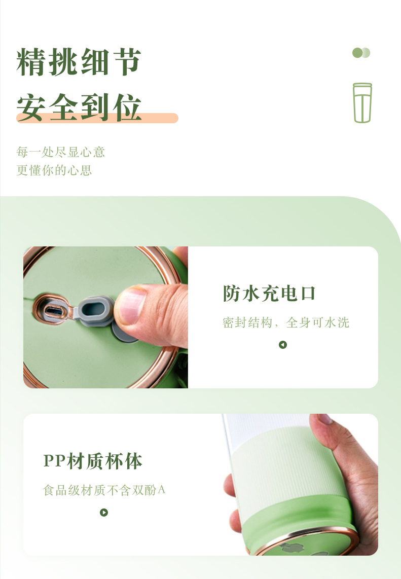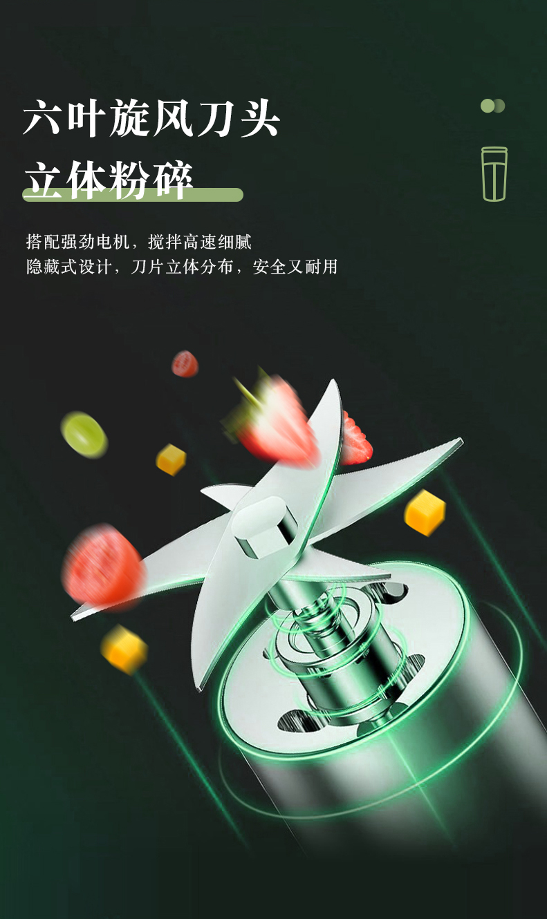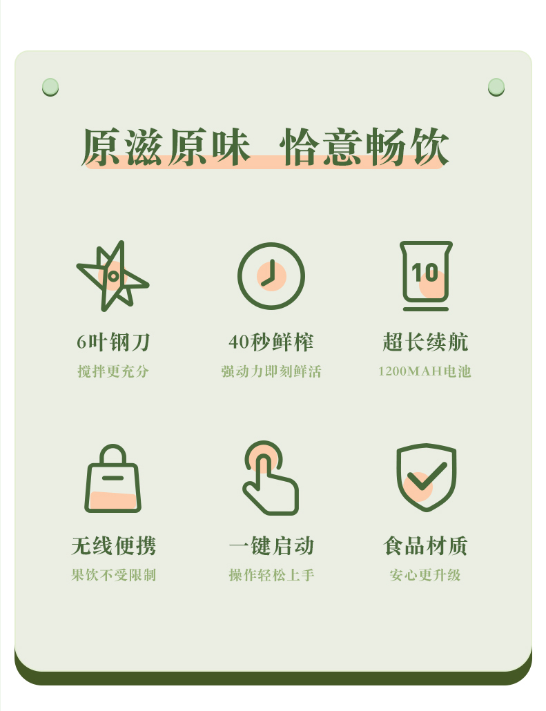 1、无线便携、轻巧杯体、密封不漏 2、1200mAh大容量电池,持久续航 3、6叶钢刀、40秒即刻鲜榨果汁、奶昔 4、带提绳、安全开盖保护装置、防卡刀 5、USB便携充电