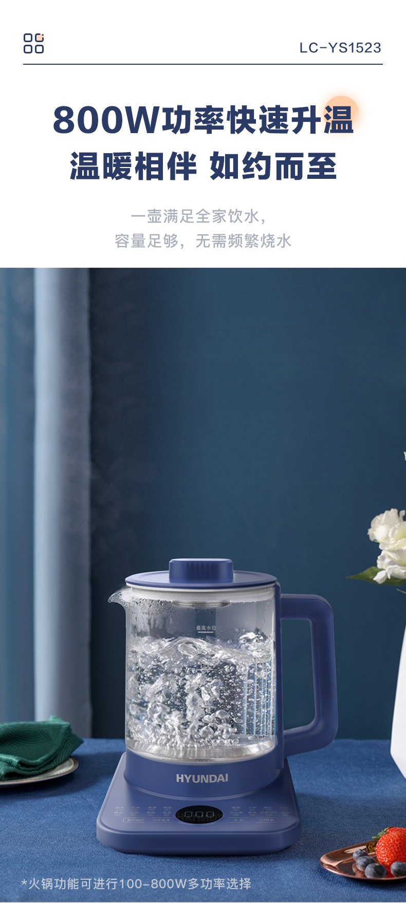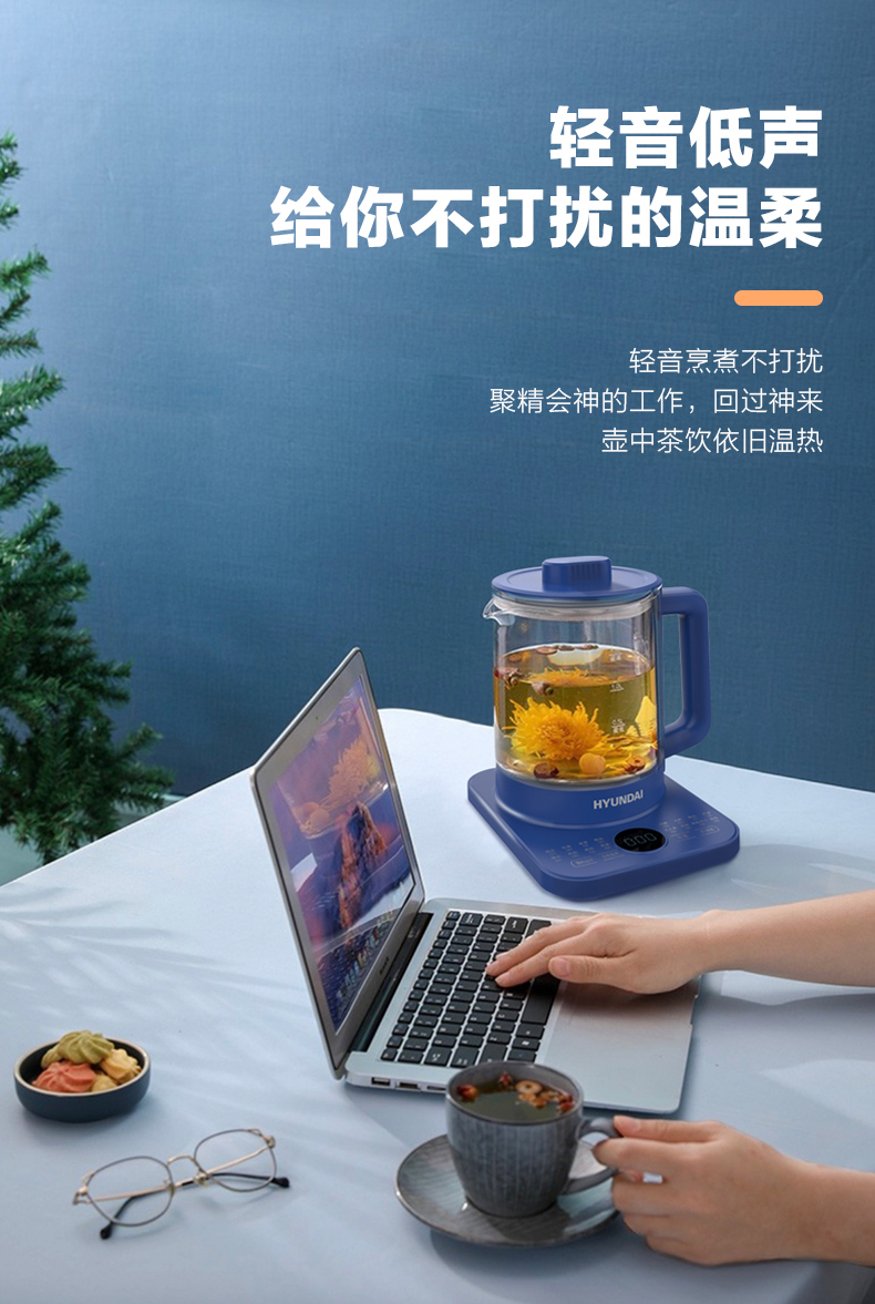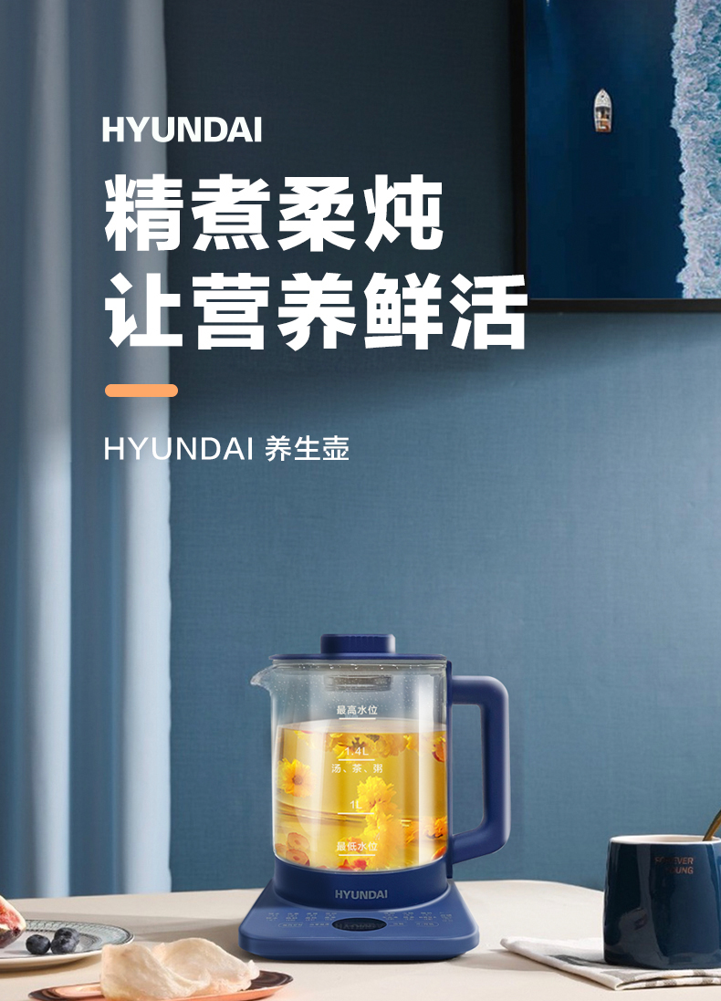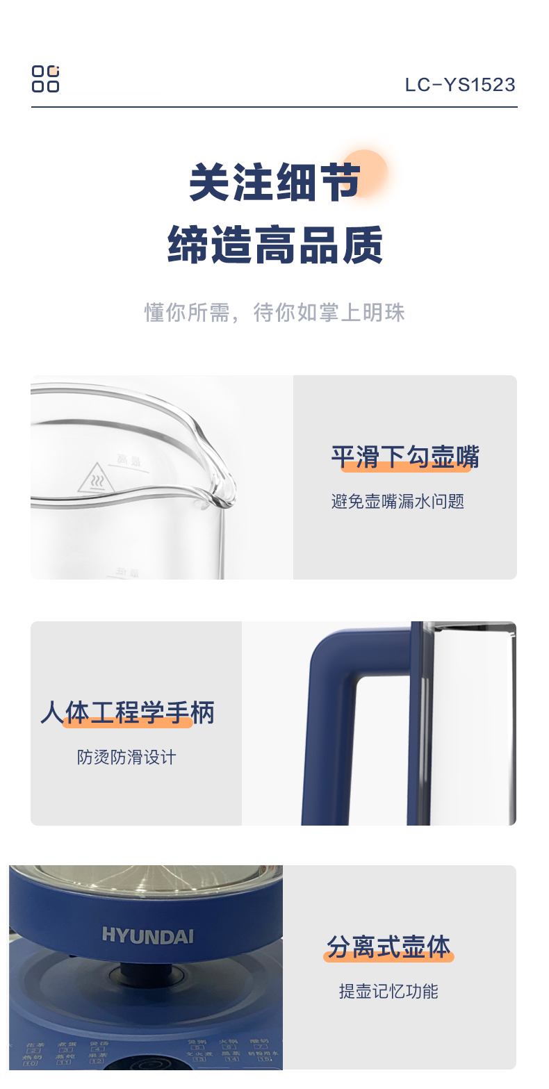 1、1.5L容量、16功能大菜单、可预约定时,一键操作 2、高硼硅玻璃,健康无涂层易清洗,300秒提壶记忆; 3、24H小时保温,随时可以喝热水; 4、直接细煮,满足日常大量烹煮所需; 5、防烫手柄,高贵壶身简约设计。