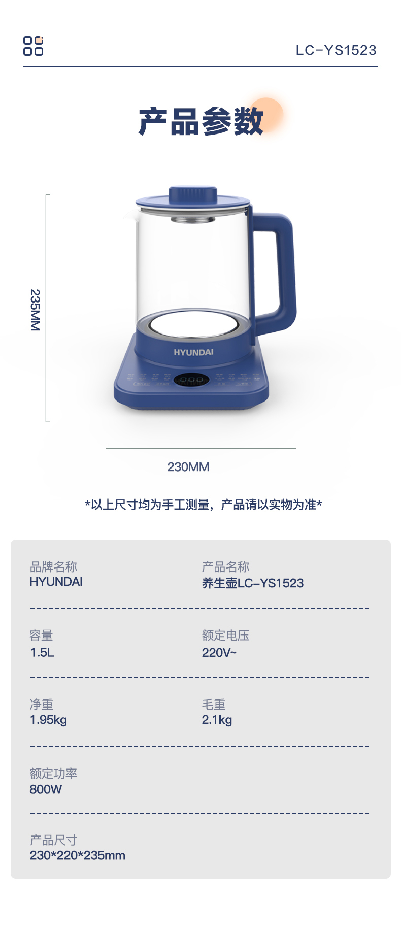 产品容量:1.5L;产品尺寸:230*220*235mm;