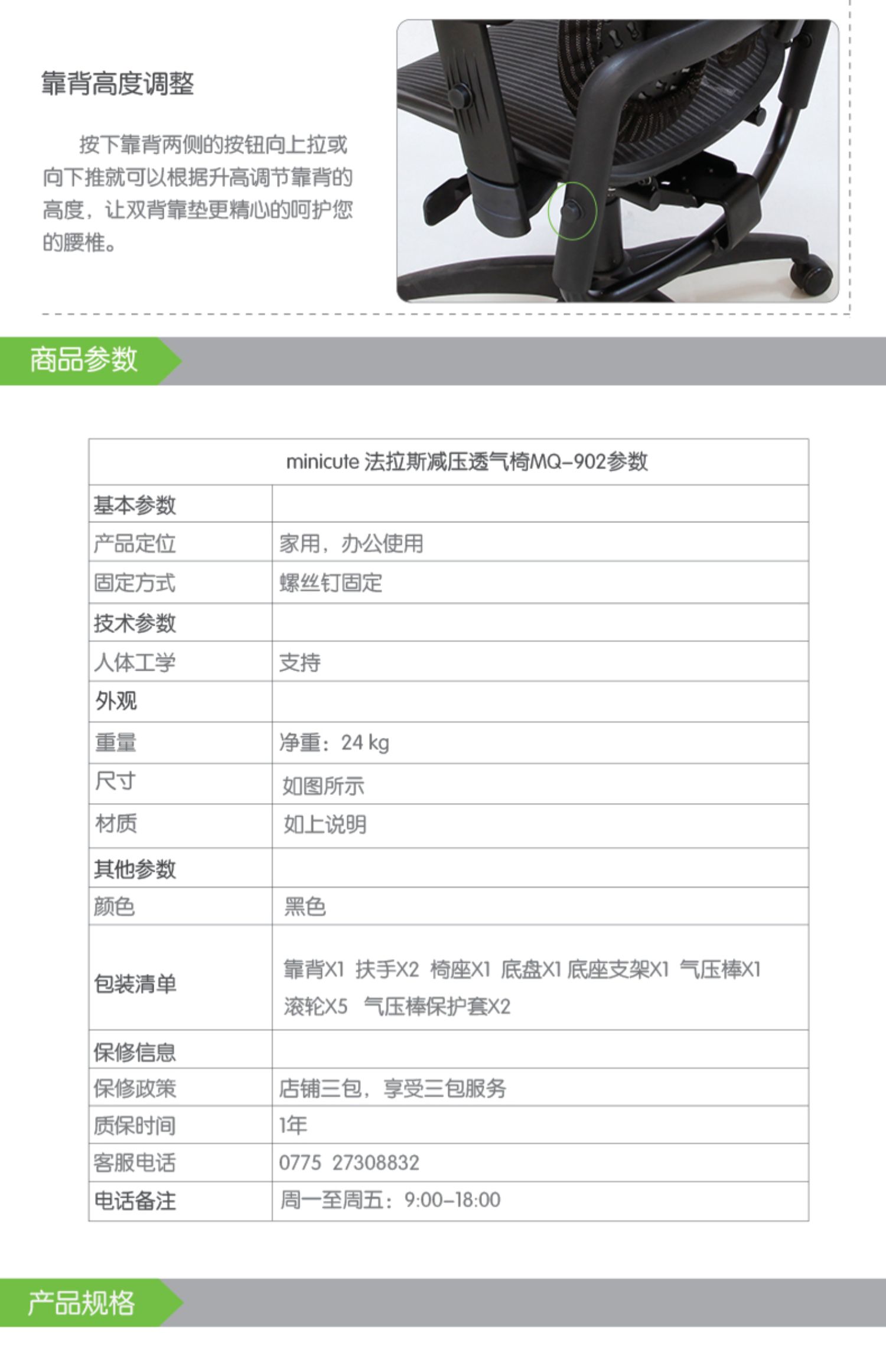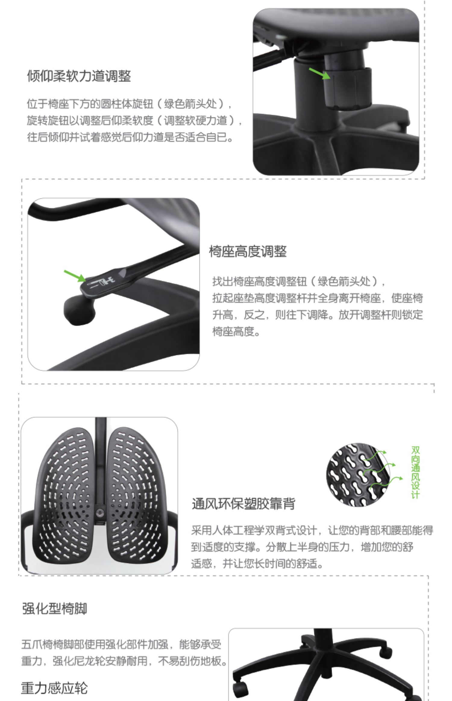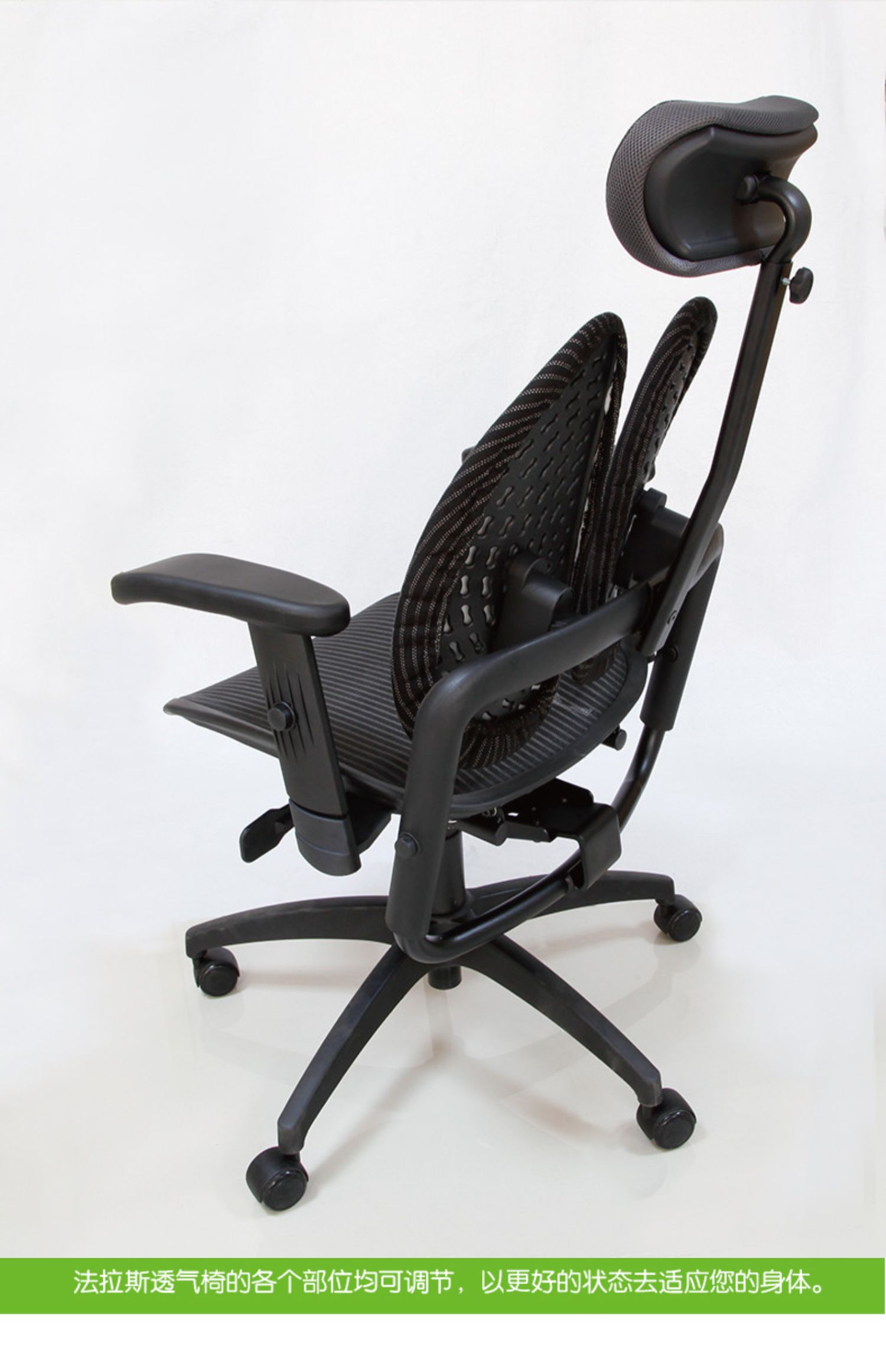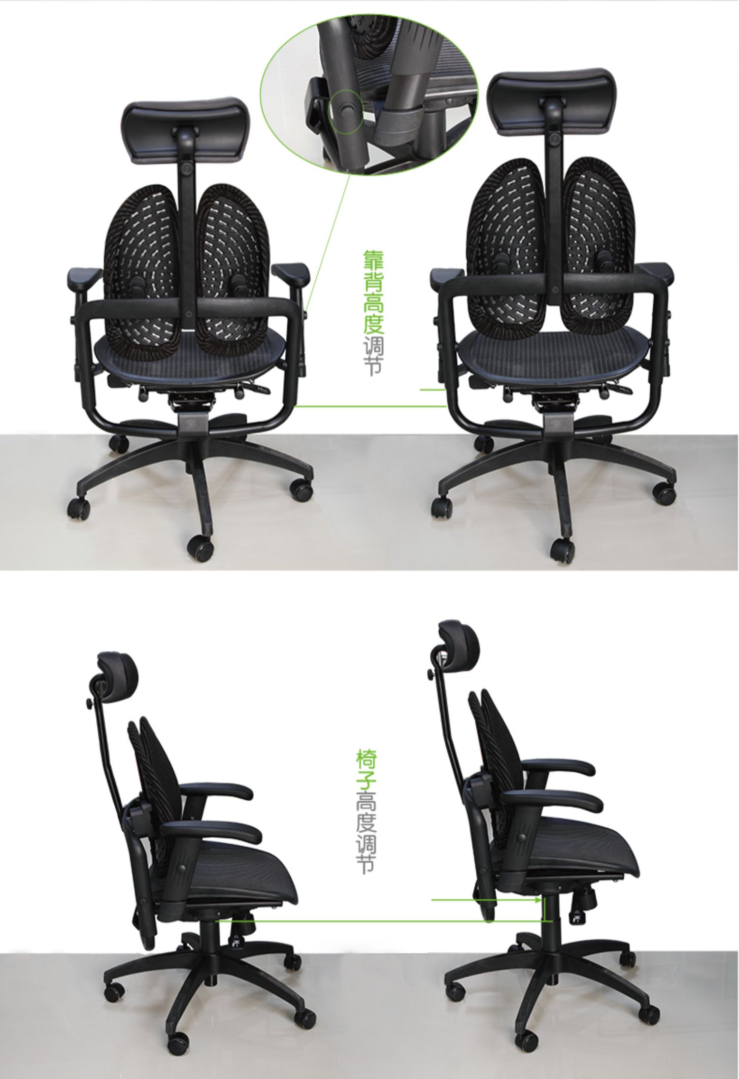1.加厚加大双背叶椅背设计,完全包裹背部,为背部提供有力支持; 2.多部位调节,座椅高度,扶手高度,头枕高度,椅背斜度均可调,体验更舒适; 3.强化型五爪椅脚,重力感应轮设计,抗压耐磨,静音耐用; 4.通气高弹性网布椅面,强韧通气,久坐不变形