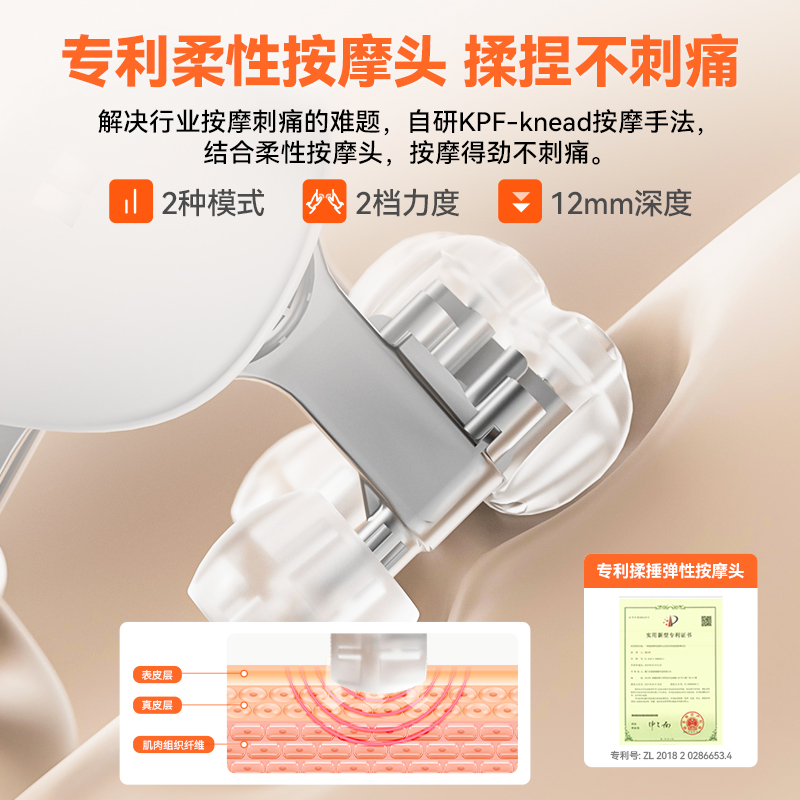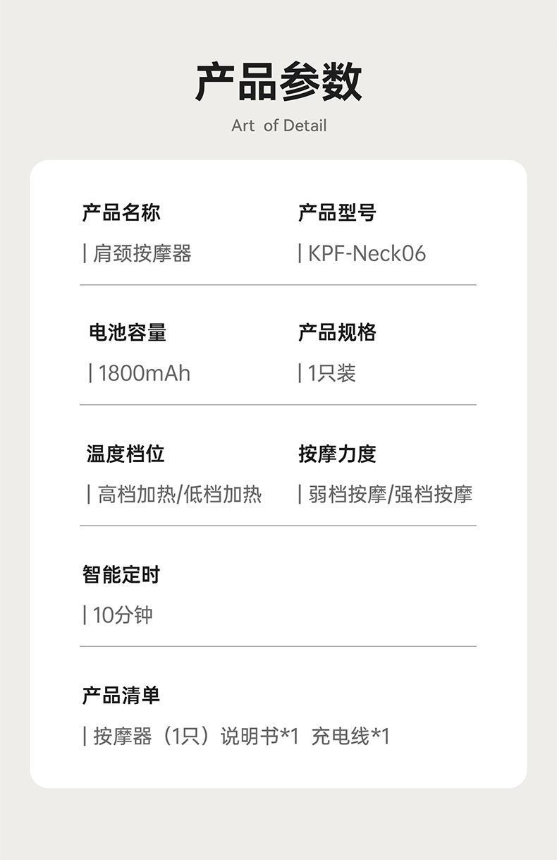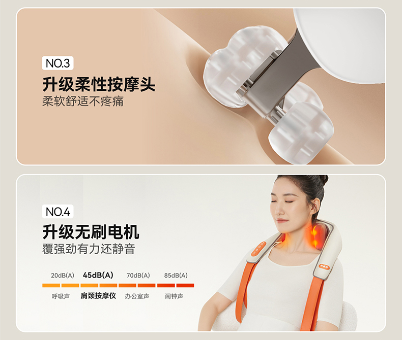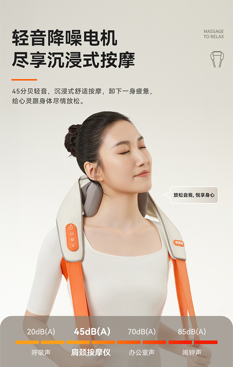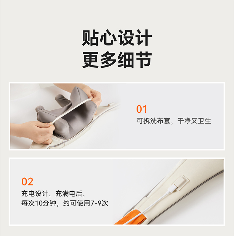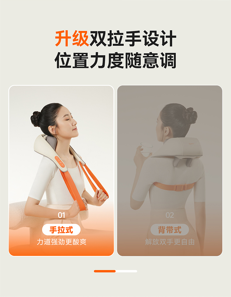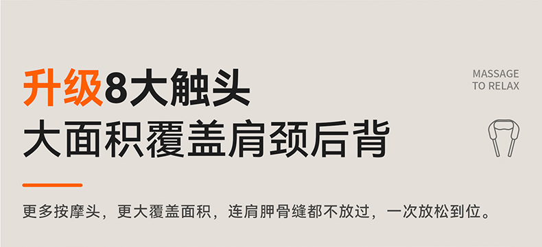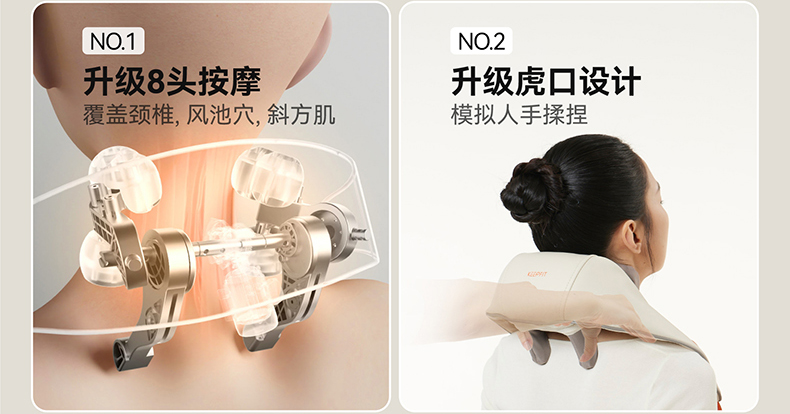 1、与倍轻松相同机芯,硅胶按摩头,材质柔软更舒适 2、8个按摩头,按摩面积更大,受力均匀,力度大 3、肩部位置宽9CM,胖瘦都可使用。 4、2档温度:高档47°,低挡:温度40° 5、充电约3.5H 使用时间约1.5小时 6、工作定时:10分钟 7、2档力度,有感无刷电机,带驱动板 8、2个模式:揉捏模式,脉冲按摩模式