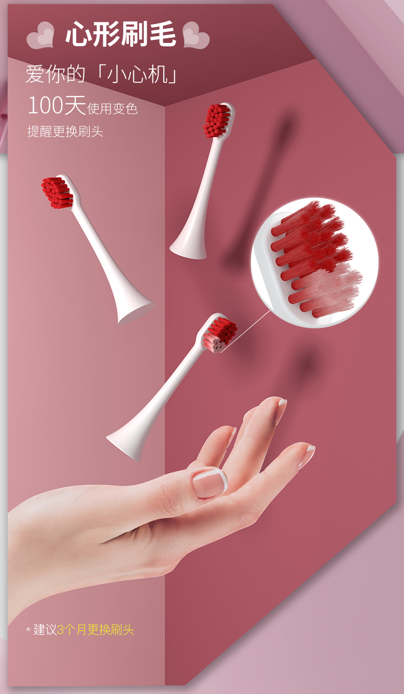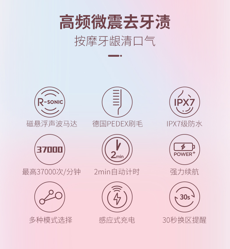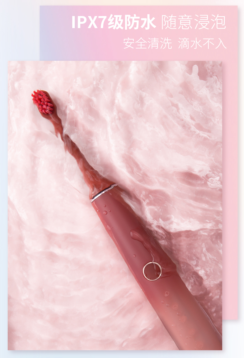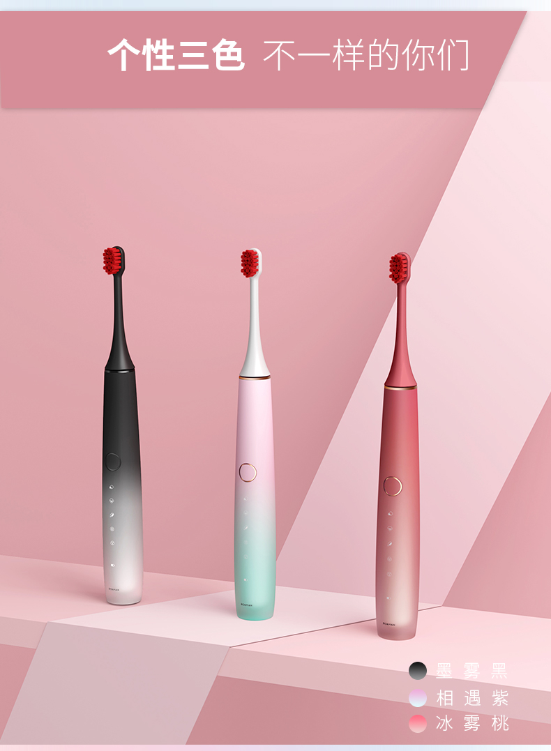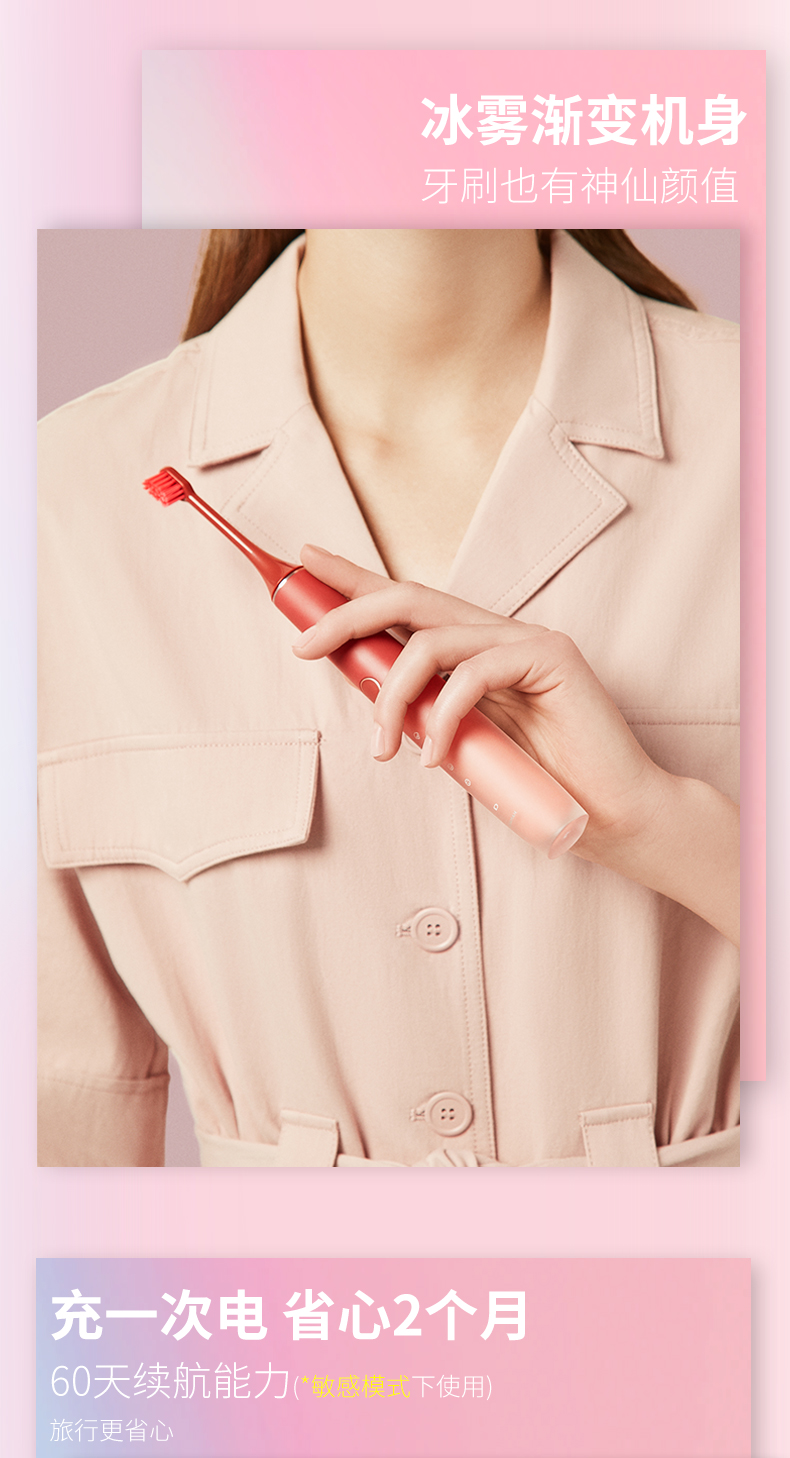 冰雾渐变机身,潮酷吸睛外观, 刷牙洗脸二合一 德国PEDEX心型变色刷毛,一百天提醒更换 国内领先磁悬浮马达,振动频率最高可达3700次/分钟 五种刷牙洁面模式:清洁/亮白/敏感/洁面/按摩 IPX7级防水,全身可水洗 3种刷头五种功能:美白、护龈、洁面一机到位 感应充电方式,充电一次续航60天