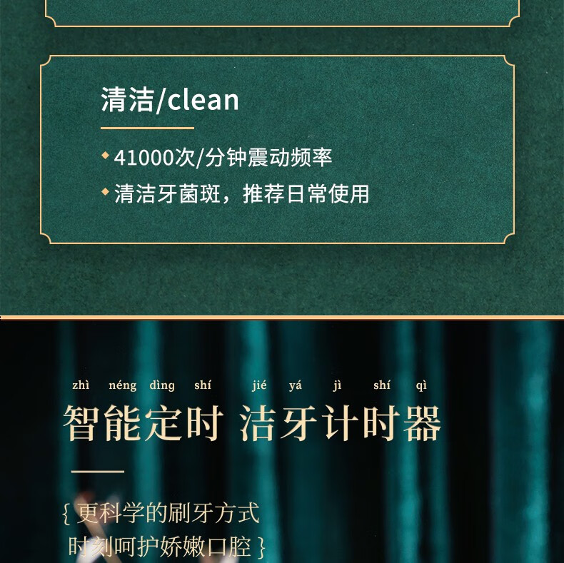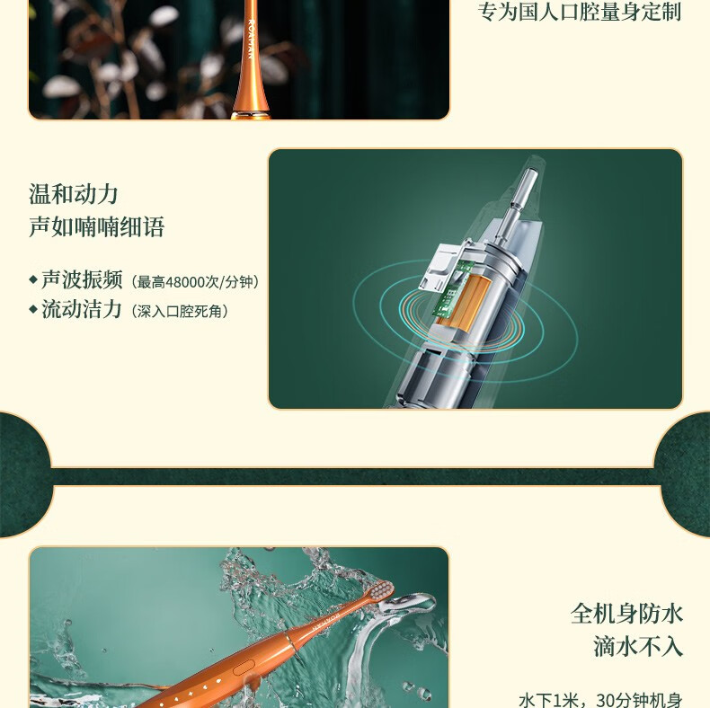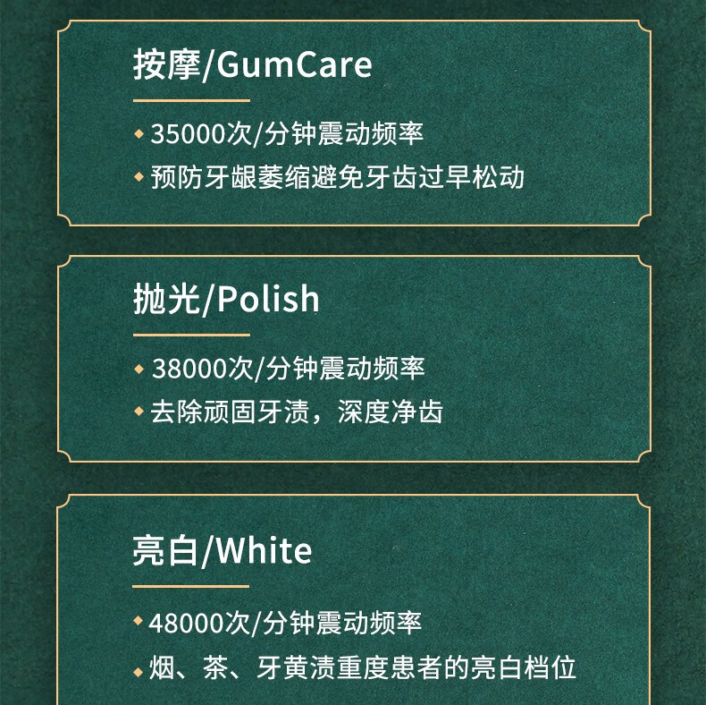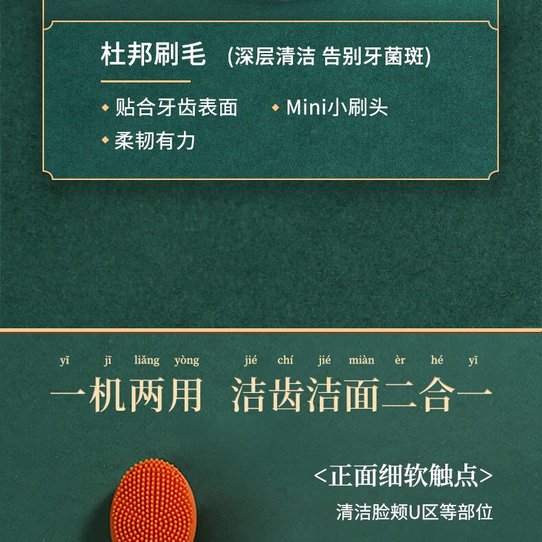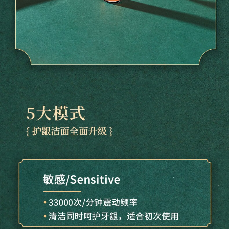 31000-48000次/分钟声波震动可调 5种模式任意切换,2min自动计时,30s自动换区 拥有洁面仪功能,清洗脸颊鼻沟 IPX7级全身水洗,可淋浴 无线感应充电 ,超长续航60天