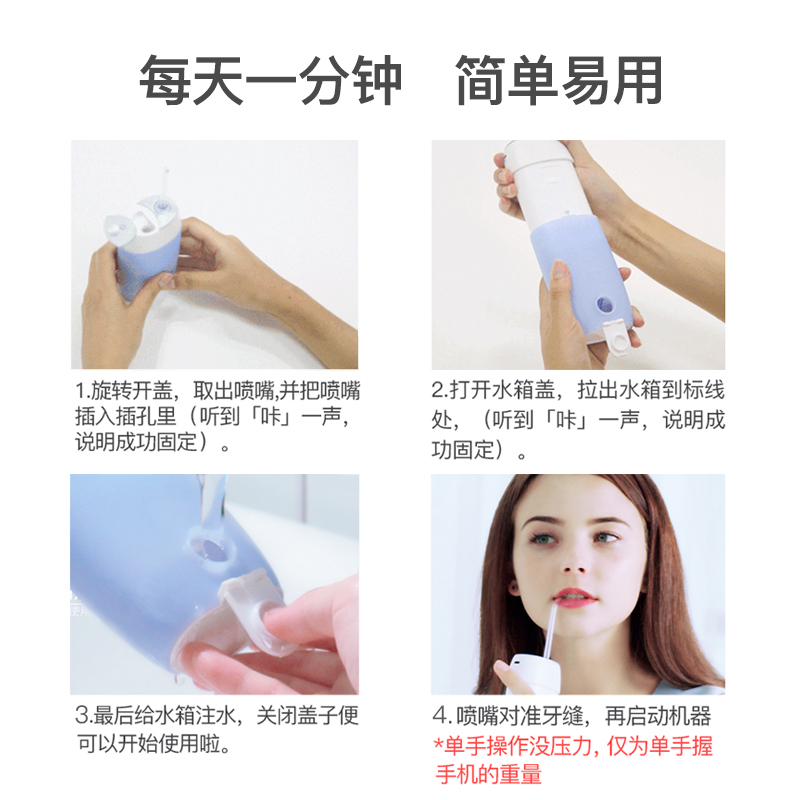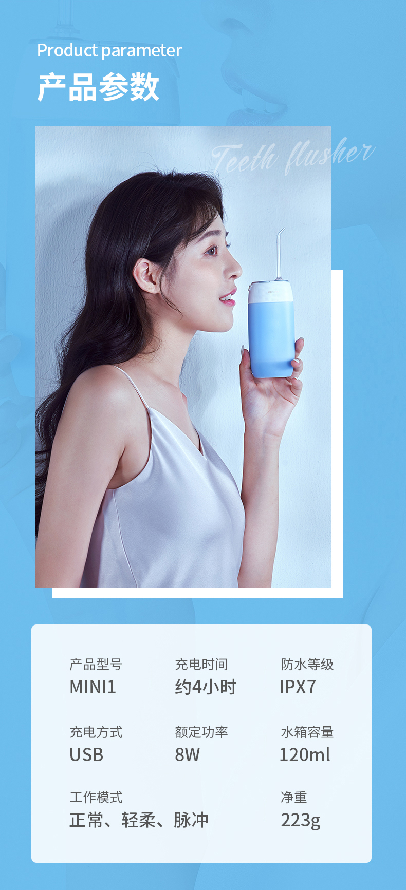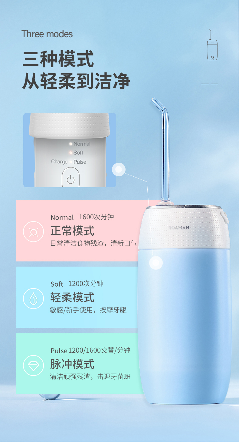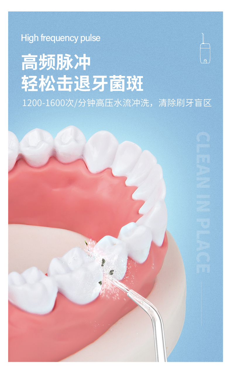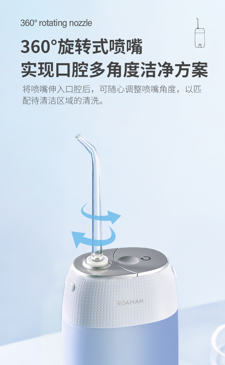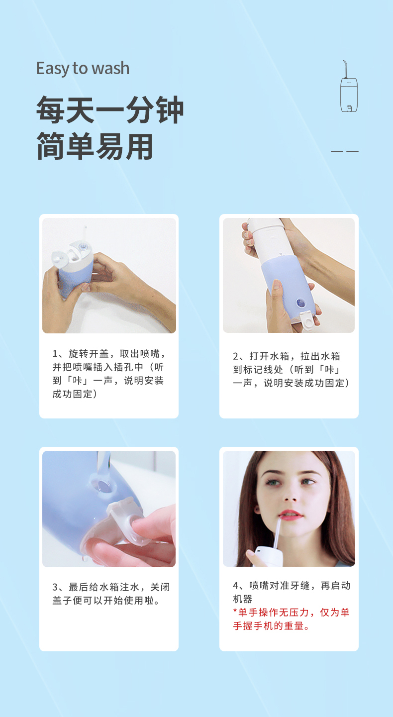 1.3种模式(标准|轻柔|脉冲) 2.1600次/分高频脉冲高效洁力 3.360°可旋转喷嘴、 FDA食品级材质,1分钟智能计时 4.120ml迷你水箱,小巧适用 5.IPX7级全身水洗设计,通用USB充电接口 6.110-240V全球通用电压,充电随行,旅行无忧 7.30天超长续航时间