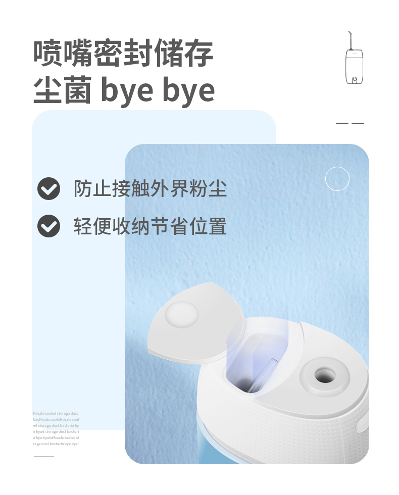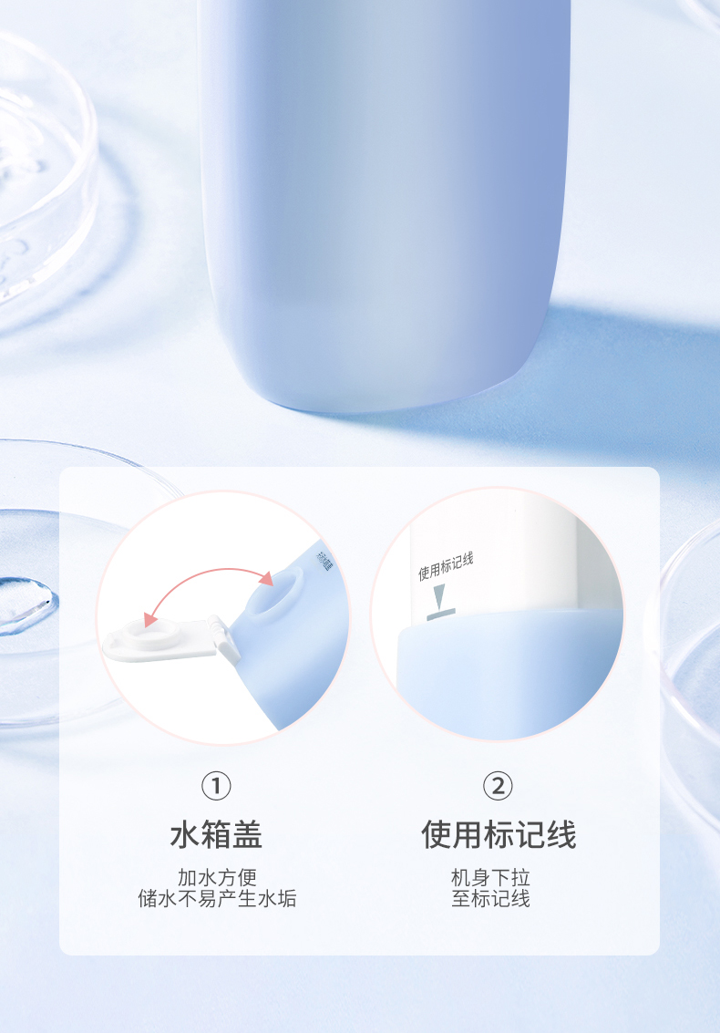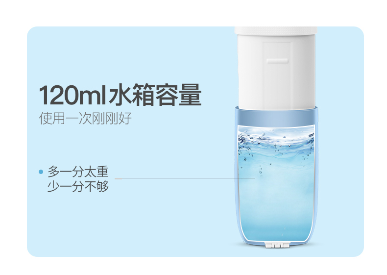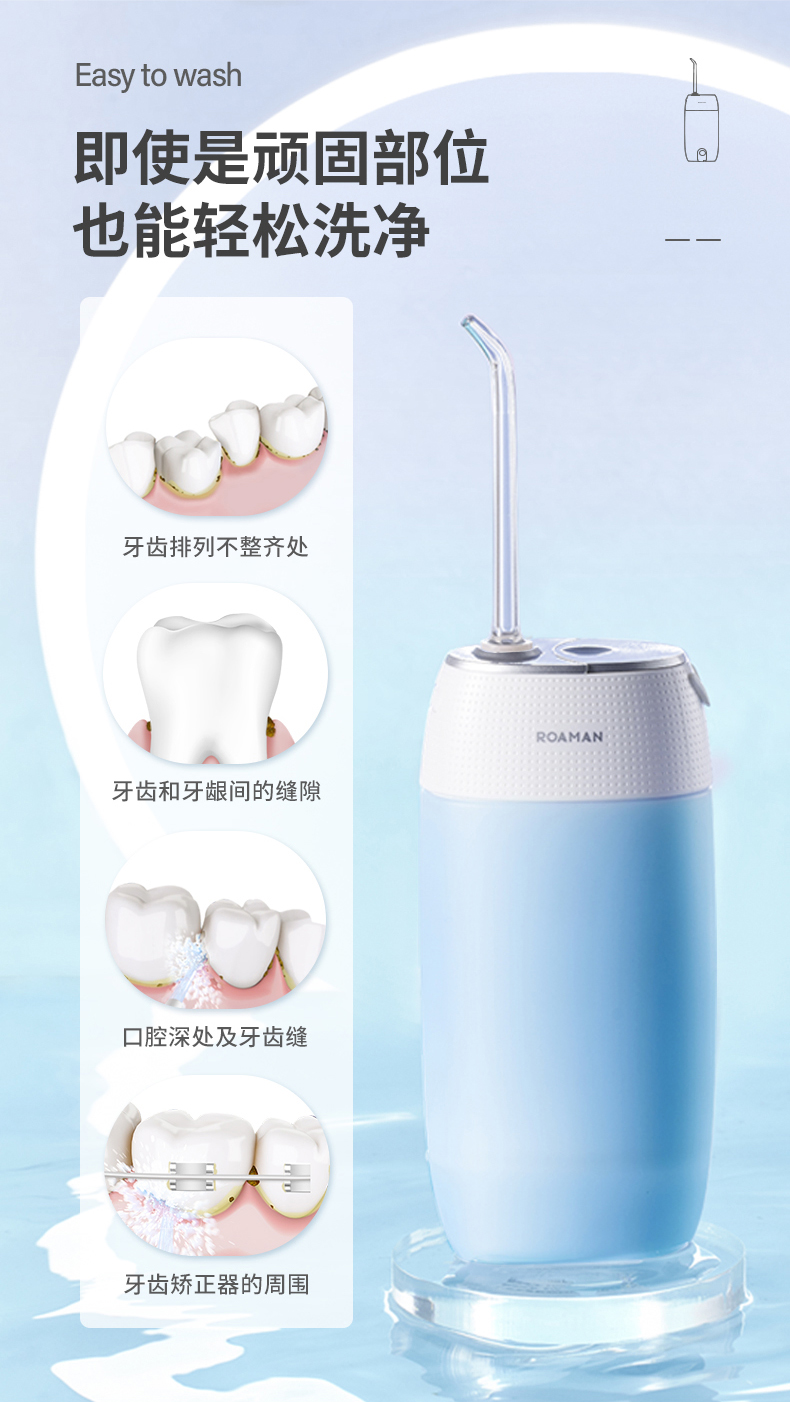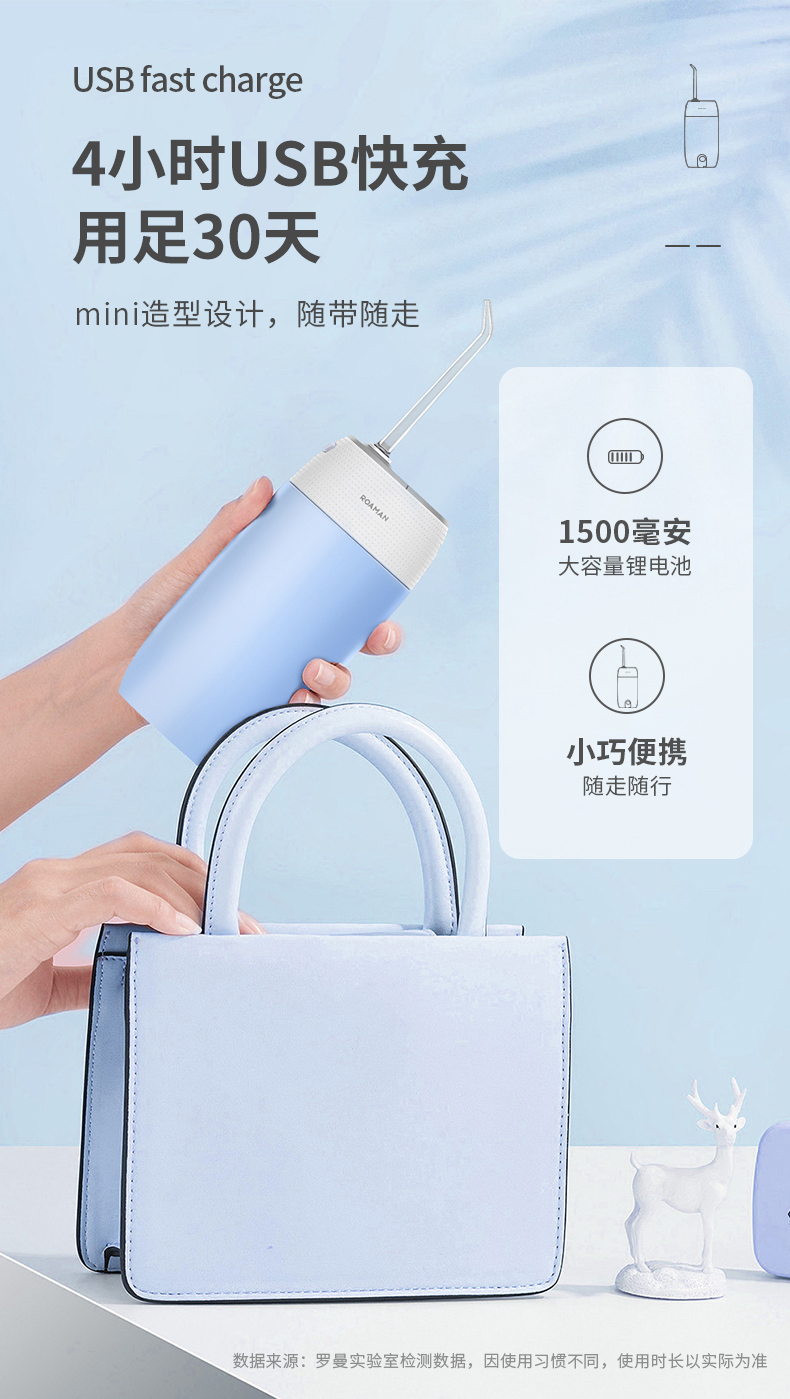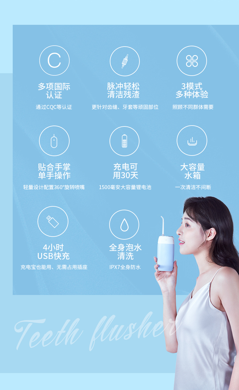 1.3种模式(标准|轻柔|脉冲) 2.1600次/分高频脉冲高效洁力 3.360°可旋转喷嘴、 FDA食品级材质,1分钟智能计时 4.120ml迷你水箱,小巧适用 5.IPX7级全身水洗设计,通用USB充电接口 6.110-240V全球通用电压,充电随行,旅行无忧 7.30天超长续航时间