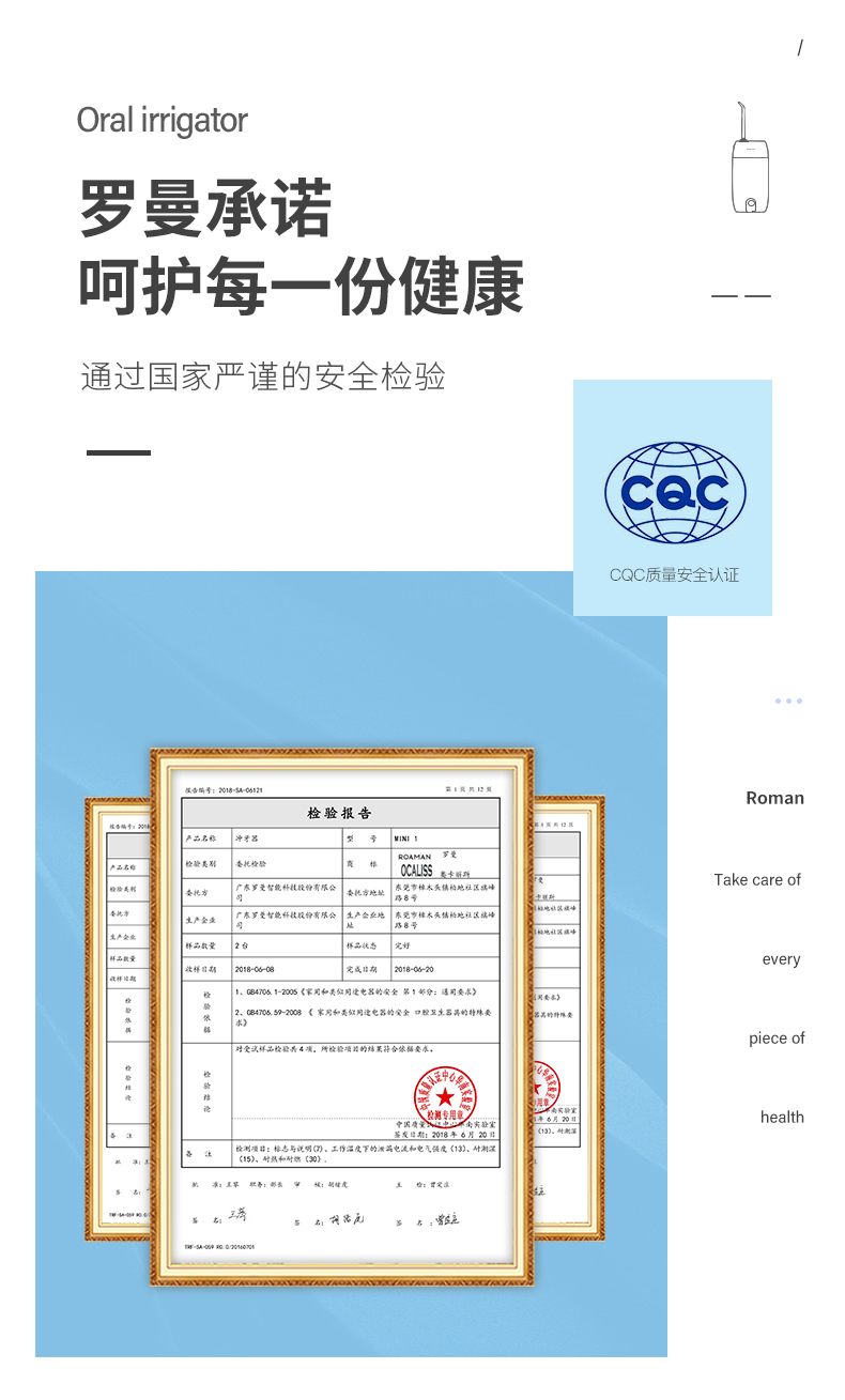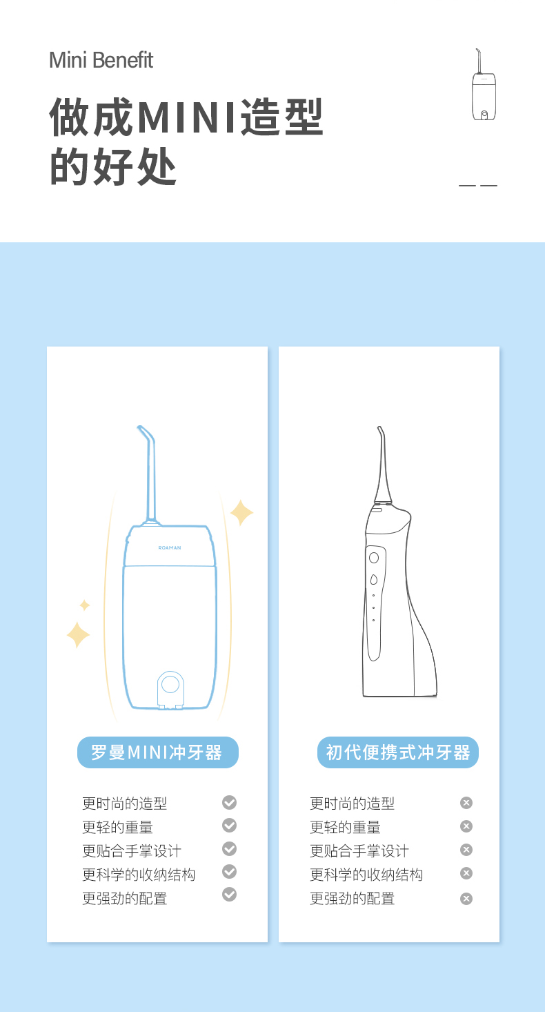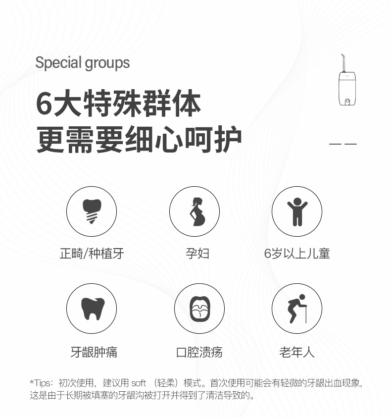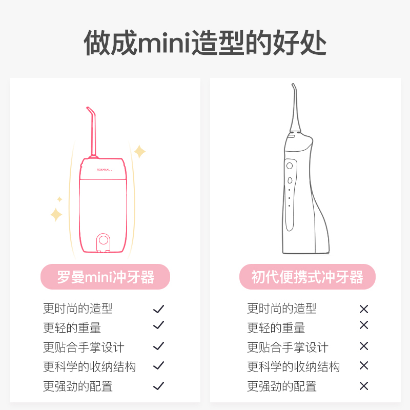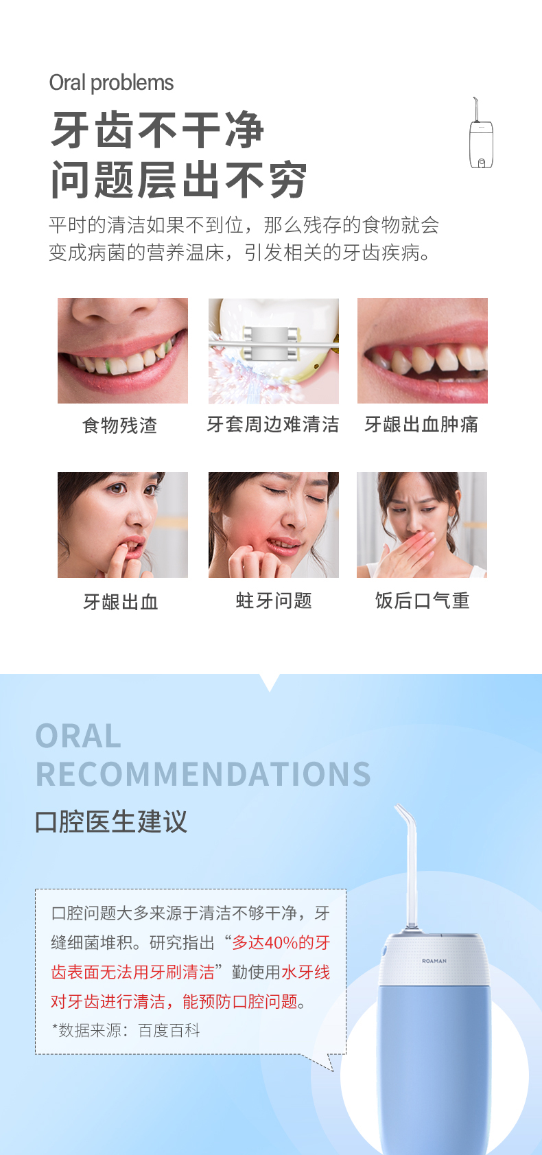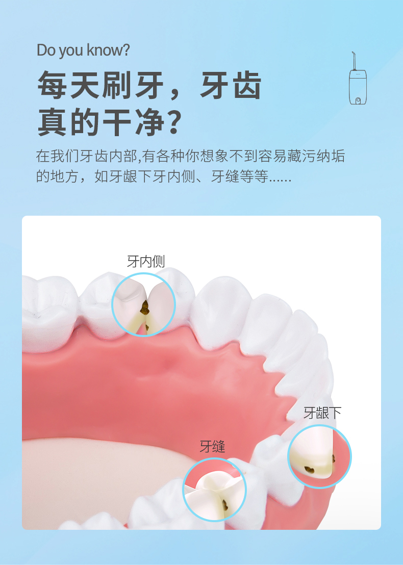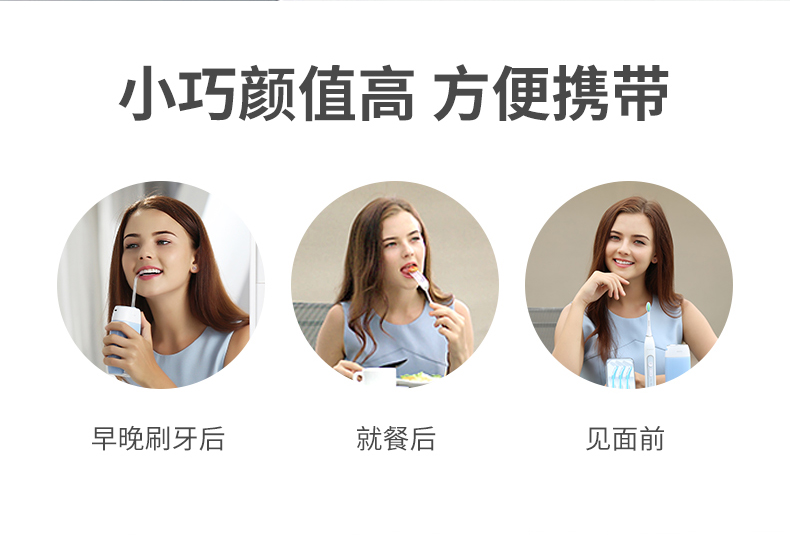 1.3种模式(标准|轻柔|脉冲) 2.1600次/分高频脉冲高效洁力 3.360°可旋转喷嘴、 FDA食品级材质,1分钟智能计时 4.120ml迷你水箱,小巧适用 5.IPX7级全身水洗设计,通用USB充电接口 6.110-240V全球通用电压,充电随行,旅行无忧 7.30天超长续航时间