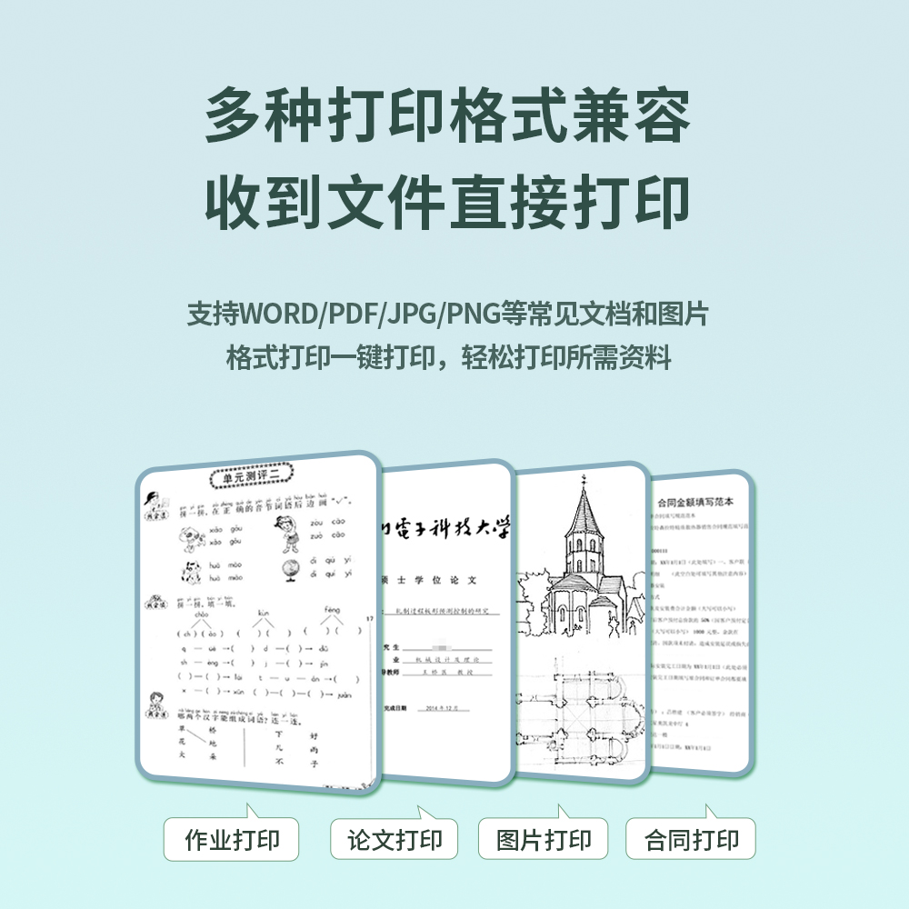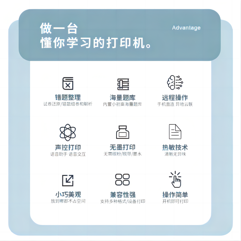 无墨打印,耗材只要热敏纸,打印更环保 高速打印,打印一张A4文档仅需3秒 WIFI连接,远程异地打印,随时随地都可打印 内置丰富学习资源,全国真题试卷一应俱全 自动裁切,每一份文件整齐干净 一机两用,拍题搜题,举一反三,错题再也不用手抄,提高学习效率
