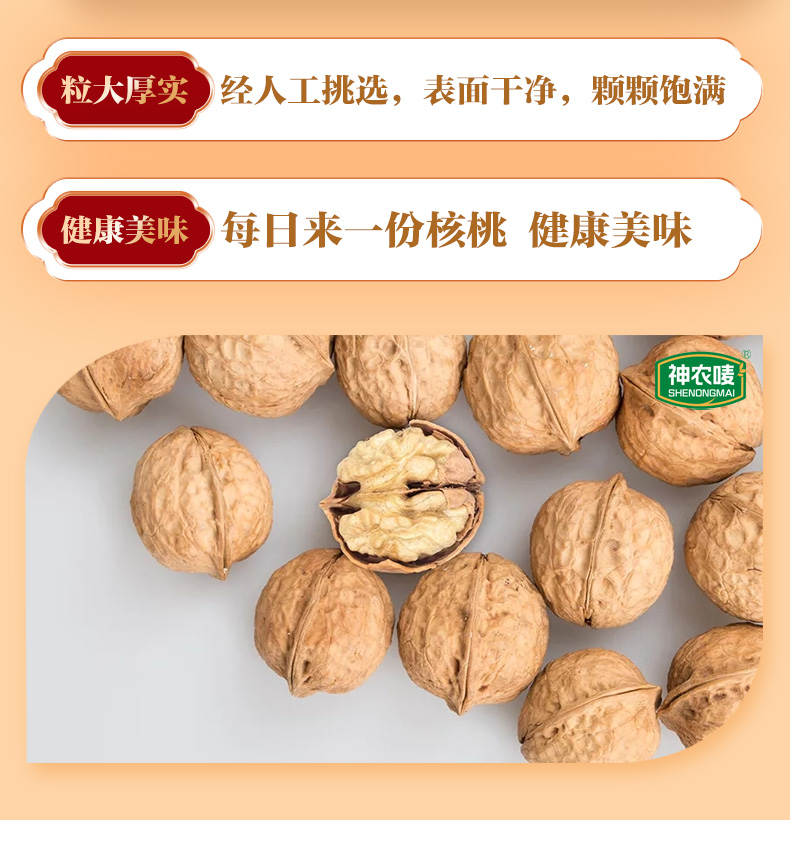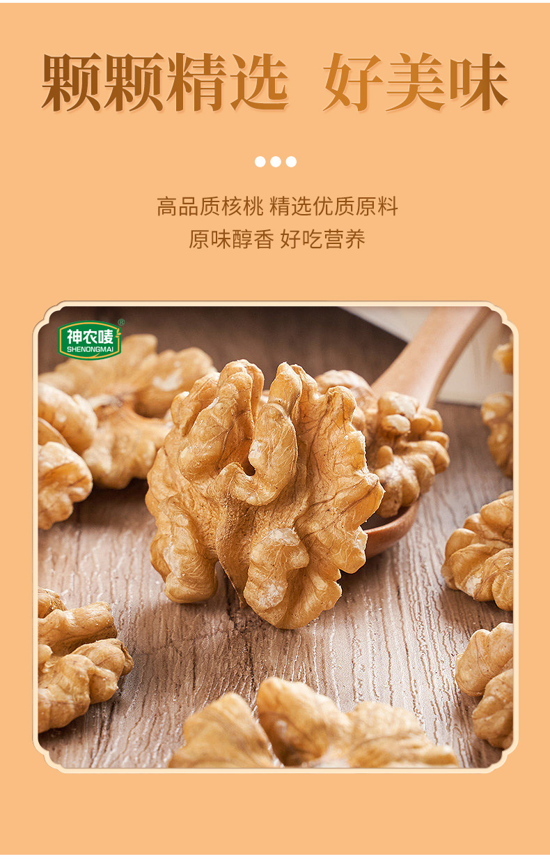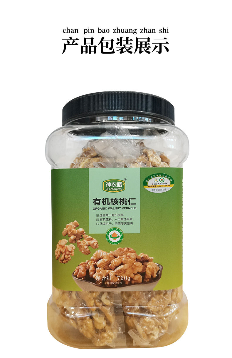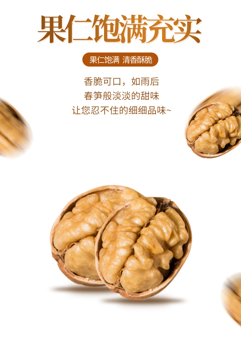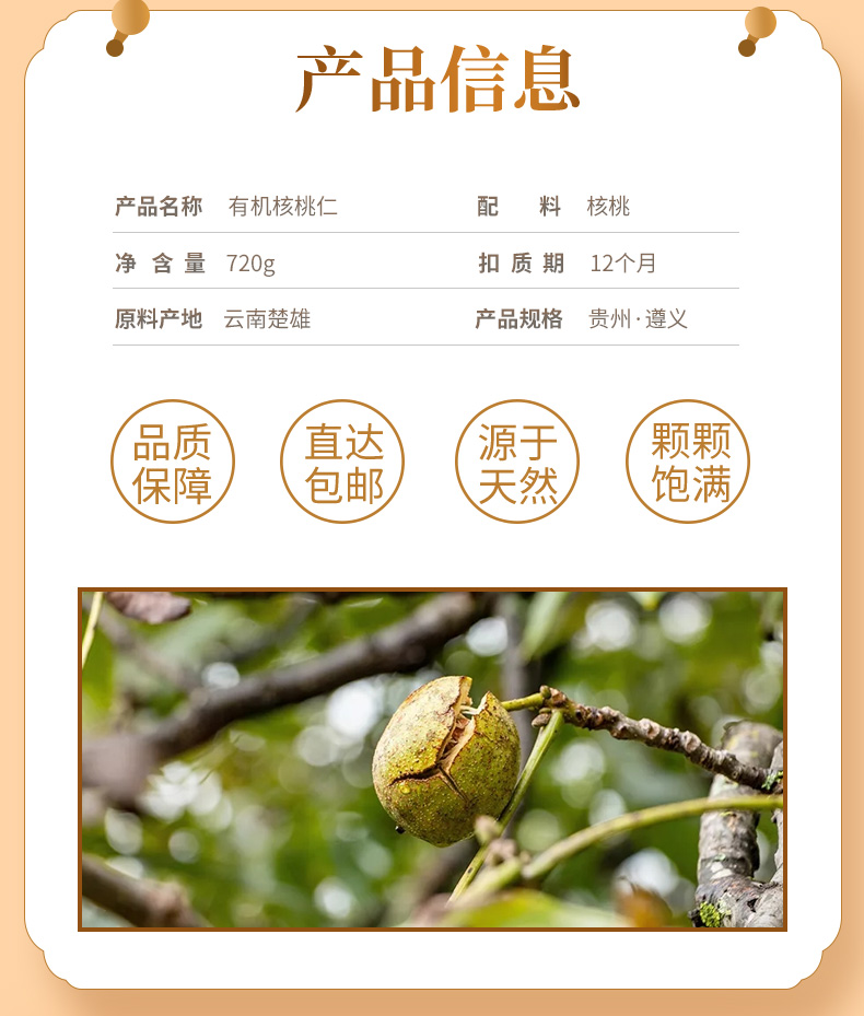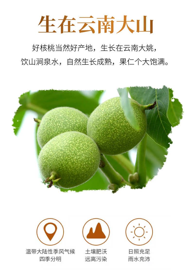 原料产地贵州、云南有机种植基地的薄壳核桃、果粒均一,无苦不涩、清香回甜。