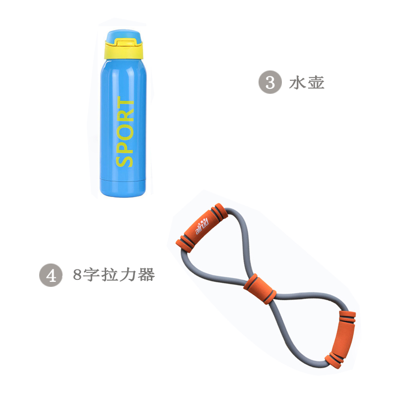 产品说明:跳绳1条、8字拉力器1条、护腕一对,头带1条、杯子一个、防水包一个产品介绍:包装采用牛津布可多次反复使用方便携带,全套的简易健身器材,为您的生活增添更多的快乐!