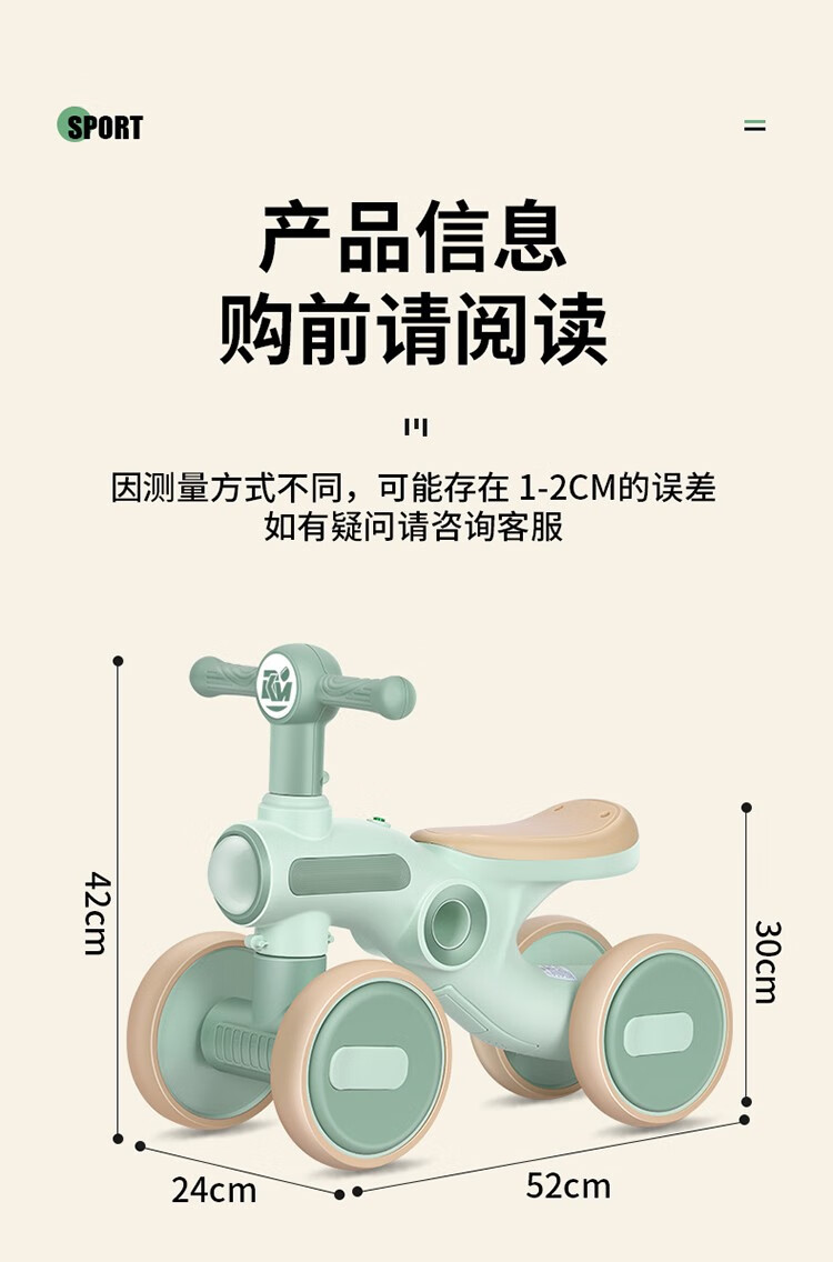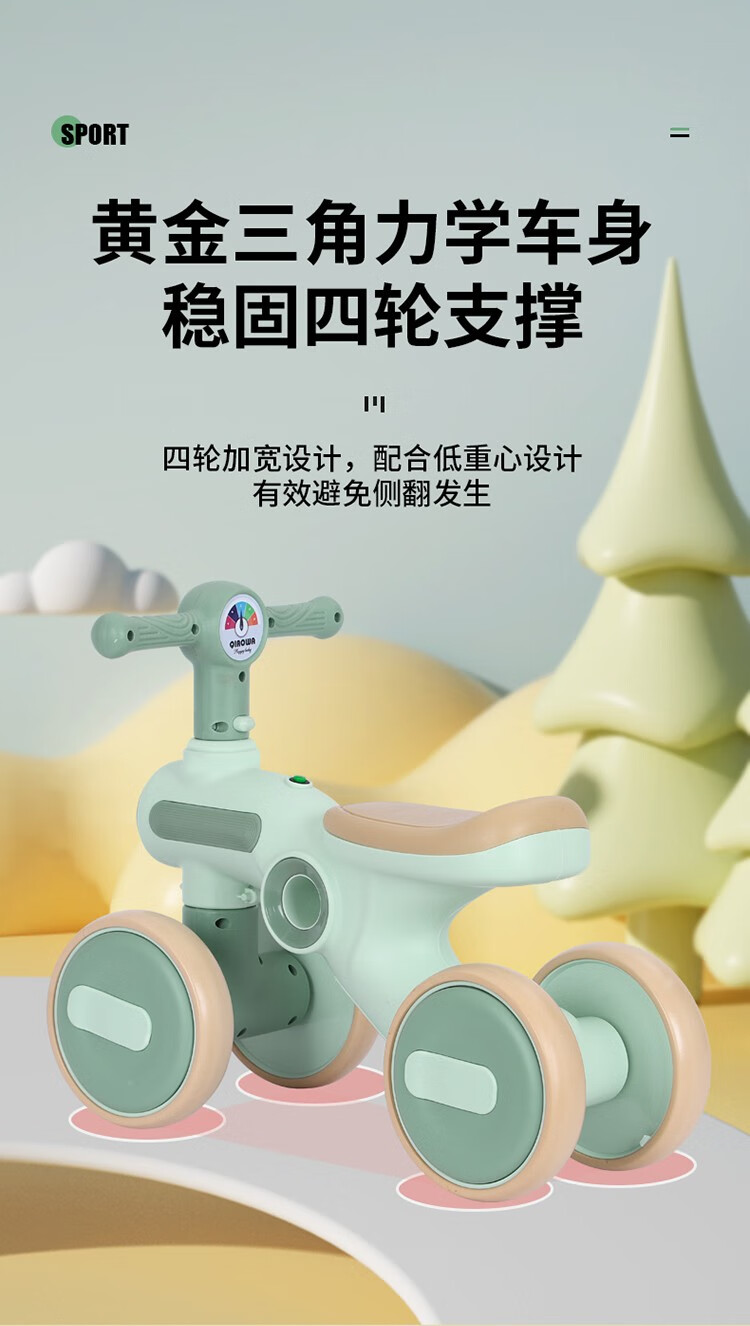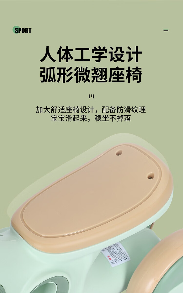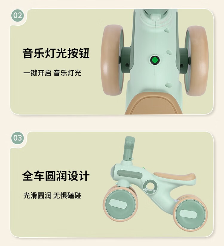 整车快装,整车环保材质,音乐 灯光,高音质铁喇叭,限位转向,镭射贴花,马卡龙配色,电镀车标,弧形舒适座椅,环保高密度EVA发泡轮。