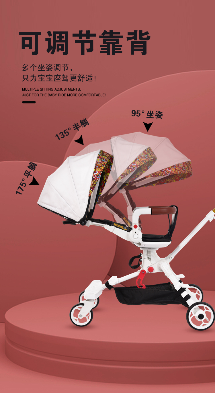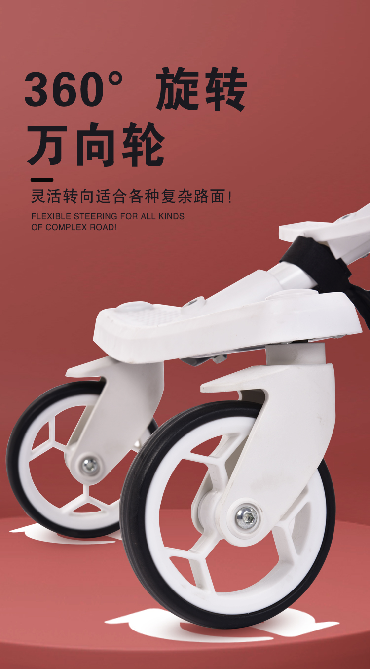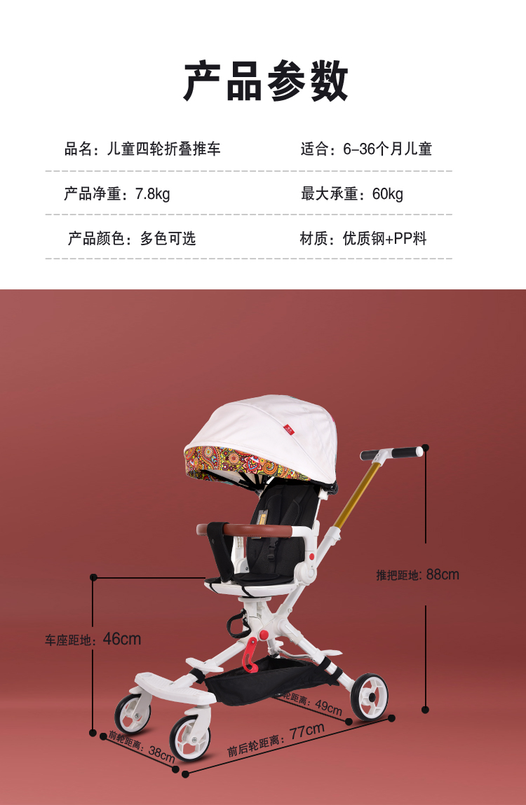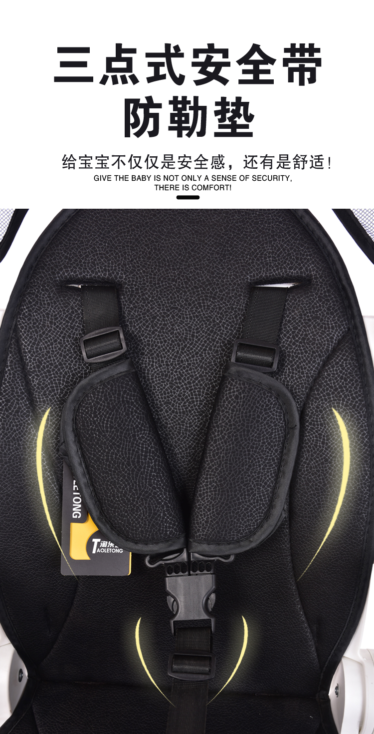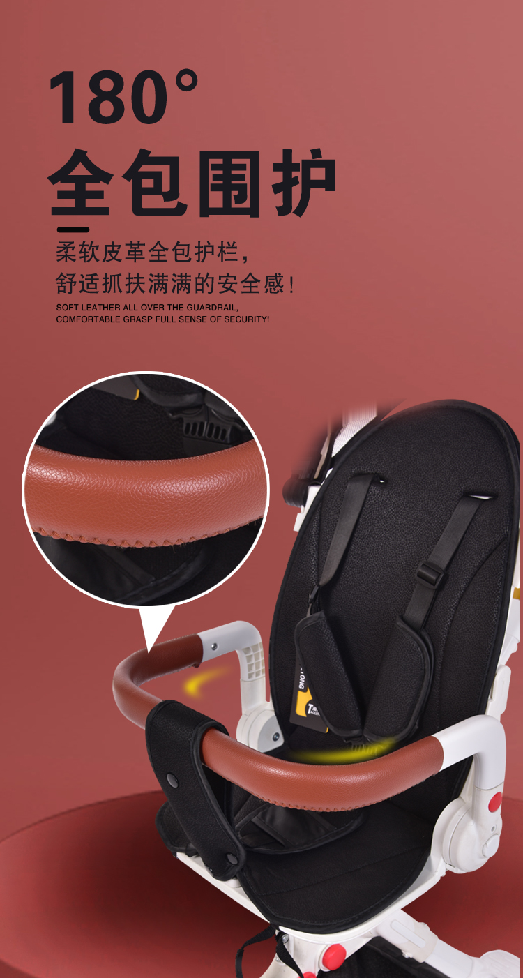 车身采用高碳钢车架,稳固安全;加宽发泡实心轮胎 ,减震防滑,适应各种路况路面;170度三个档位前后可躺宝宝坐累了也能休息一下适应宝宝不同年龄段使用;高景观座椅,骑乘舒适