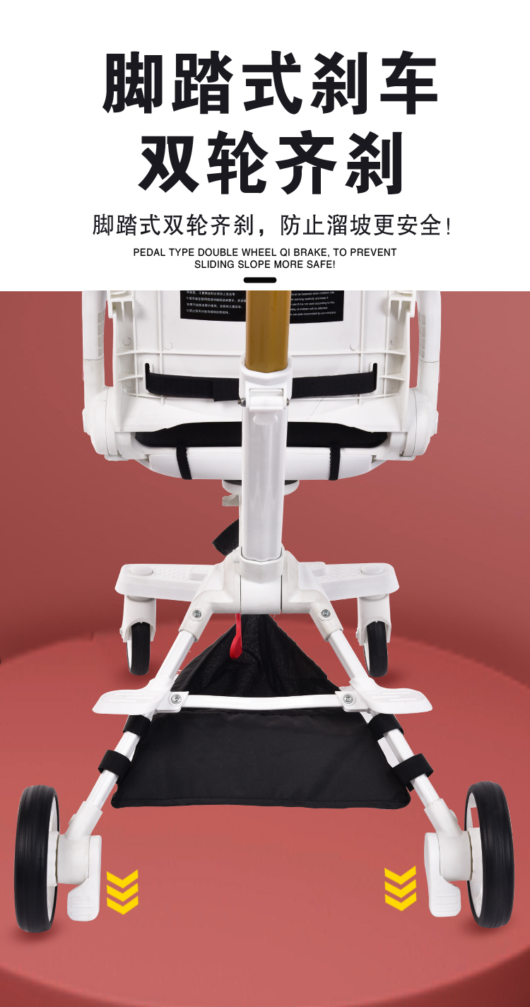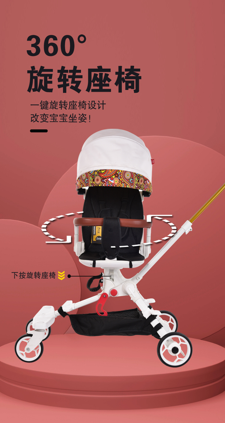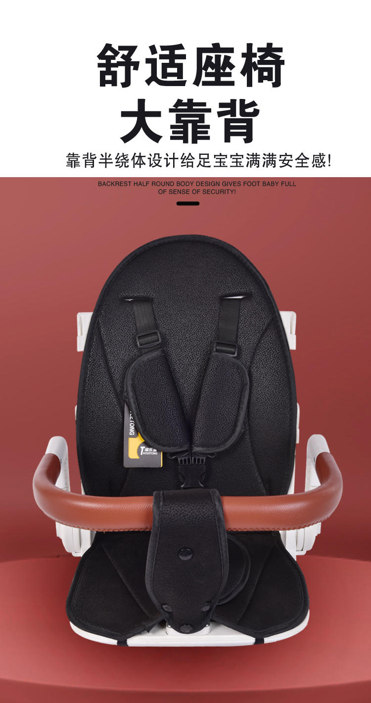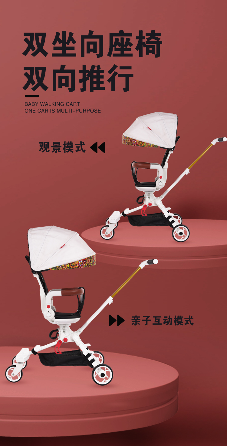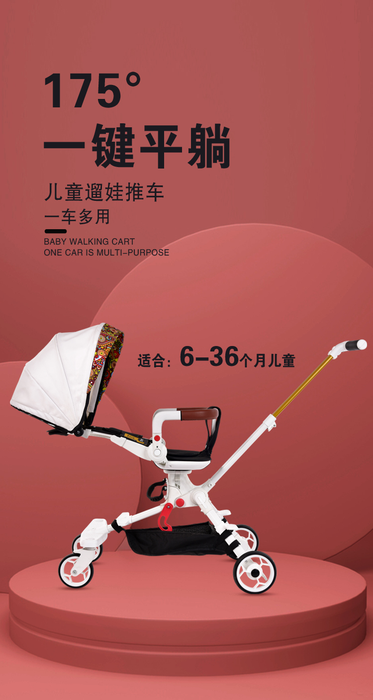 车身采用高碳钢车架,稳固安全;加宽发泡实心轮胎 ,减震防滑,适应各种路况路面;170度三个档位前后可躺宝宝坐累了也能休息一下适应宝宝不同年龄段使用;高景观座椅,骑乘舒适