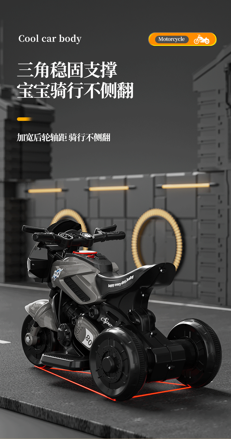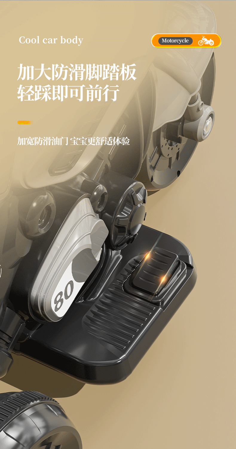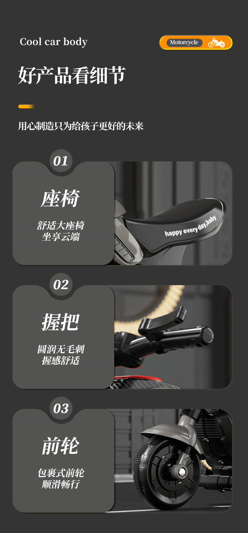 内置多首儿童歌曲、人性化舒适座椅设计,加宽加大,有效增加宝宝的舒适感,内置灯光音乐让宝宝童趣无限,快乐成长,方向盘环保材质制作,边缘设计,保护宝宝嫩嫩的小手不受伤害,防滑静音轮,适合各种不同路况