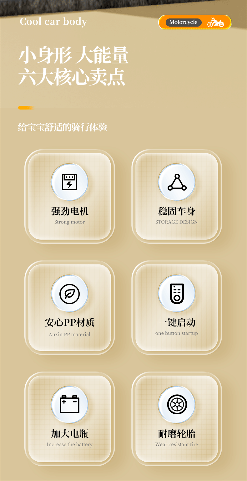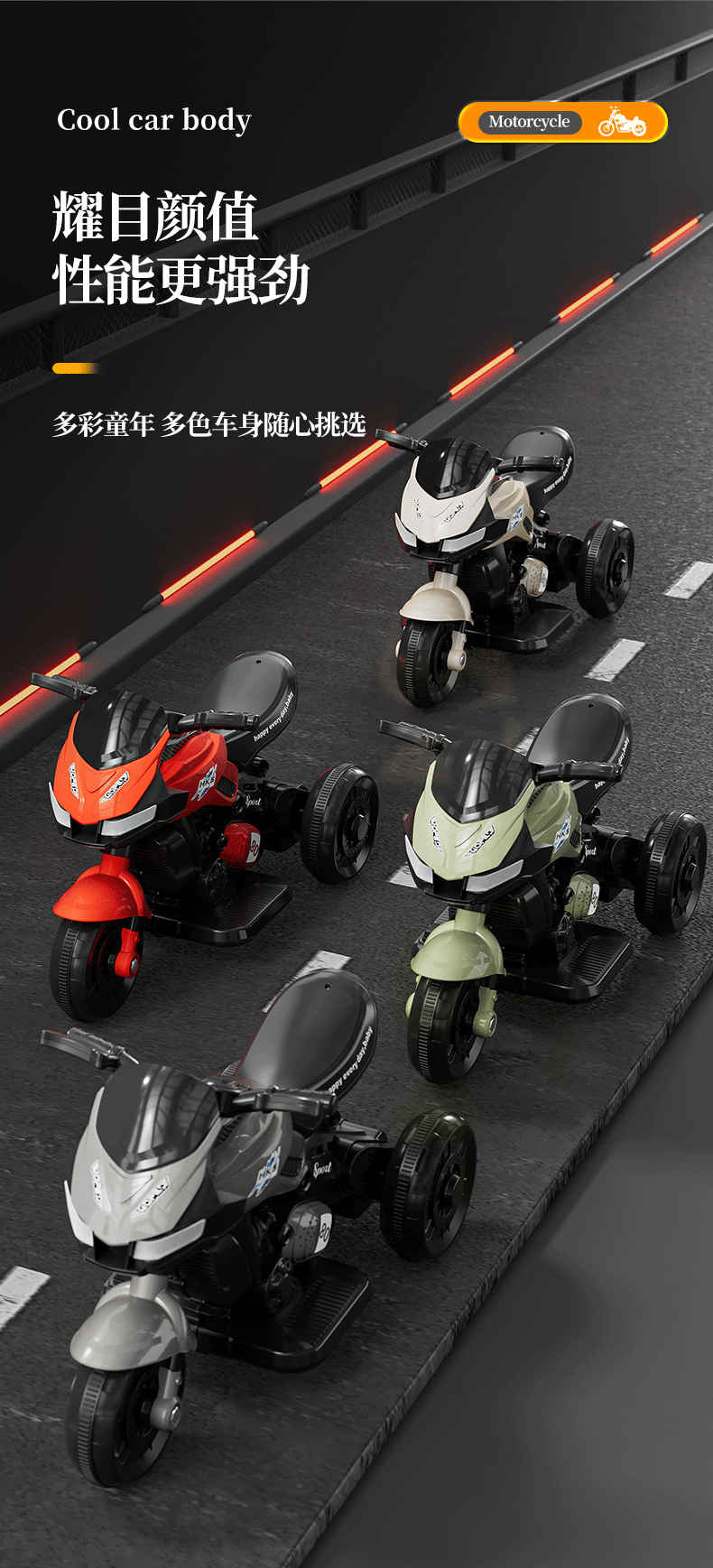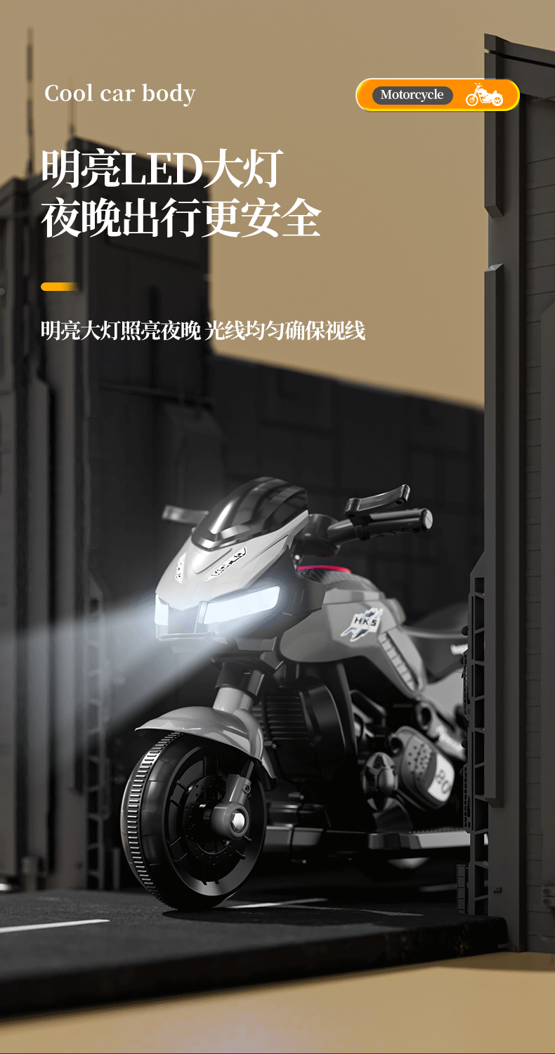 内置多首儿童歌曲、人性化舒适座椅设计,加宽加大,有效增加宝宝的舒适感,内置灯光音乐让宝宝童趣无限,快乐成长,方向盘环保材质制作,边缘设计,保护宝宝嫩嫩的小手不受伤害,防滑静音轮,适合各种不同路况