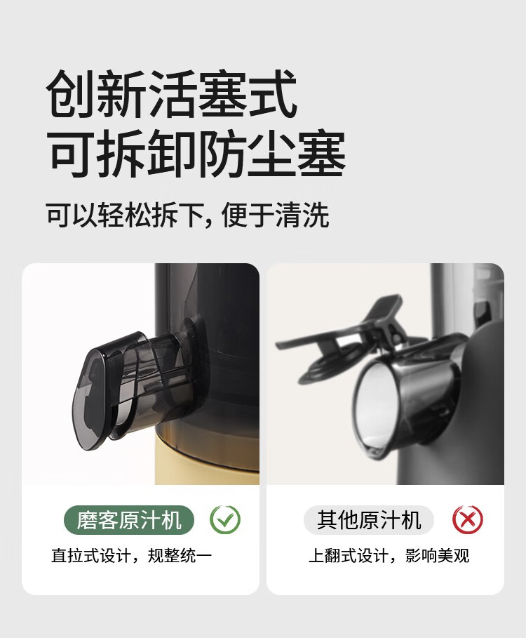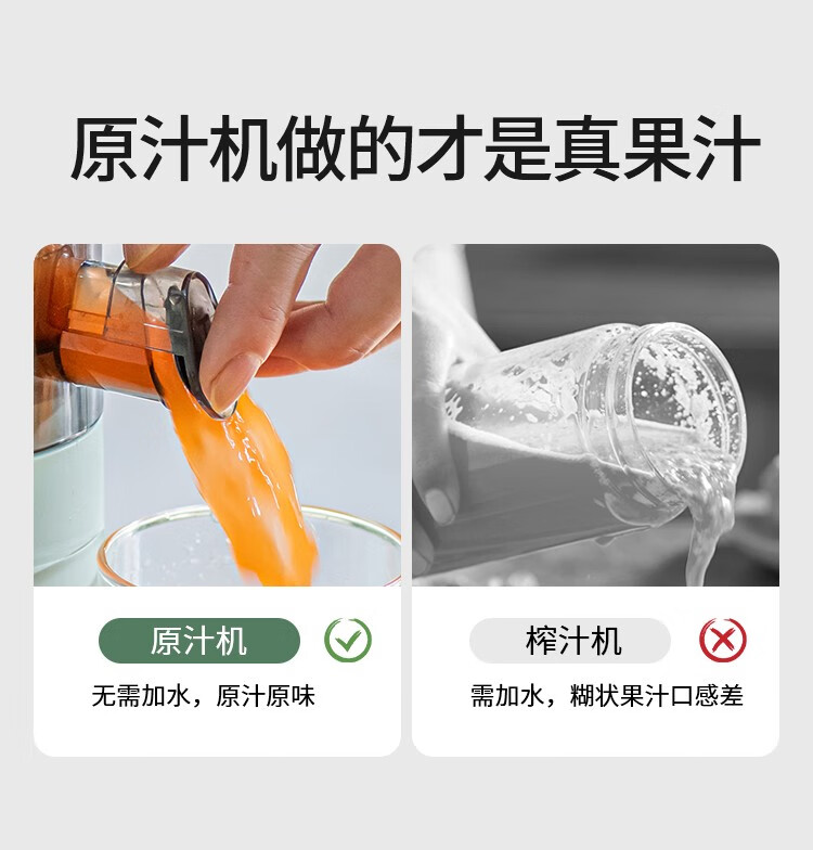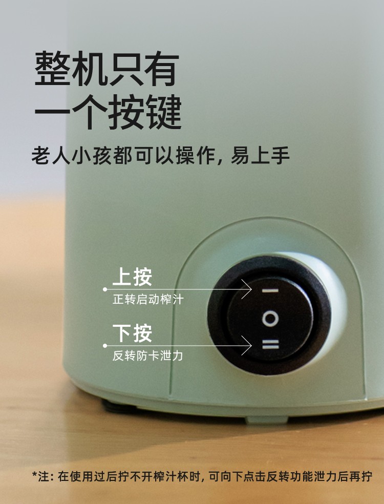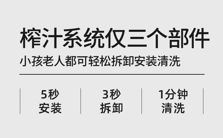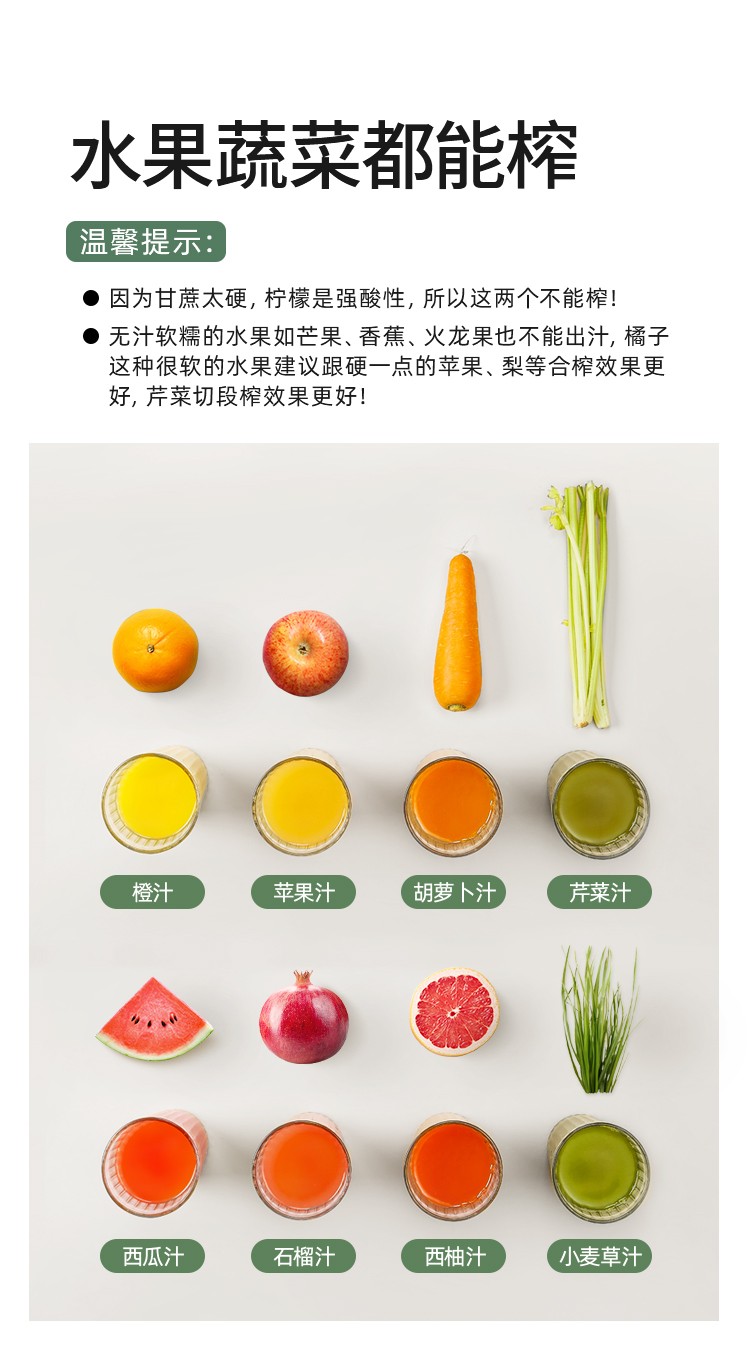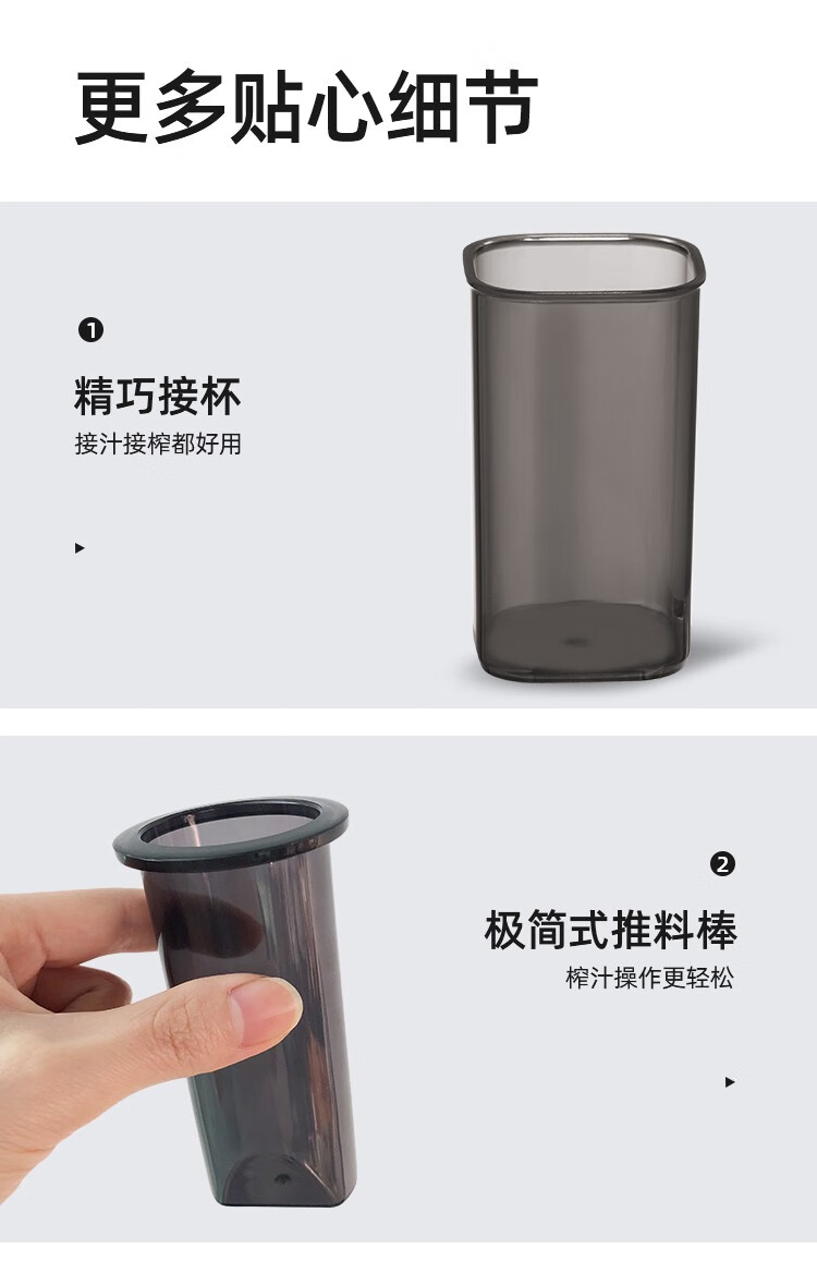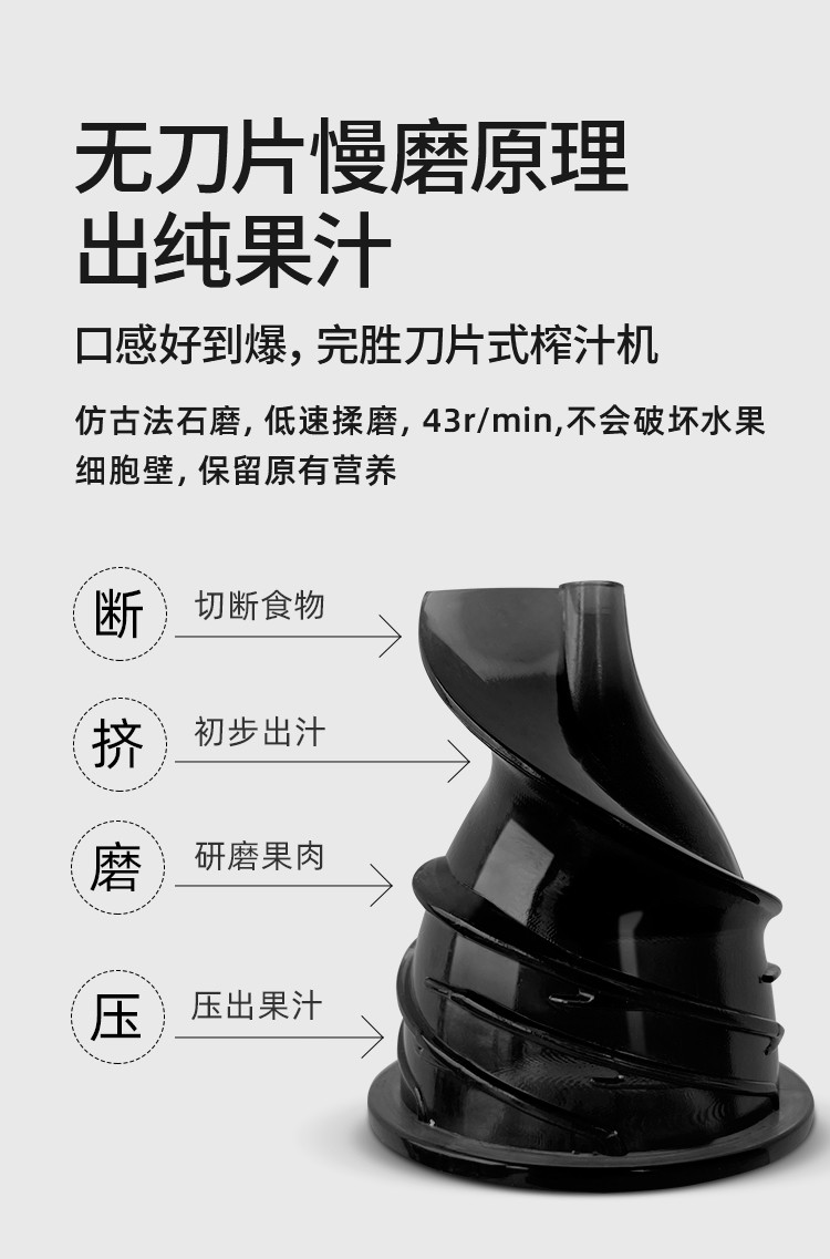 外观小巧,颜值超高,小机身有大能量,不占地,收纳及拆装非常简单,解决传统大型原汁机占位置及太重的问题