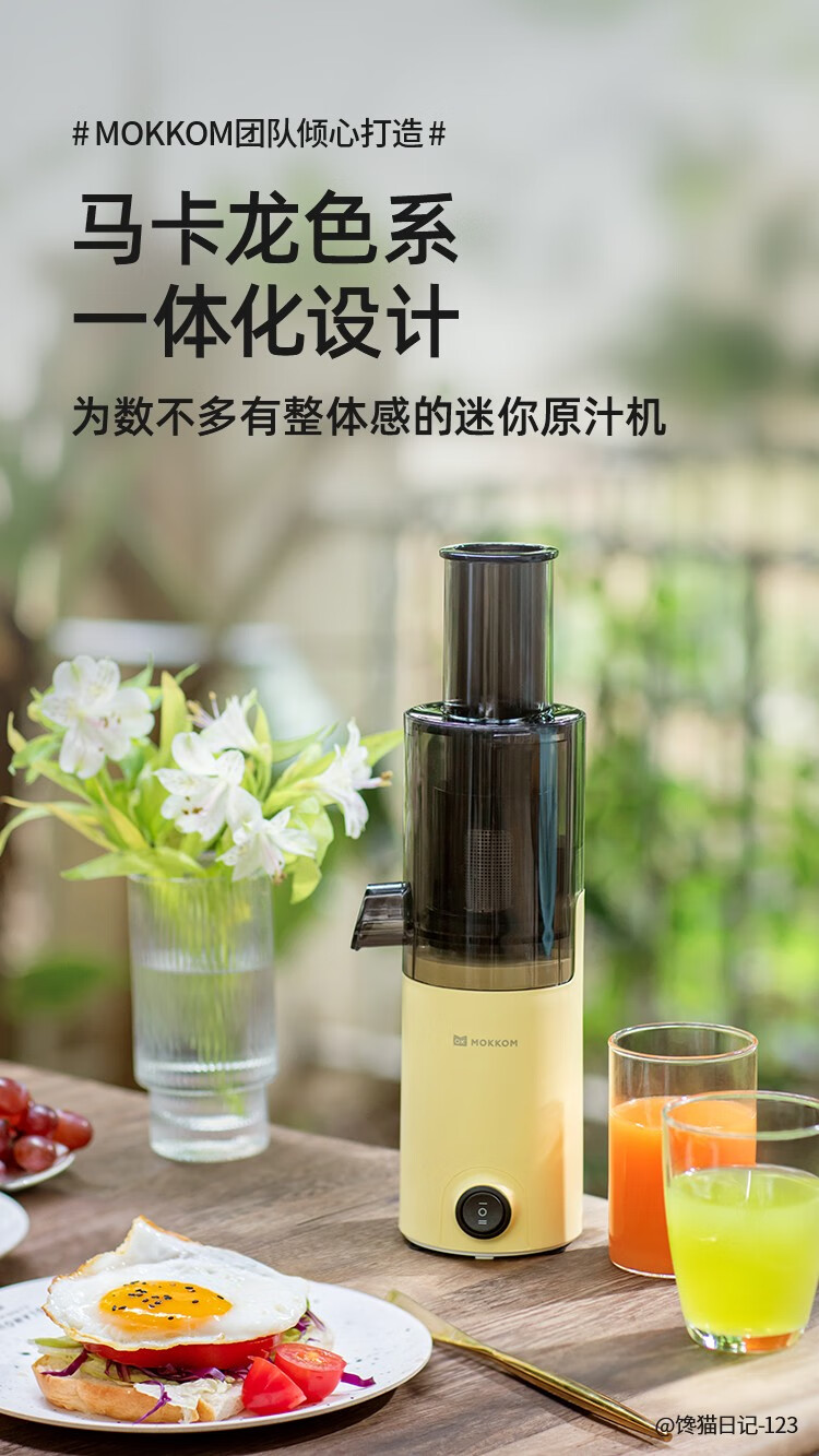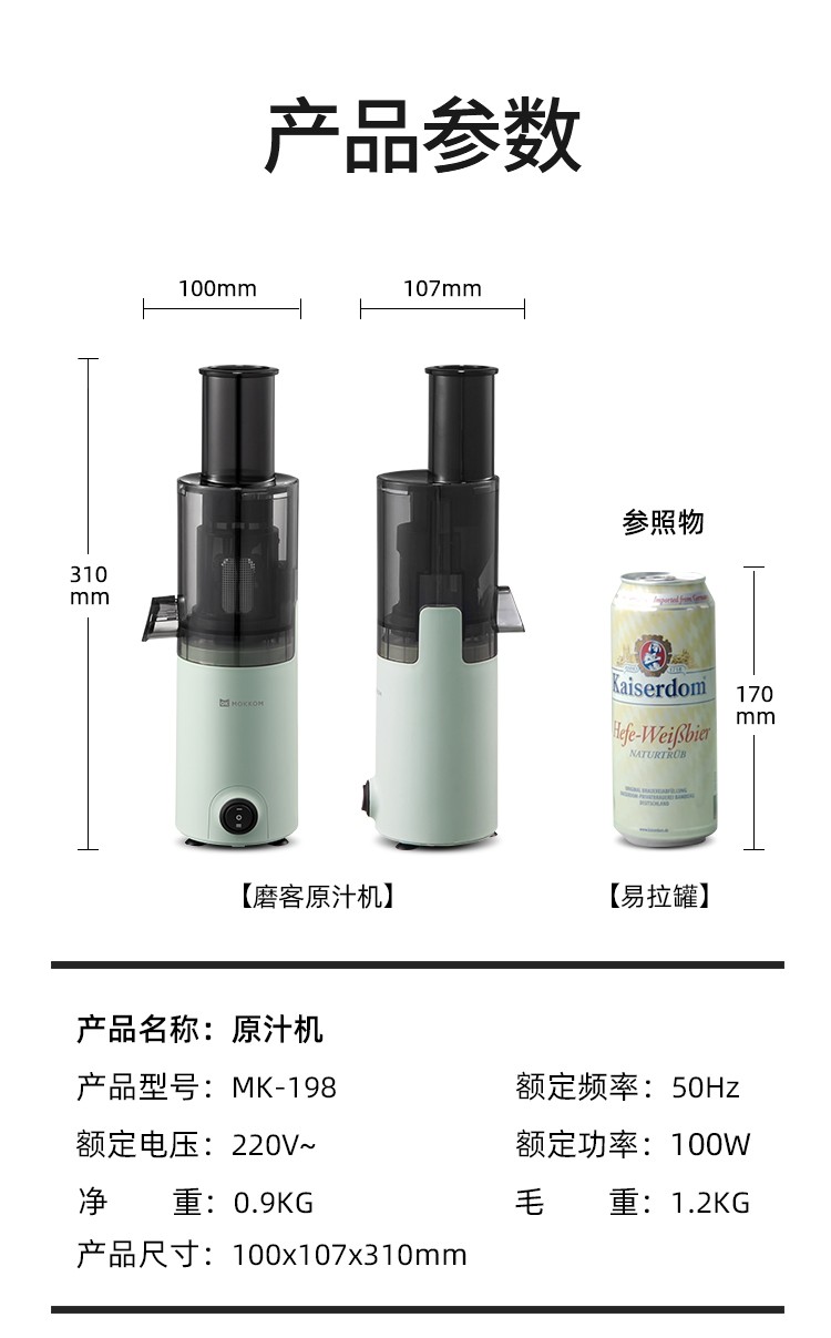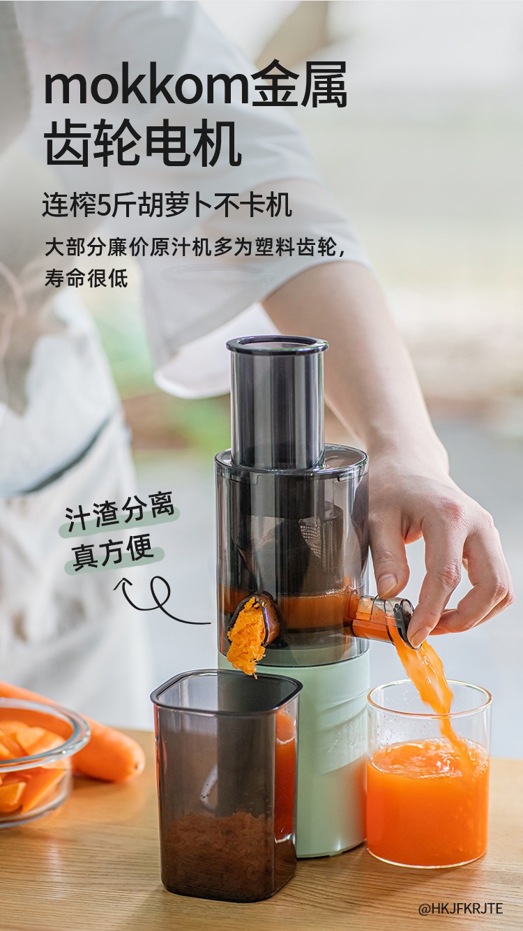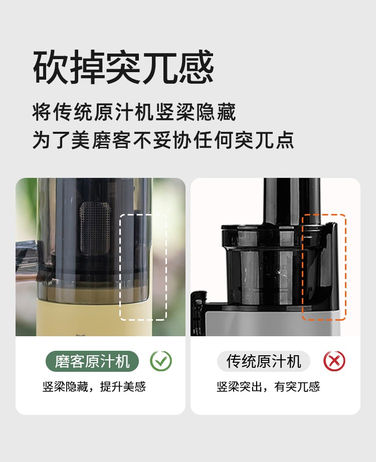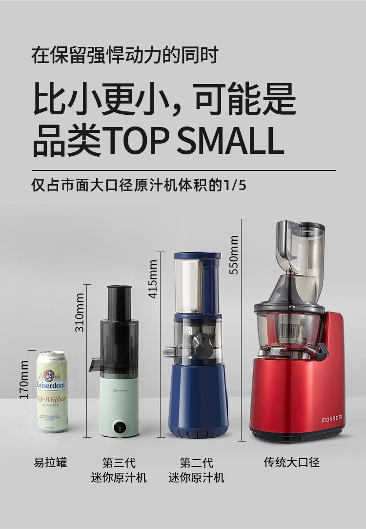 外观小巧,颜值超高,小机身有大能量,不占地,收纳及拆装非常简单,解决传统大型原汁机占位置及太重的问题