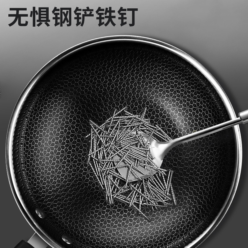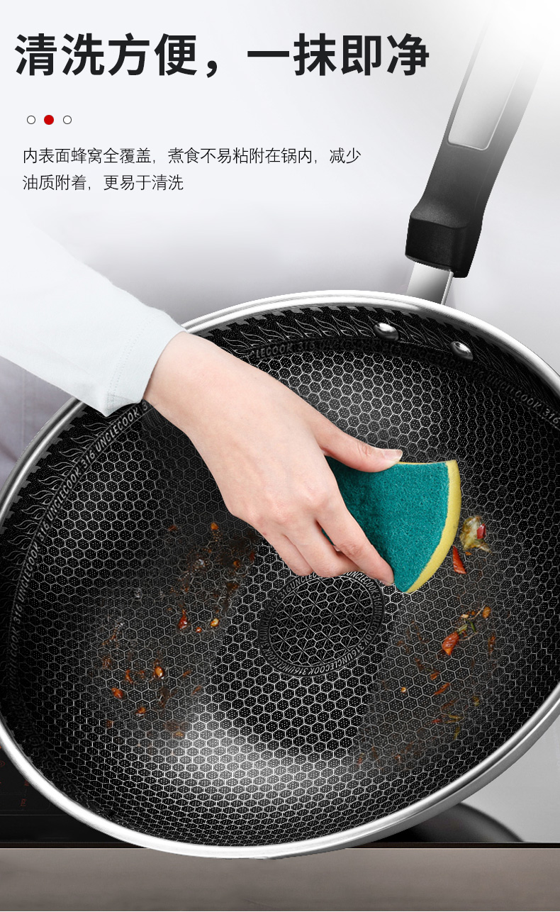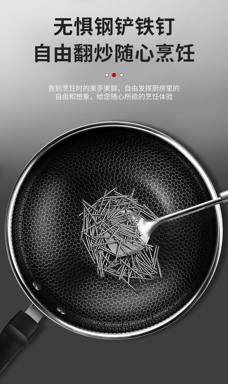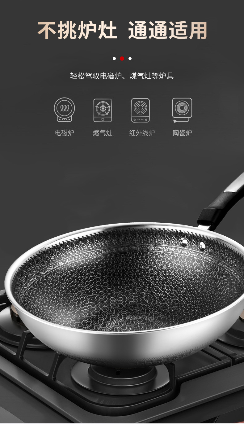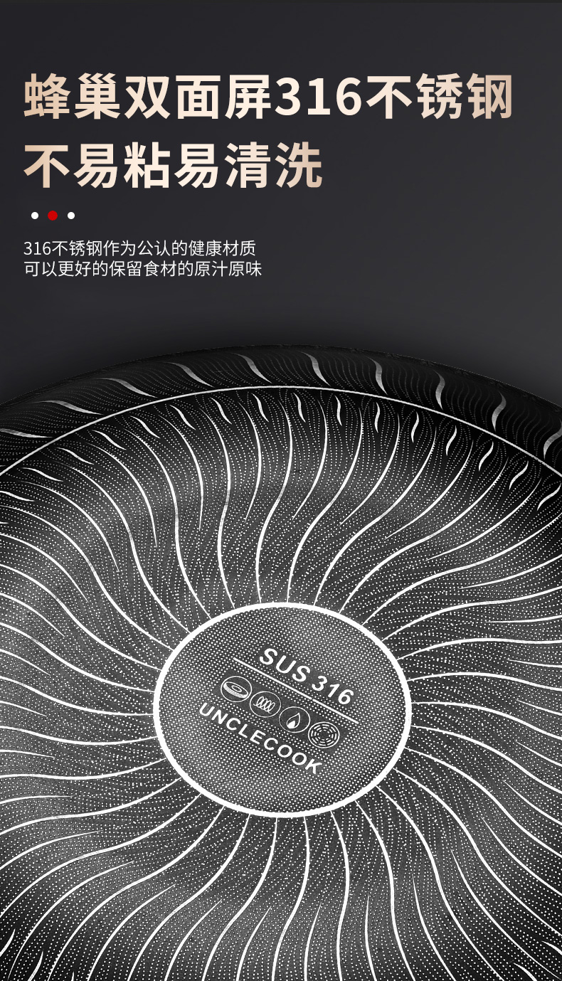 316不锈钢,蜂窝设计物理不粘,无涂层可用钢铲,不糊底更耐刮,煤气电磁炉通用