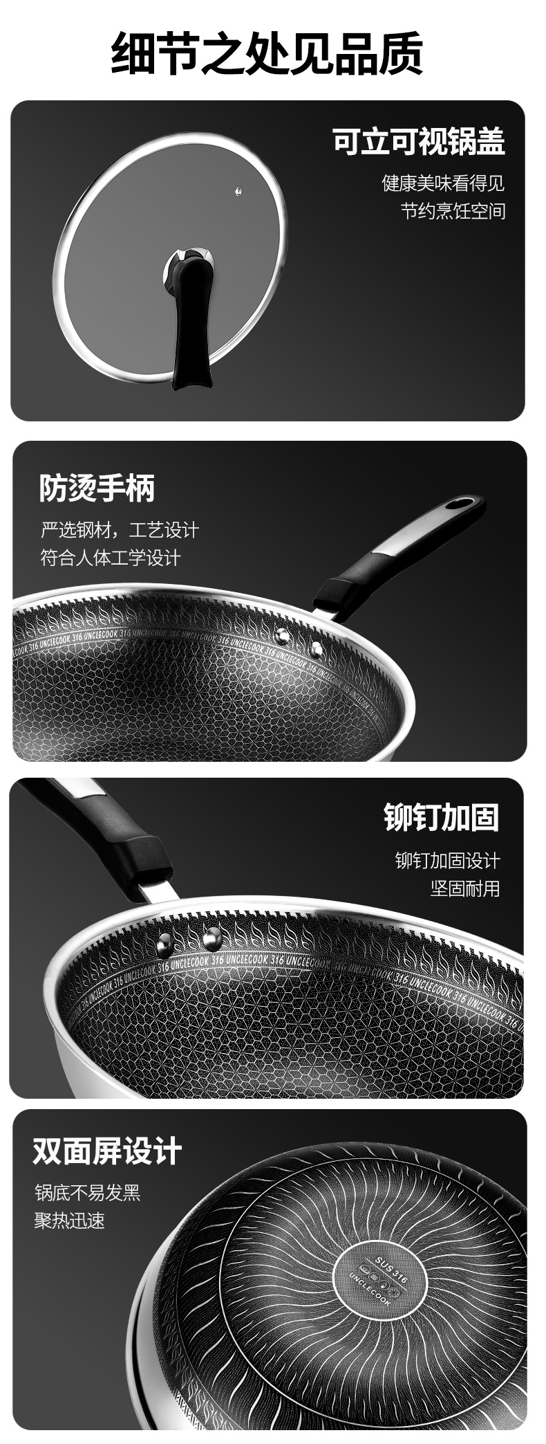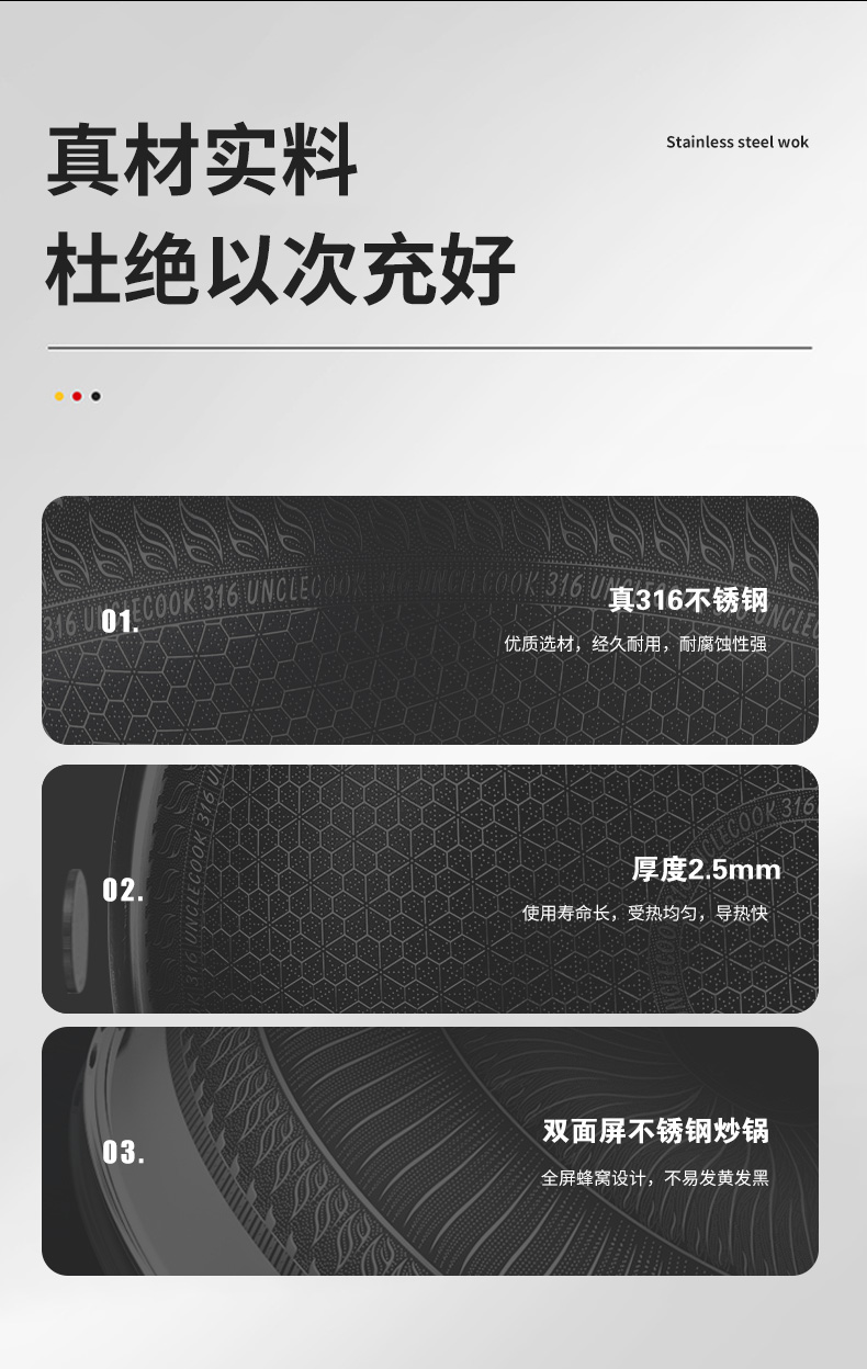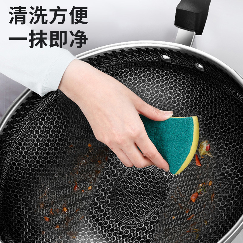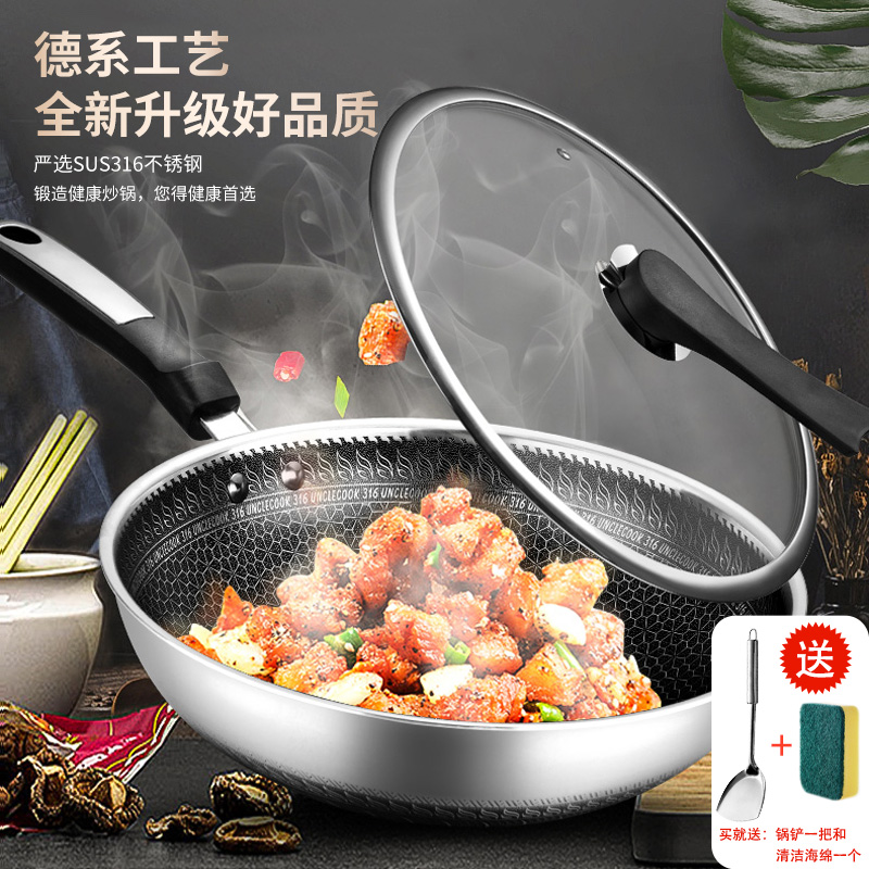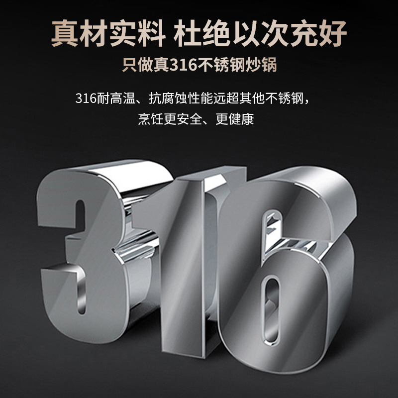 316不锈钢,蜂窝设计物理不粘,无涂层可用钢铲,不糊底更耐刮,煤气电磁炉通用