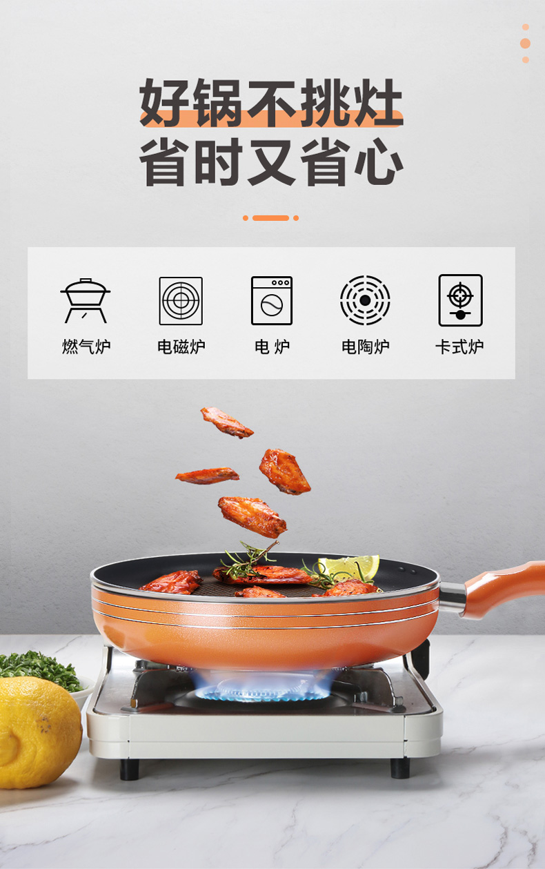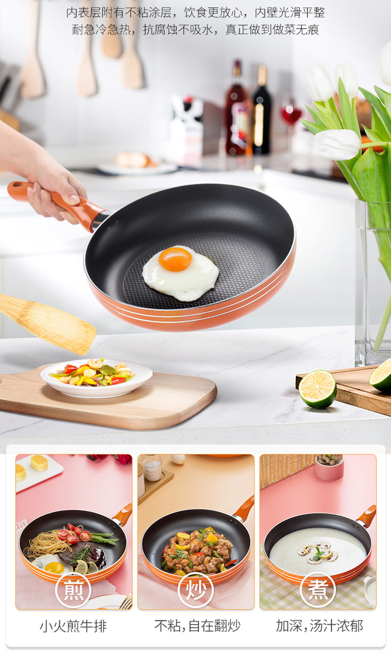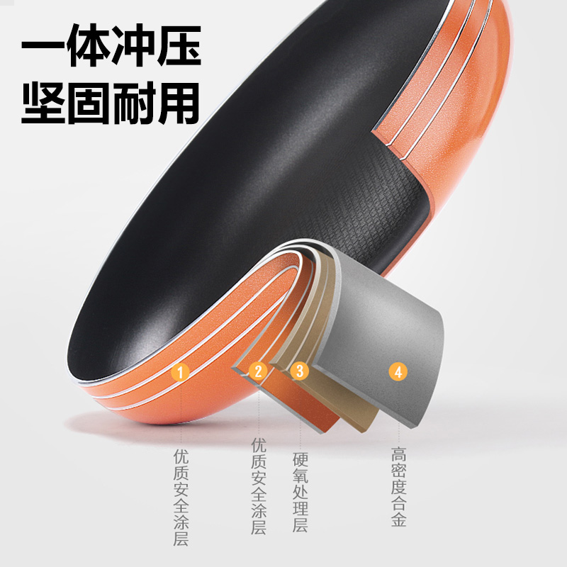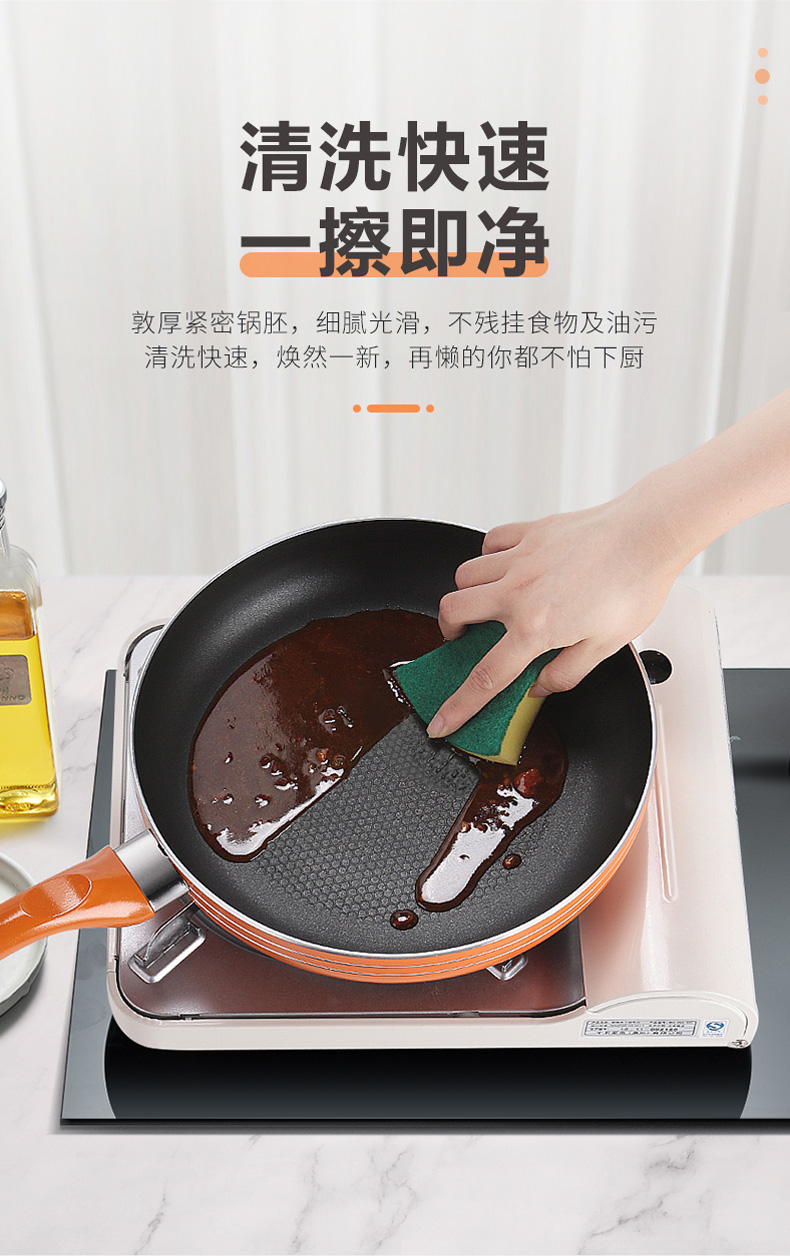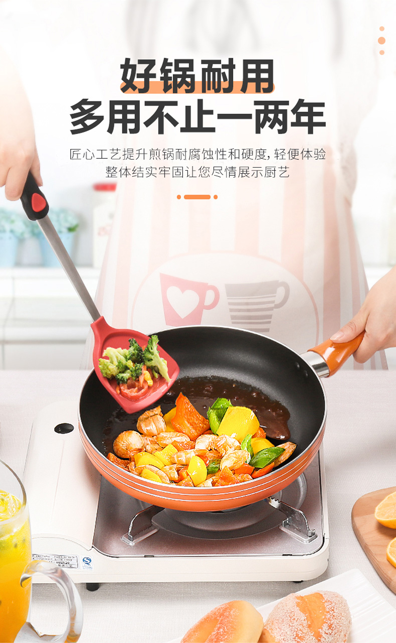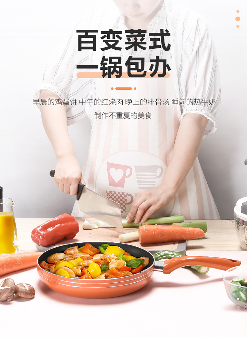 优质合金不易粘锅 预热快,导热均匀 耐磨耐用 可用炉明火 款式简洁好用易清洗