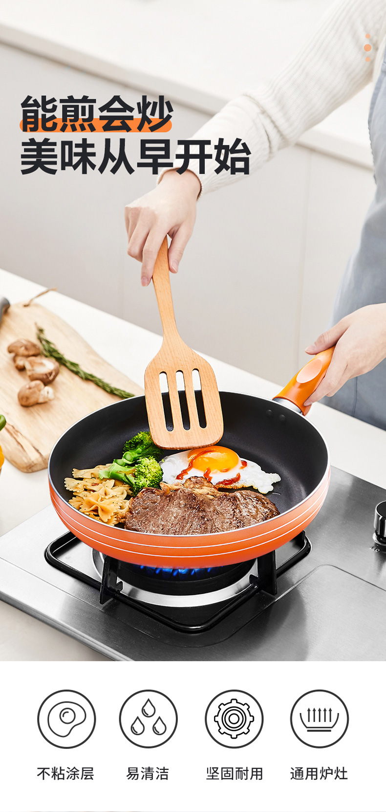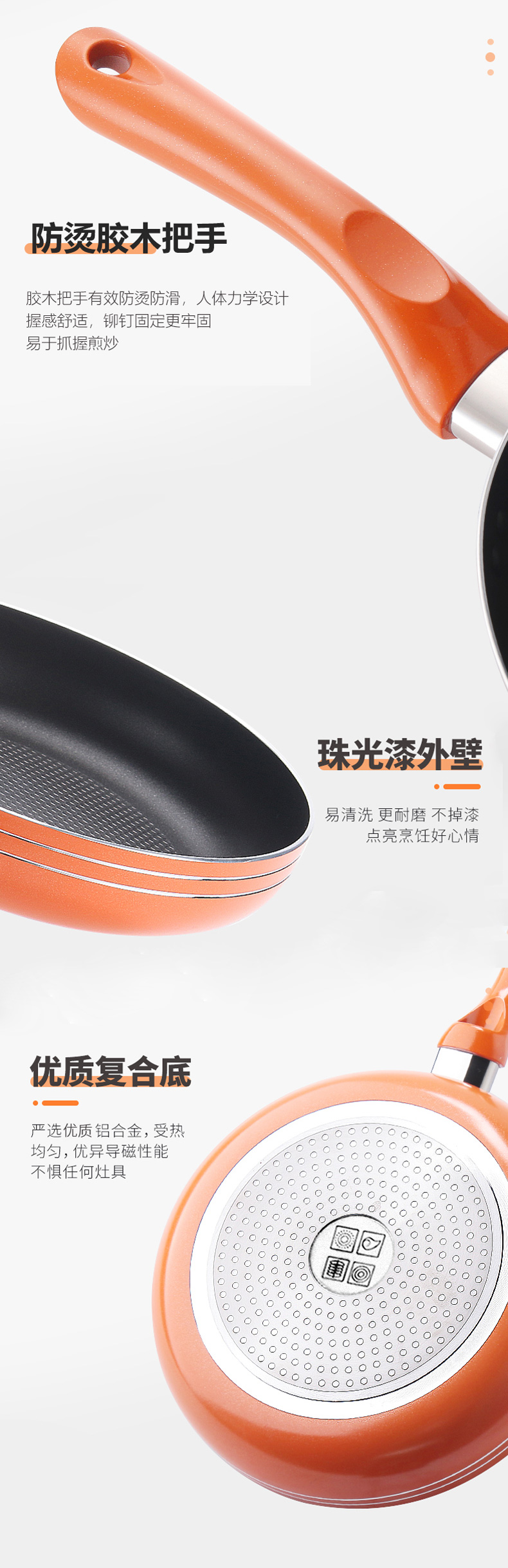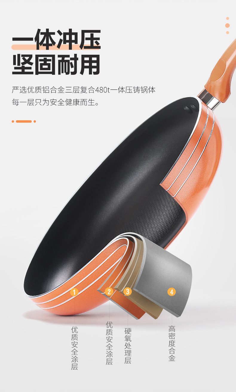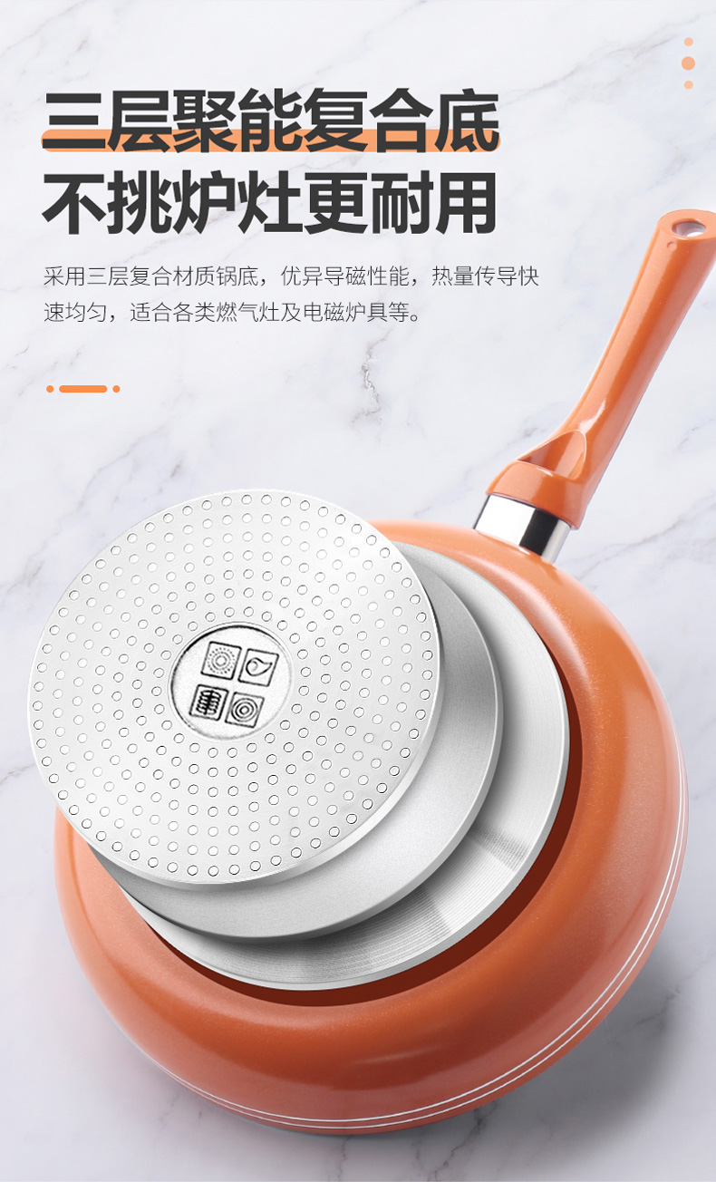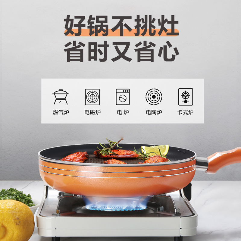 优质合金不易粘锅 预热快,导热均匀 耐磨耐用 可用炉明火 款式简洁好用易清洗