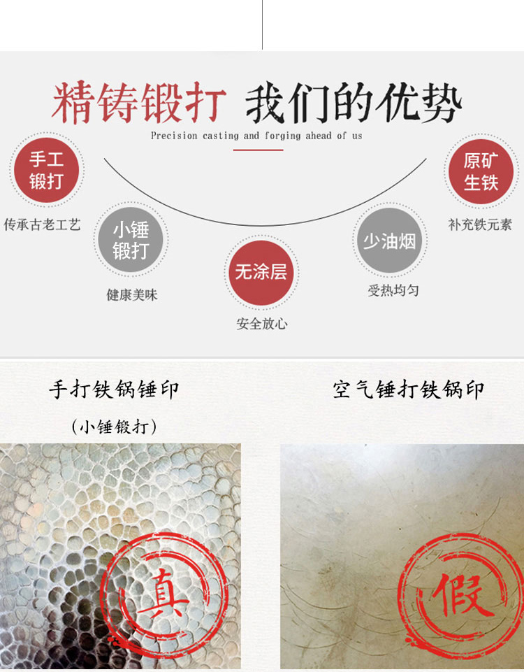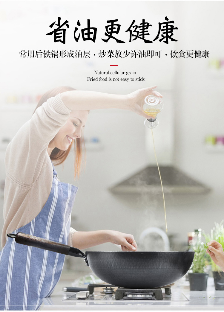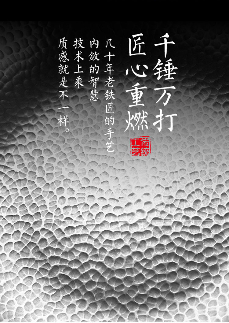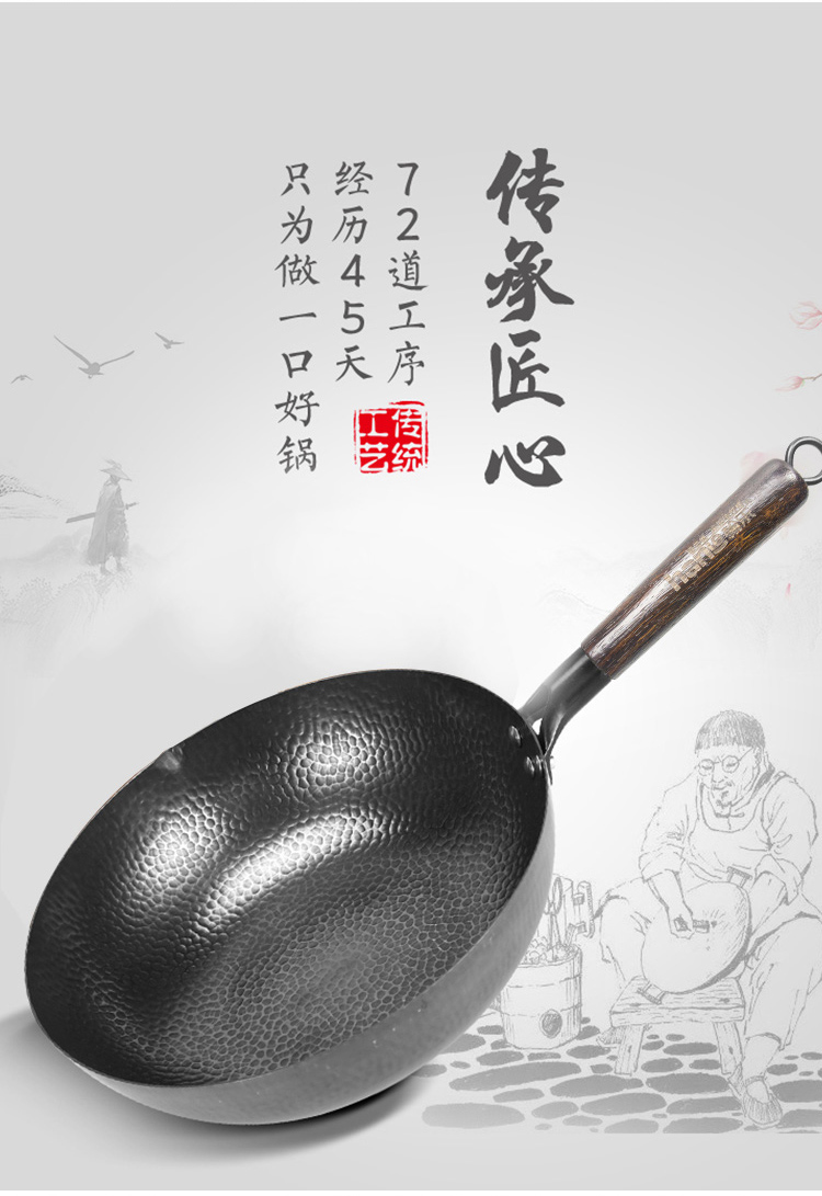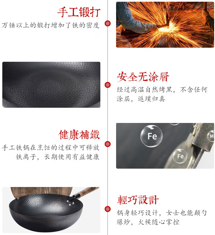 1.舌尖上的中国同款章丘手打锅 2.铸铁无涂层更健康,可用铁铲、耐磨、不易粘锅 3.章丘锻打工艺少烟,防锈 4.榉木手柄 不累手 畅享烹饪乐趣