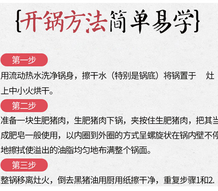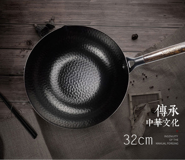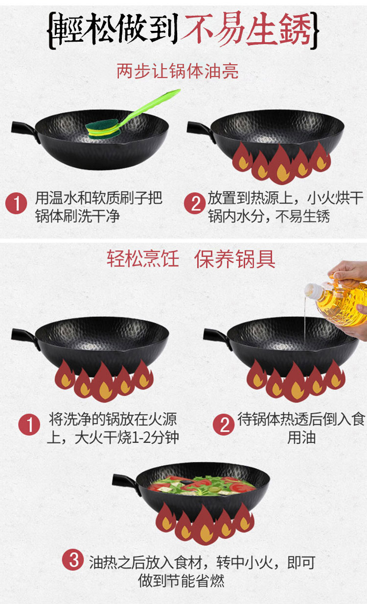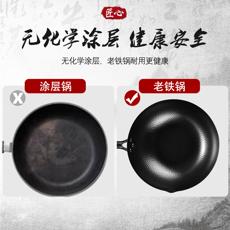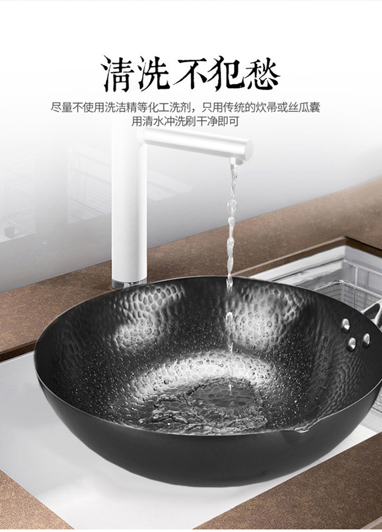 1.舌尖上的中国同款章丘手打锅 2.铸铁无涂层更健康,可用铁铲、耐磨、不易粘锅 3.章丘锻打工艺少烟,防锈 4.榉木手柄 不累手 畅享烹饪乐趣
