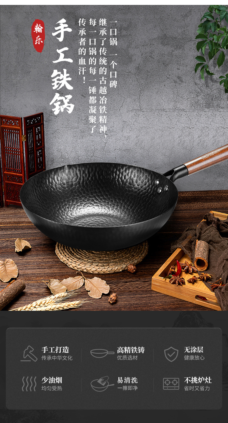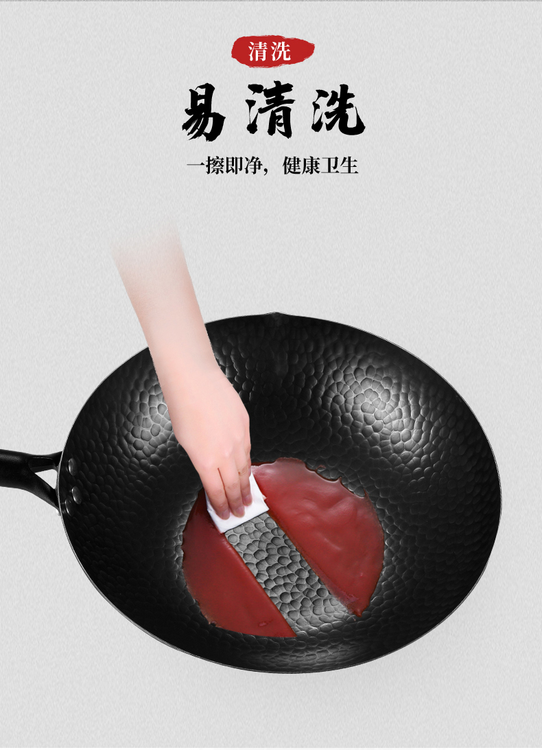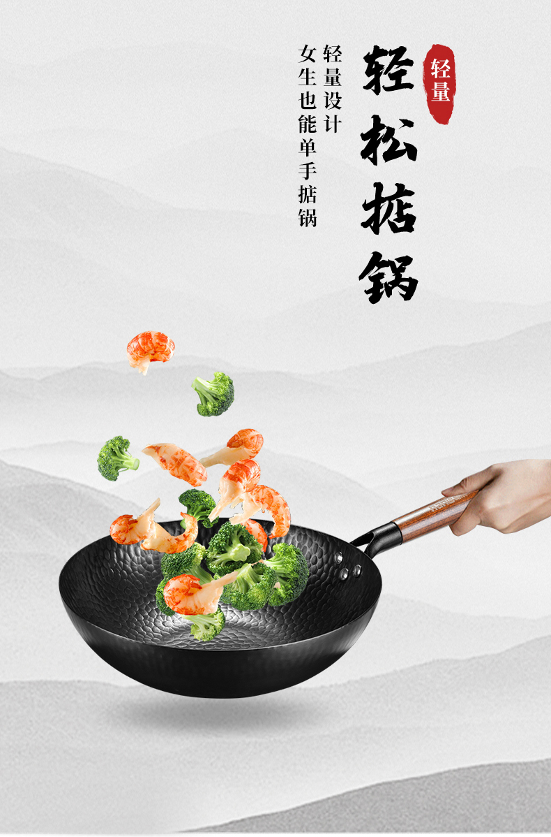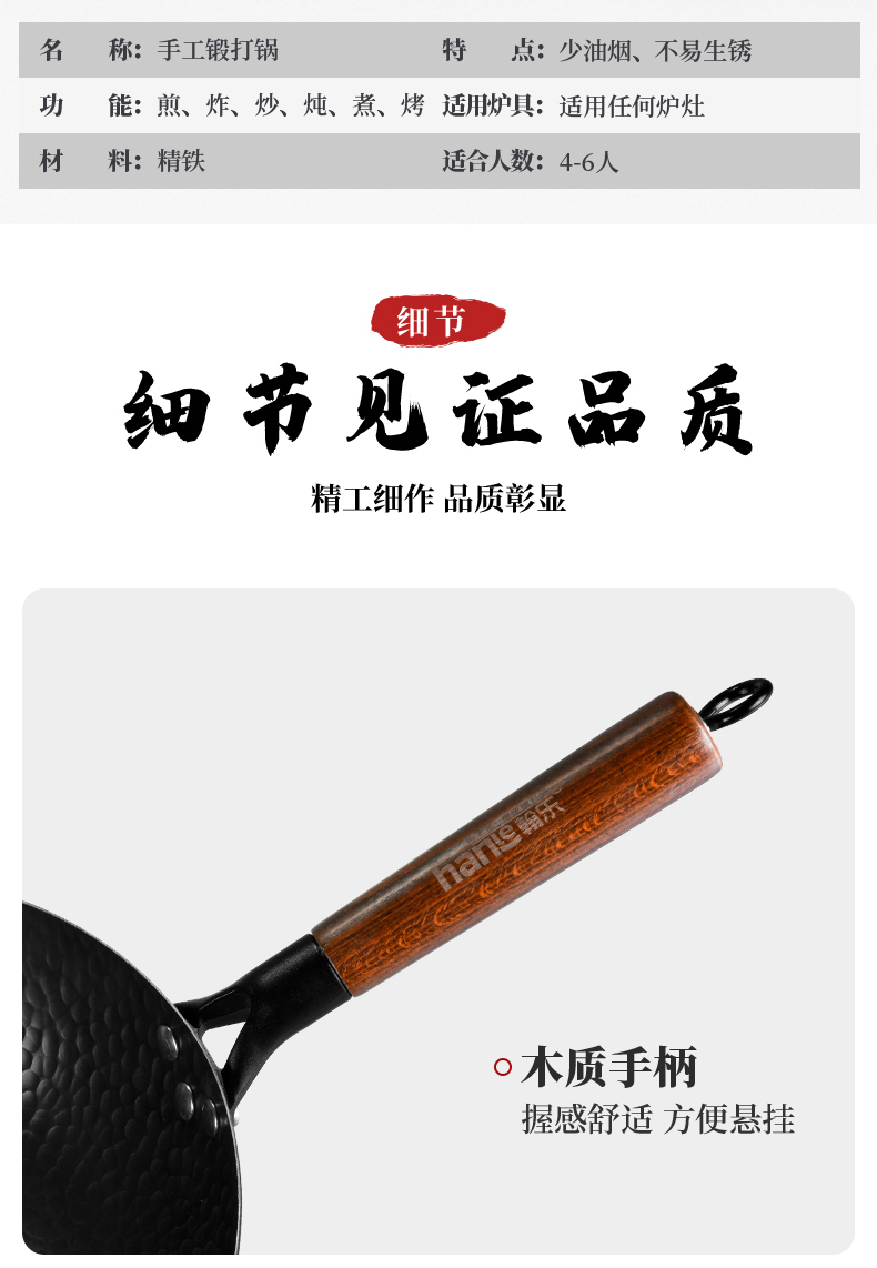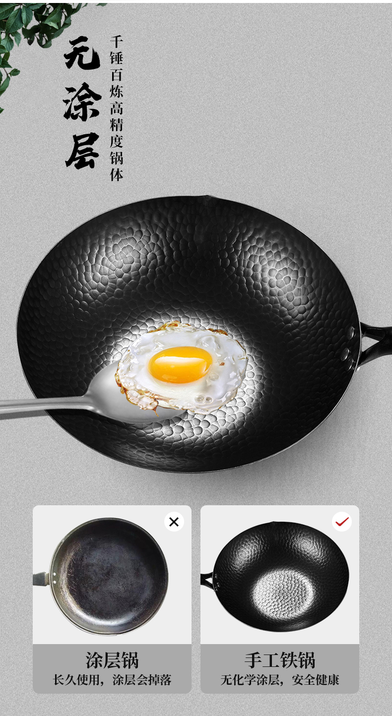 1.舌尖上的中国同款章丘手打锅 2.铸铁无涂层更健康,可用铁铲、耐磨、不易粘锅 3.章丘锻打工艺少烟,防锈 4.榉木手柄 不累手 畅享烹饪乐趣