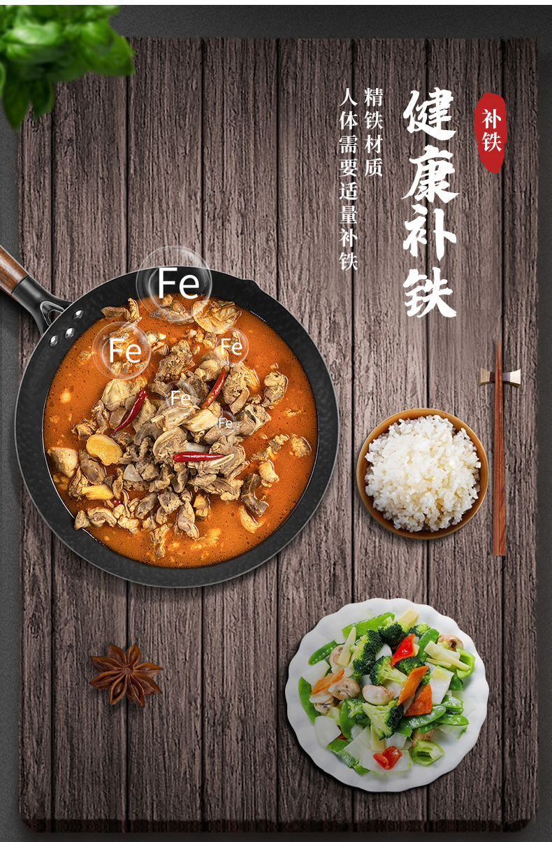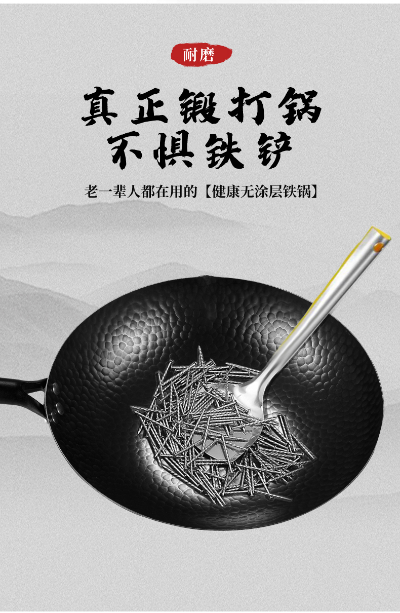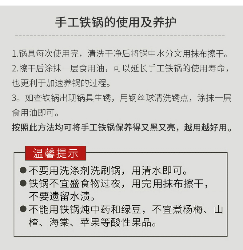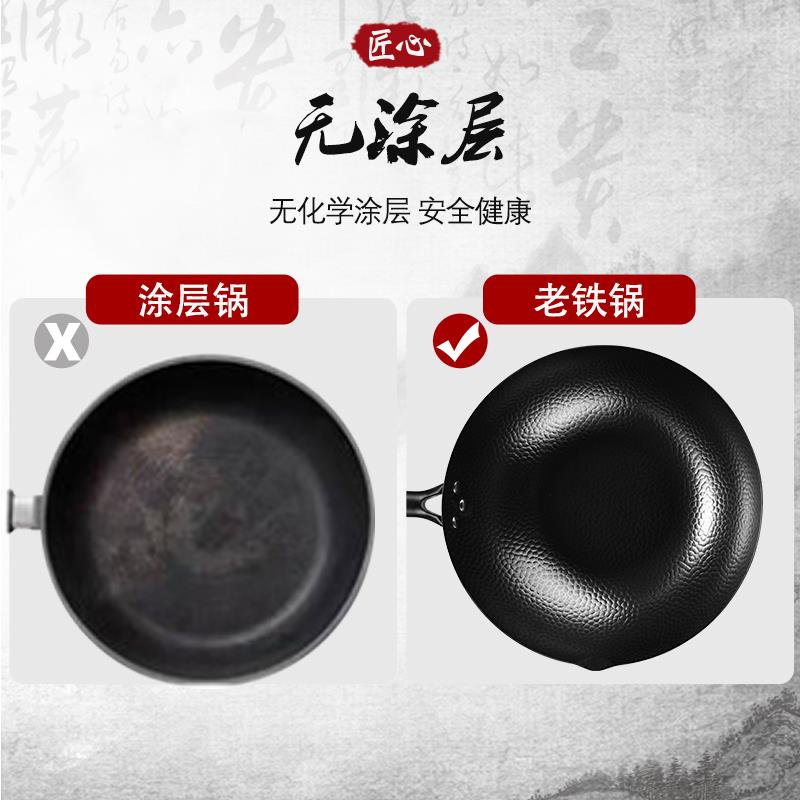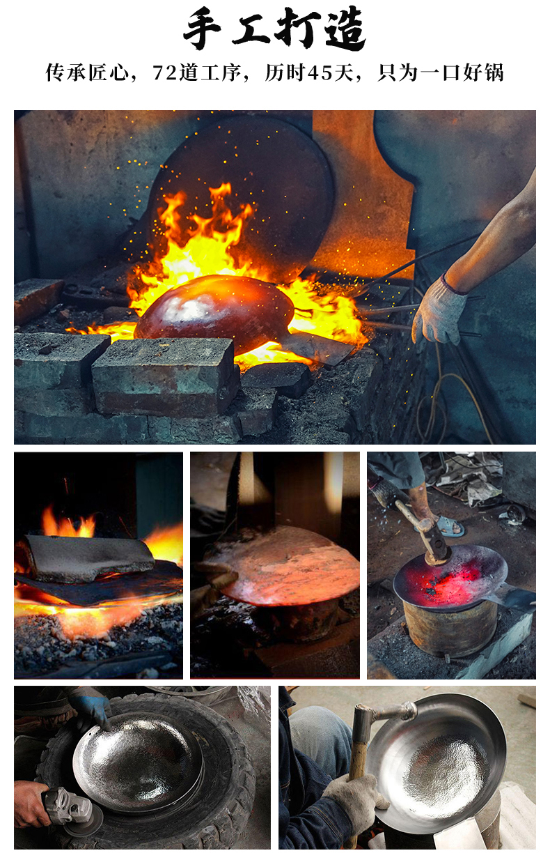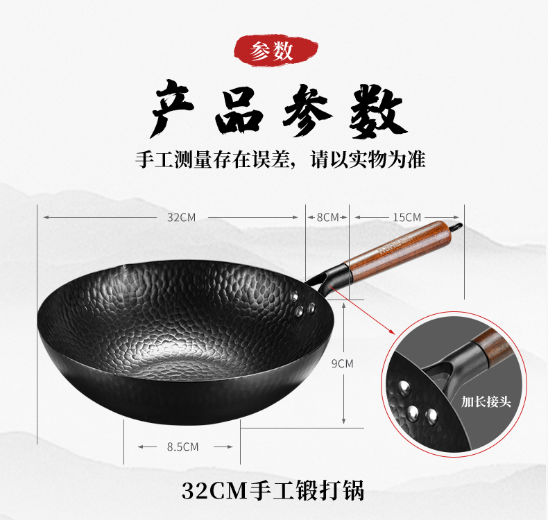 1.舌尖上的中国同款章丘手打锅 2.铸铁无涂层更健康,可用铁铲、耐磨、不易粘锅 3.章丘锻打工艺少烟,防锈 4.榉木手柄 不累手 畅享烹饪乐趣