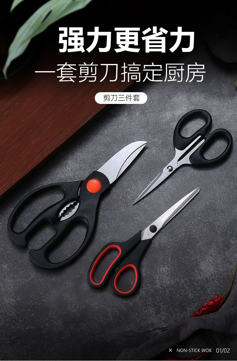 剪刀三件套,强力可剪各种偏硬食物,持久锋利,易清洗不易生锈,一冲即净,剖鱼肚,剪蔬菜,夹核桃,开瓶盖,家用剪刀贴心设计,方便家用,合适裁剪布料,索线等,亦可剪窗花,纸片等,手工剪刀,小巧灵动,能所不能,合适学生作业,办公设计