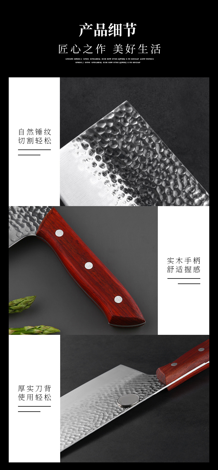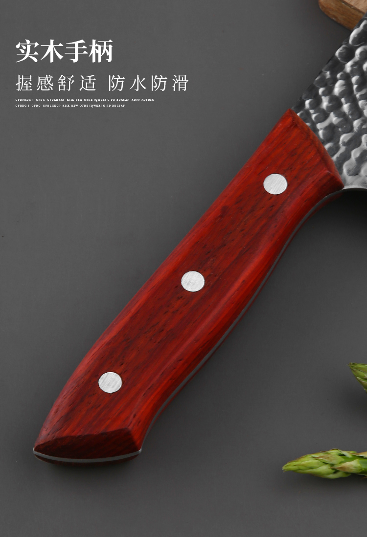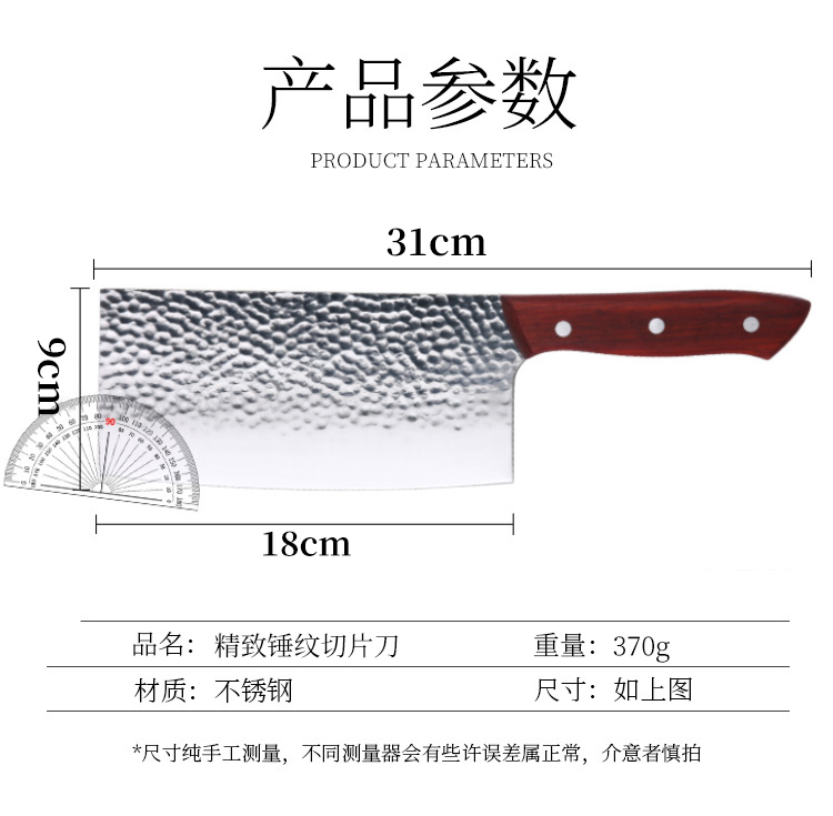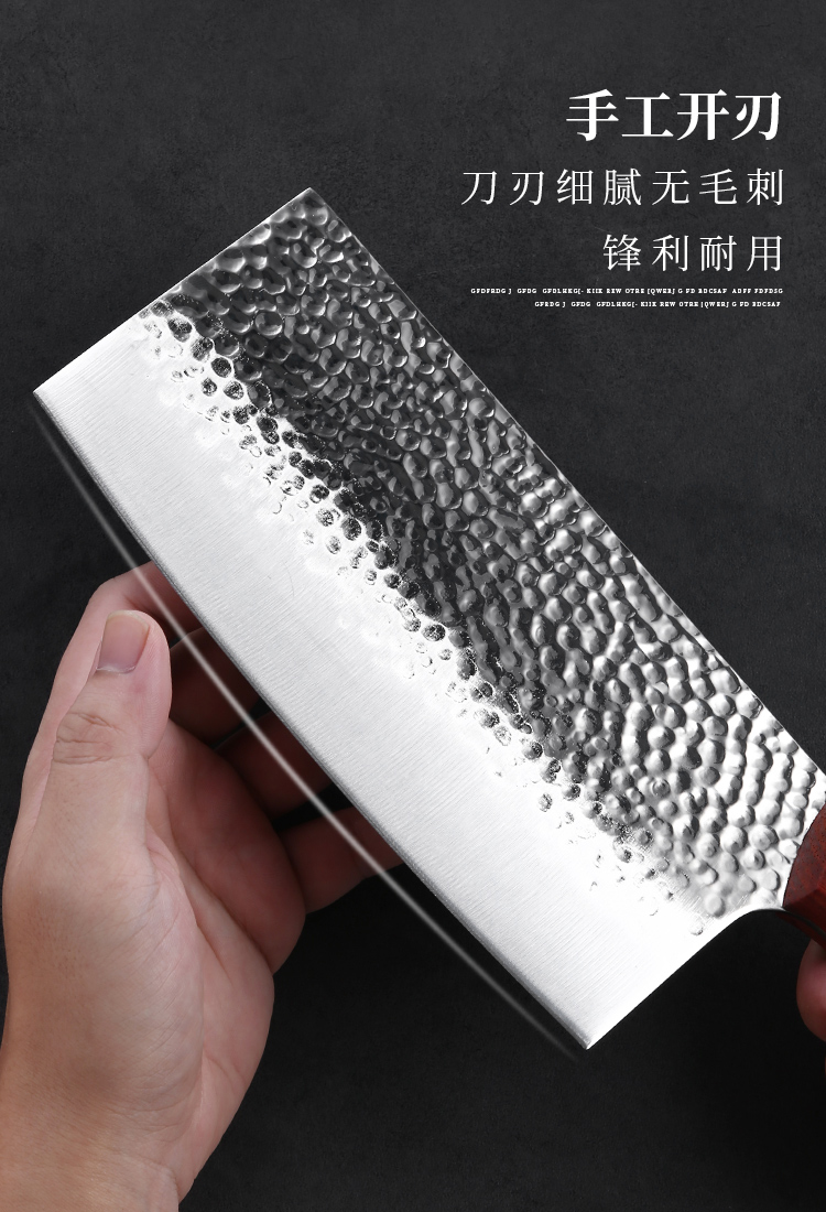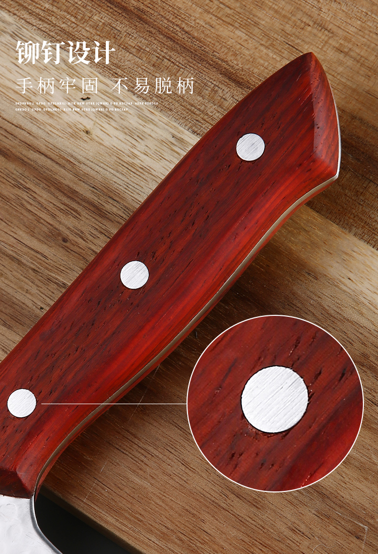 持久锋利、耐用易磨,高硬度,锻打渐薄刃口,铆钉加固手柄更加牢固,用途:切片、切菜、切肉等