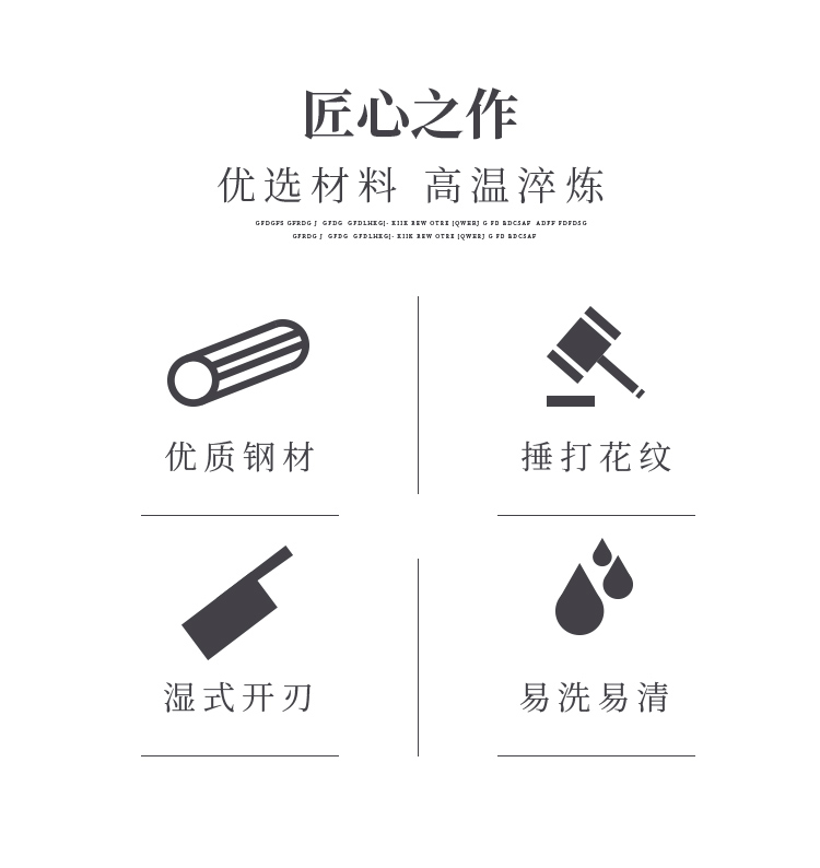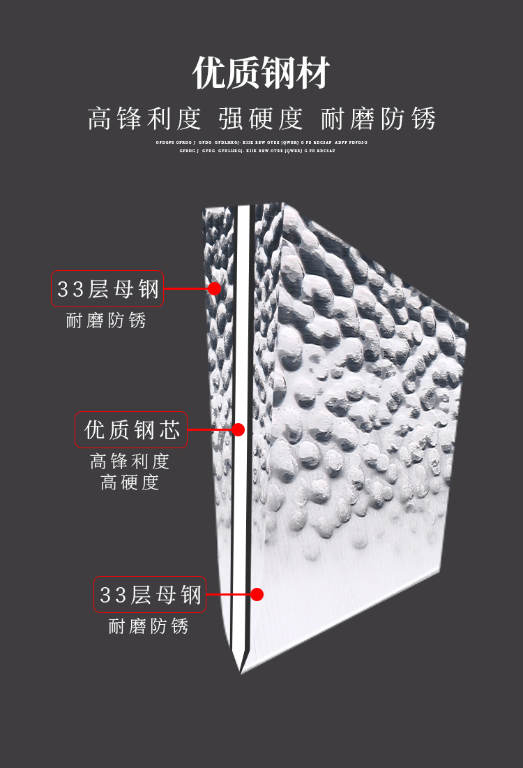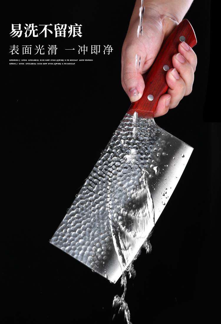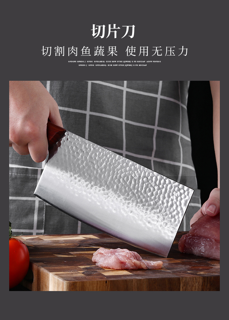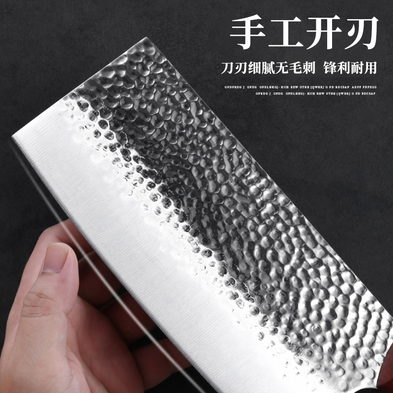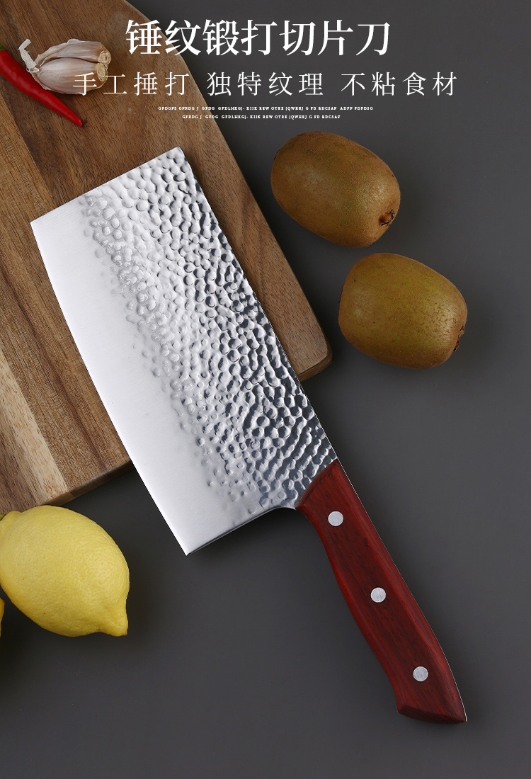 持久锋利、耐用易磨,高硬度,锻打渐薄刃口,铆钉加固手柄更加牢固,用途:切片、切菜、切肉等