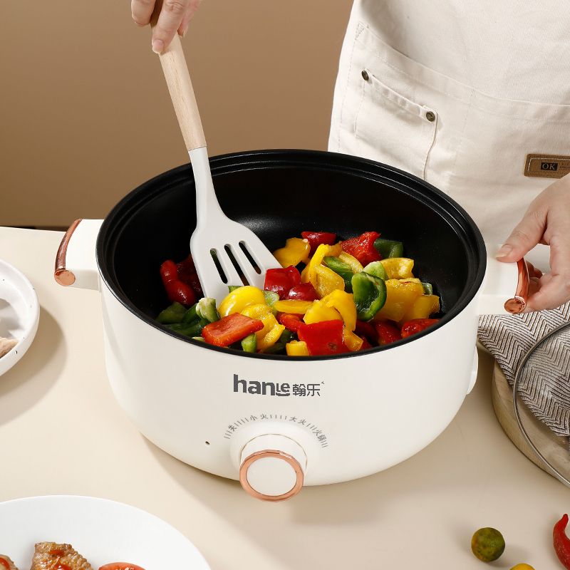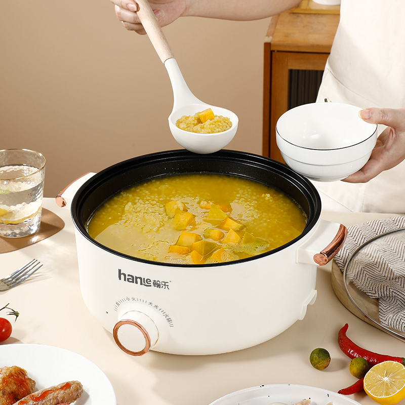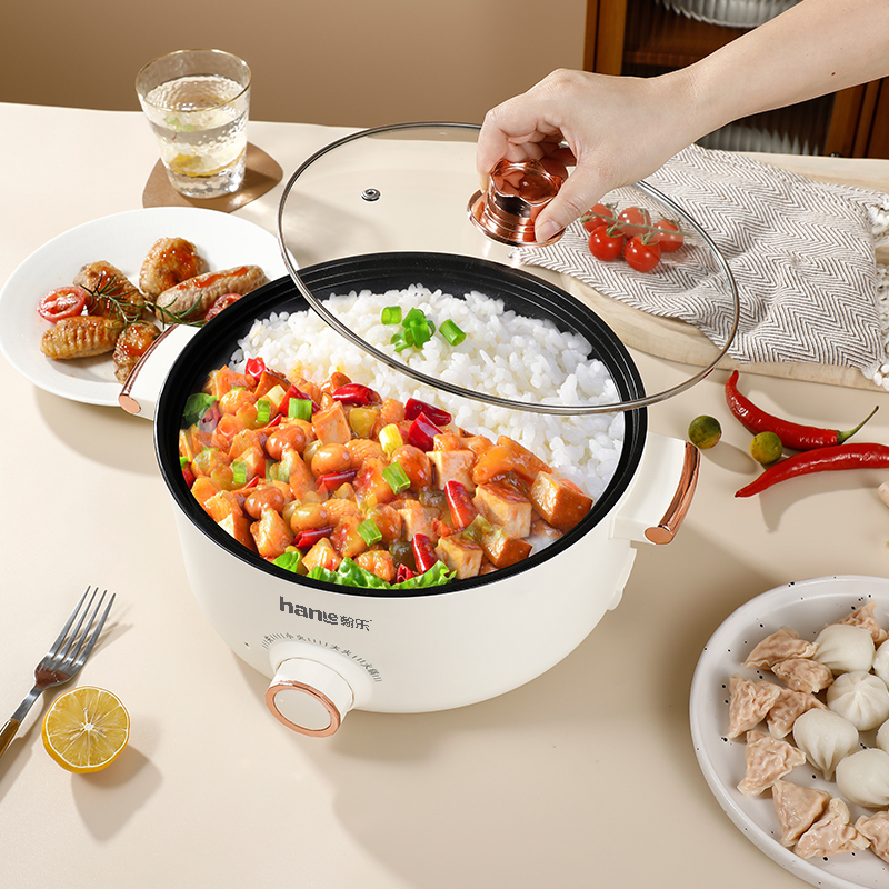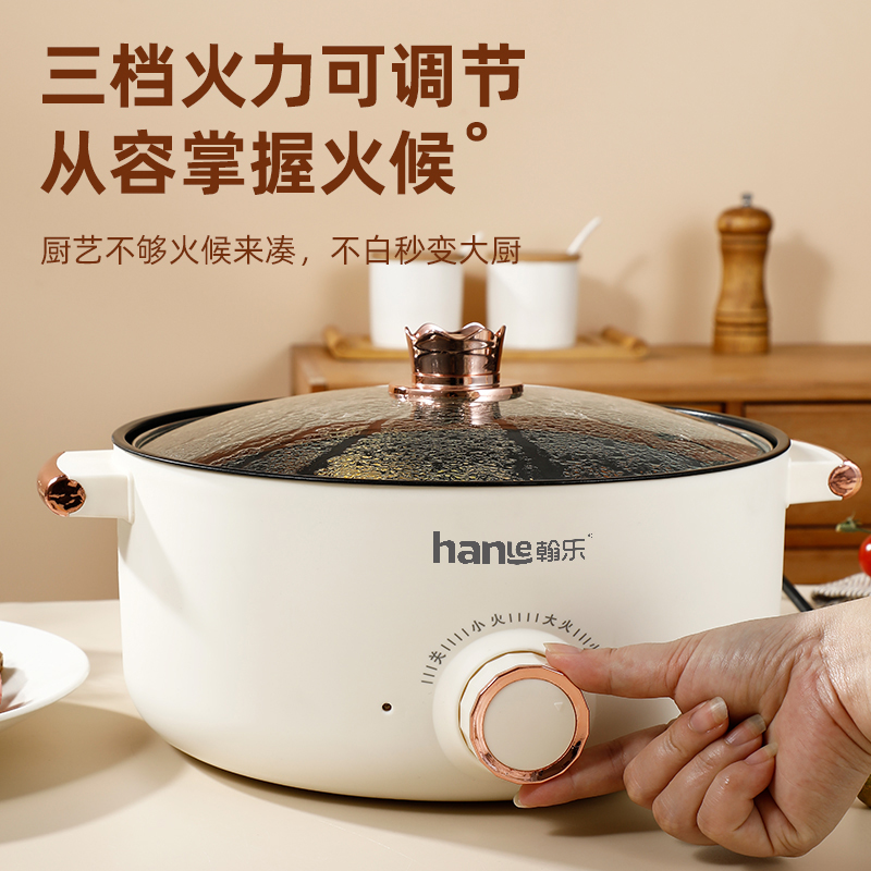 多功能烹饪食品级不粘涂层,温控保护三档火力可调节,一档/小火细炖慢熬煲汤煮粥,二档/大火猛火快熟煮饭煎炒,三档/火锅畅快涮锅,全盘整圈快速发热,米白色32cm多功能6L电煮锅,分离式安全电源,底部散热孔及时散热安全运行,透视盖设计烹饪食物看得见,黑陶晶不粘内胆涂层清洗不费力,三层加厚锅体聚能受热端拿不烫