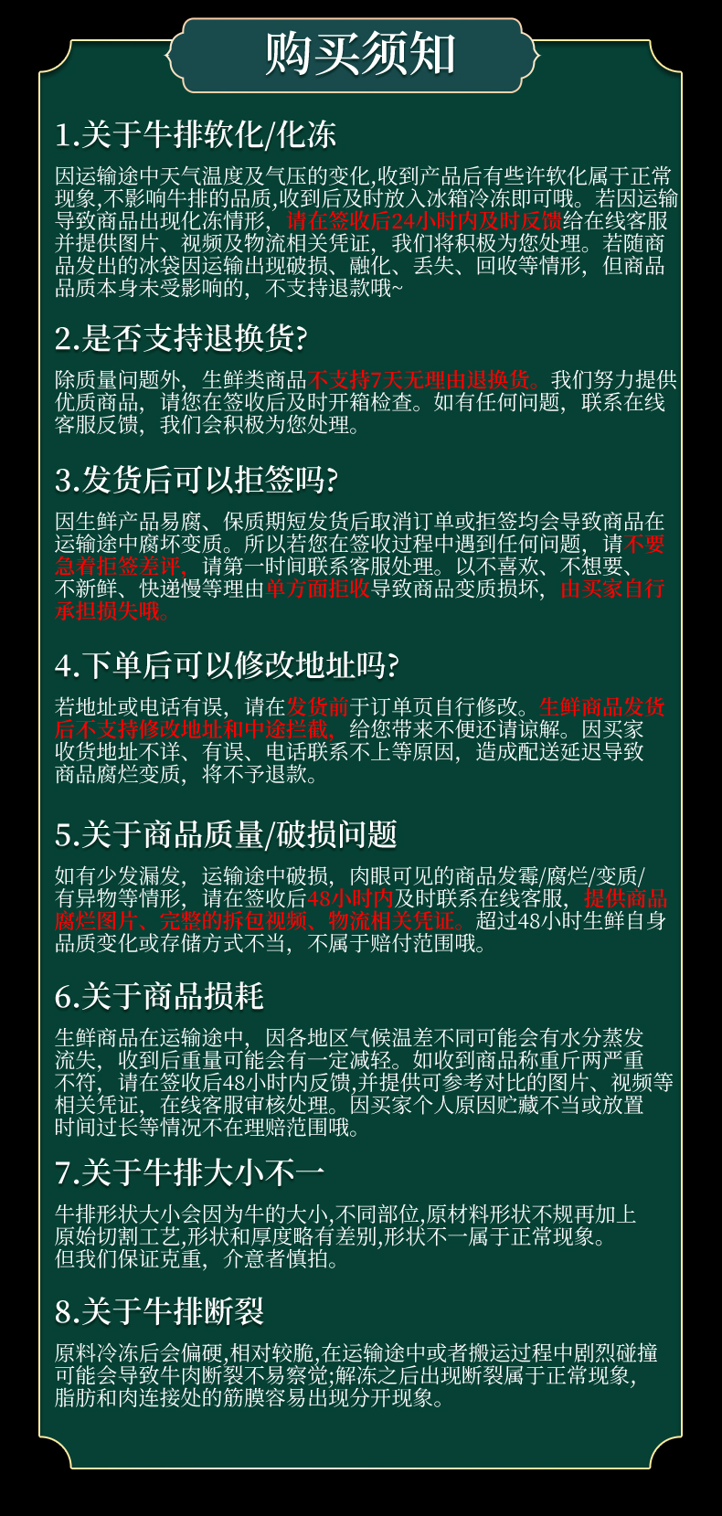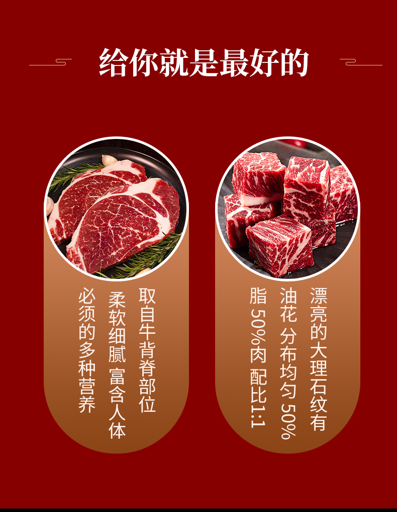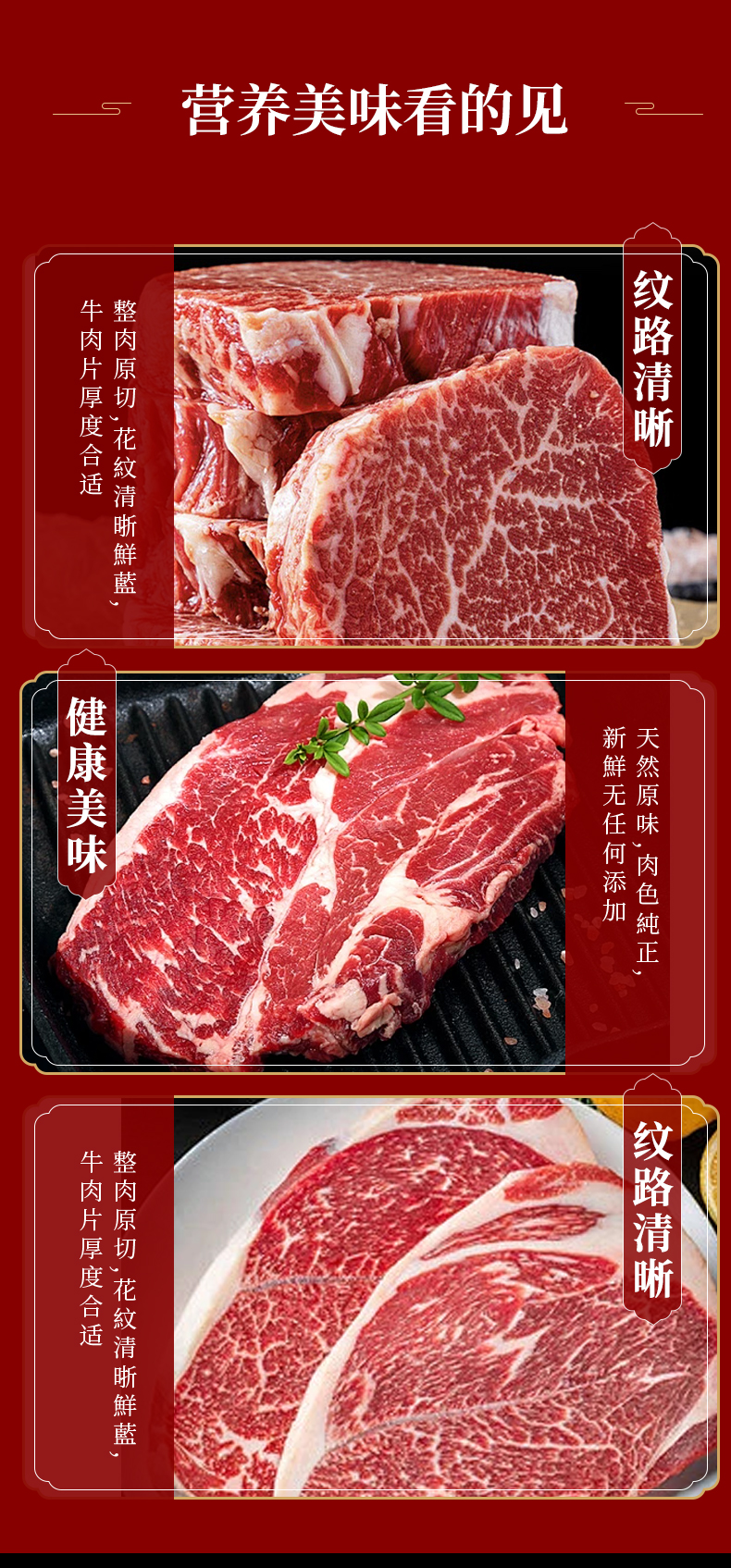 菲力牛排180g/2份 嫰肩牛排180g1份 上脑牛排180g/1份 西冷牛排180g/1份 雪花烤肉片400g/1份 雪花牛肉粒400g/1袋 雪花牛肉400g/1份