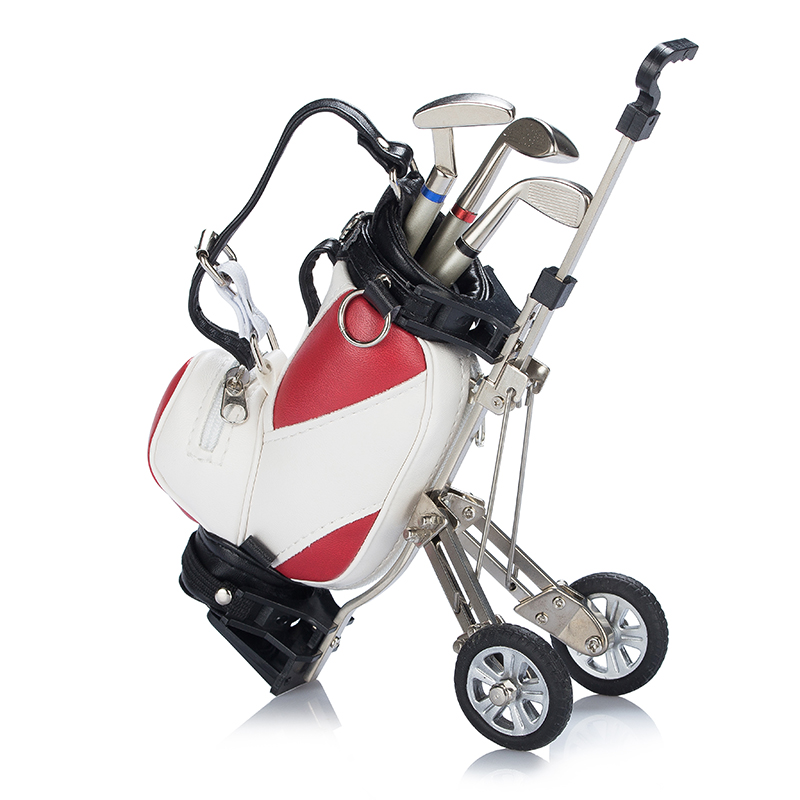 高尔夫拉杆车笔筒配有拉杆车,高尔夫笔筒、三支高尔夫笔。车身全部采用锌合金制造,精度高,胎纹清晰立体,球袋为1.2PU皮,由高尔夫球袋专业人士制作,拉链及缝线均匀整齐。软胶握把,笔分别是红、蓝、黑三种不同颜色的圆珠笔。可在球包上打印LOGO,拉杆车不仅可以摆放,还可以拉动,彰显个性,送礼别致新颖。高尔夫拉杆车笔筒时尚、精美,是高尔夫人士的精品,是赠送亲朋好友的最佳赠品。也可以作为办公室的摆设品、居家摆饰品、汽车摆饰品。