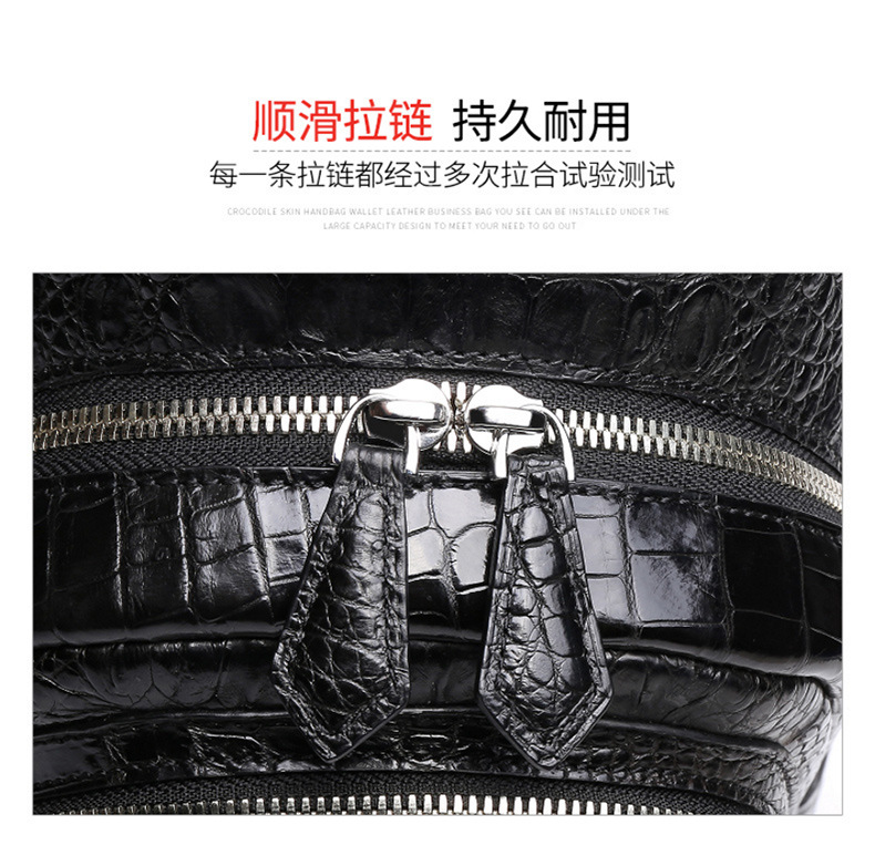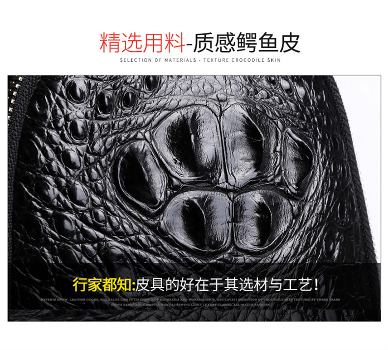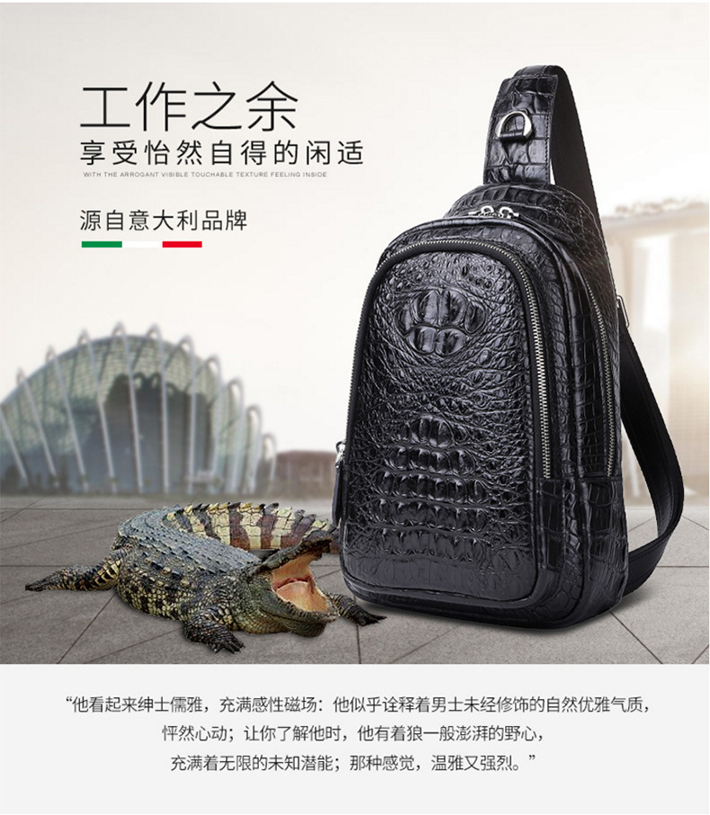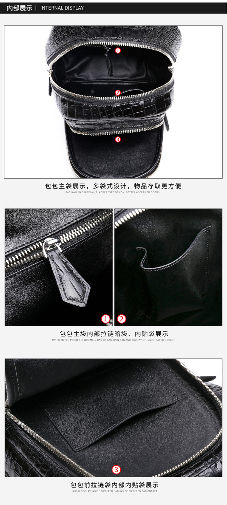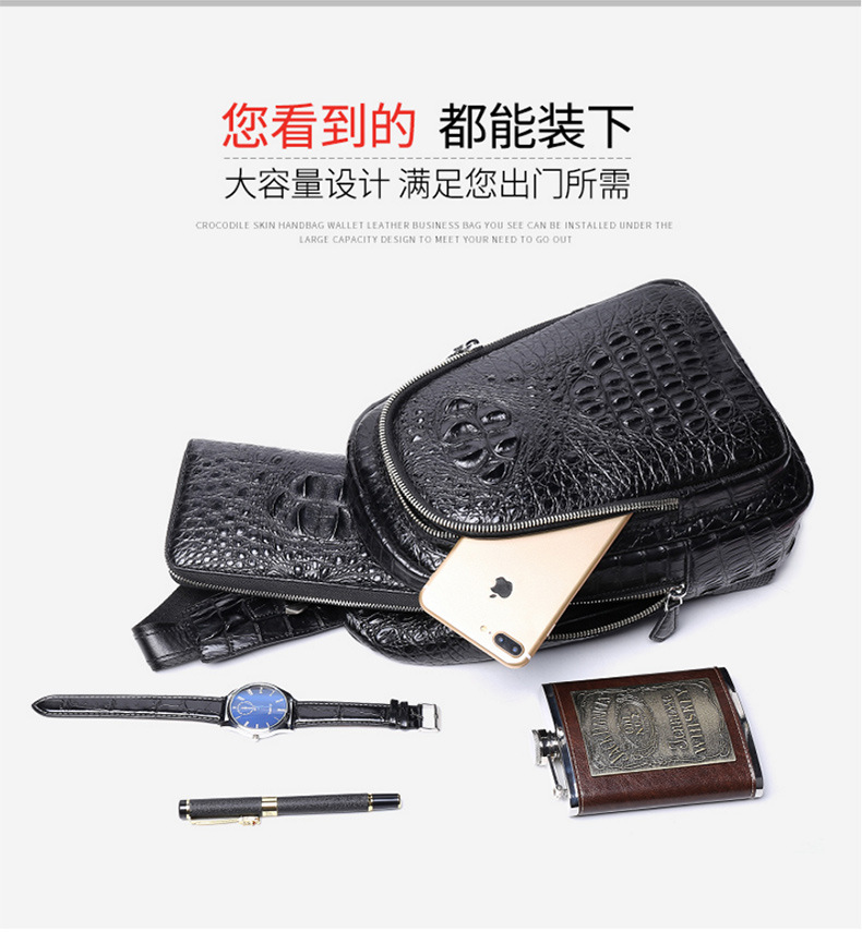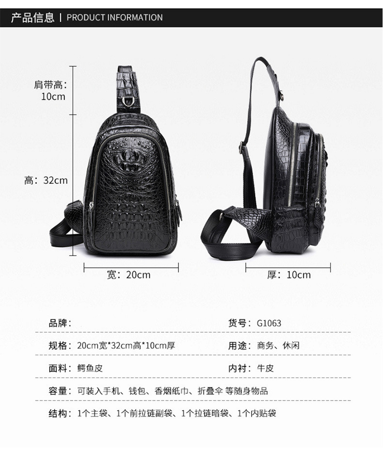 货号:G1063规格:20cm宽 x 32cm高 x 10cm厚面料:鳄鱼皮内衬:牛皮用途:商务、休闲容量:可装入手机、钱包、香烟纸巾、折叠伞等物品内部结构:1个主袋、1个前拉链副袋、1个拉链暗袋、1个内贴袋
