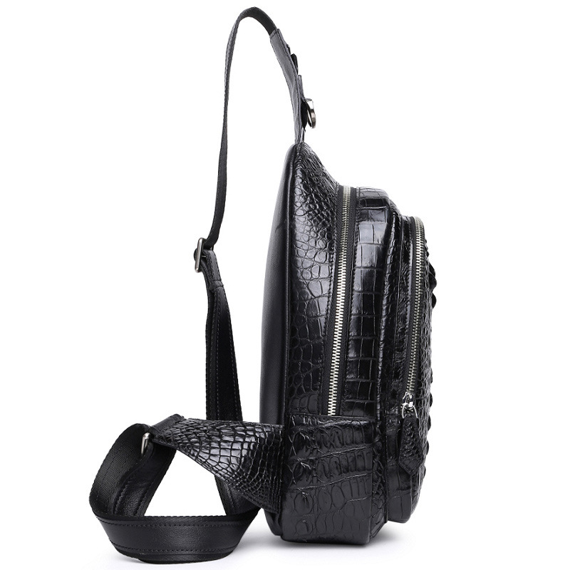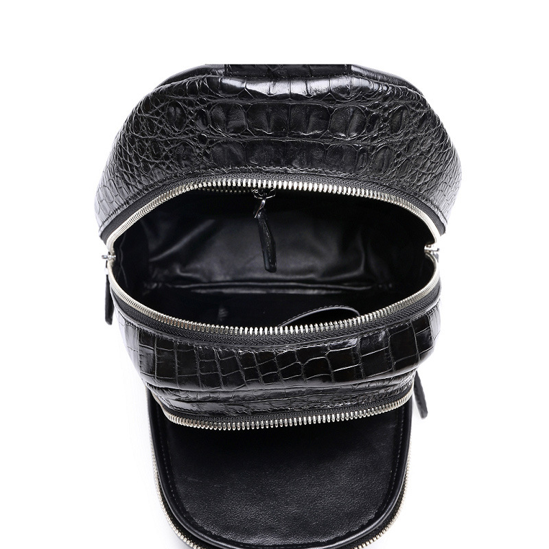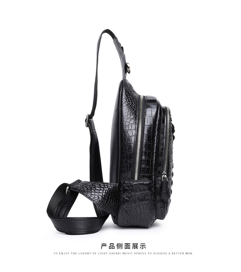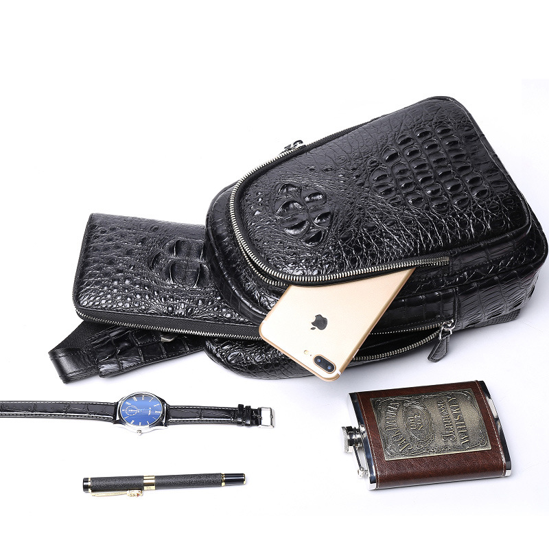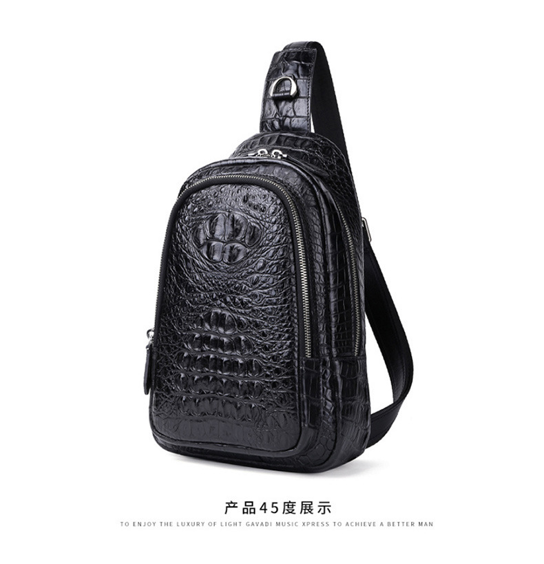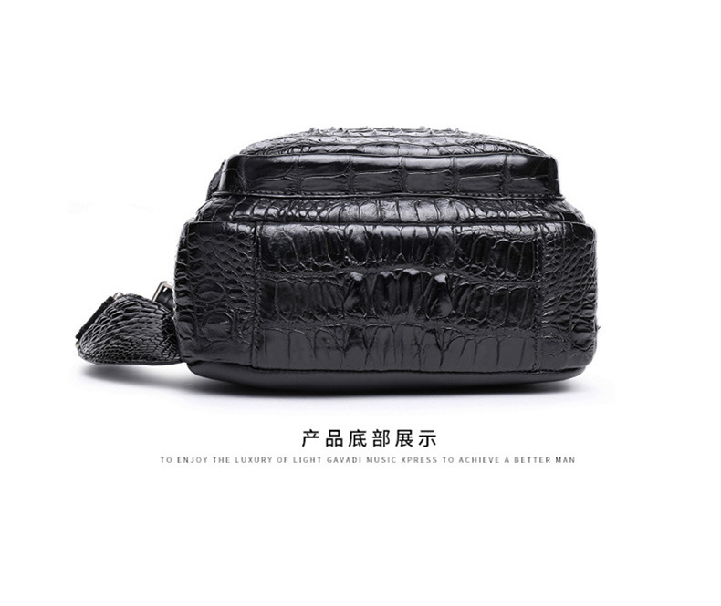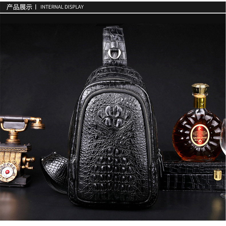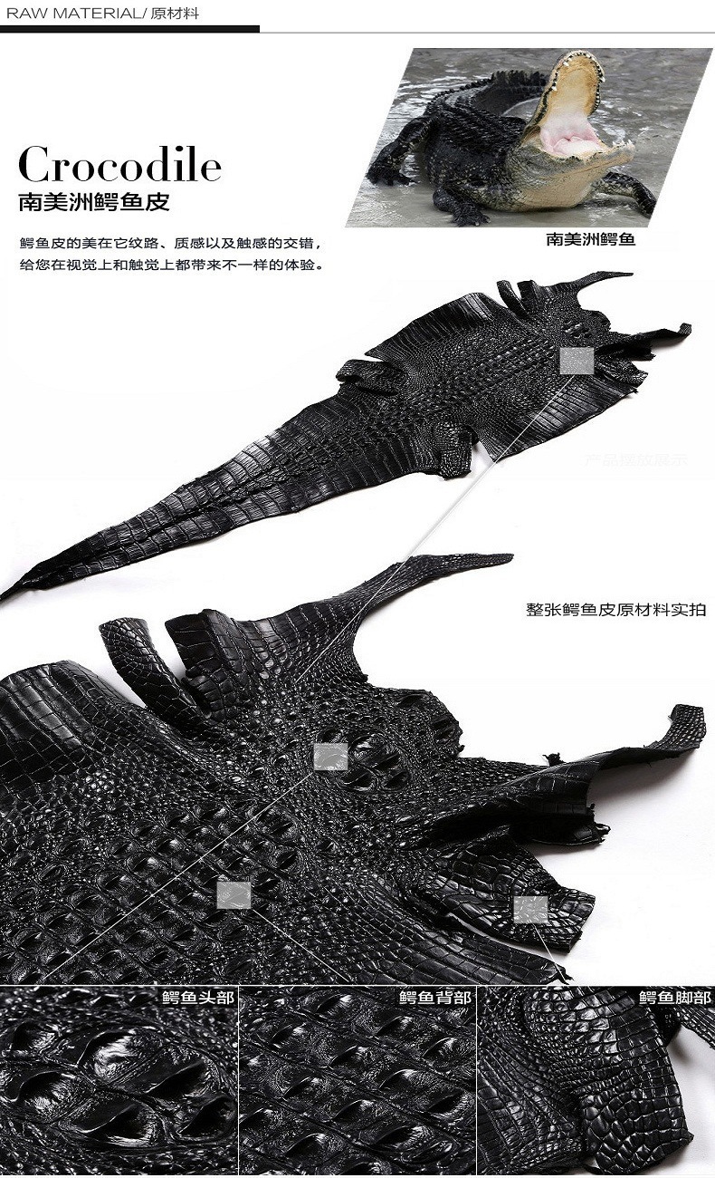 货号:G1063规格:20cm宽 x 32cm高 x 10cm厚面料:鳄鱼皮内衬:牛皮用途:商务、休闲容量:可装入手机、钱包、香烟纸巾、折叠伞等物品内部结构:1个主袋、1个前拉链副袋、1个拉链暗袋、1个内贴袋