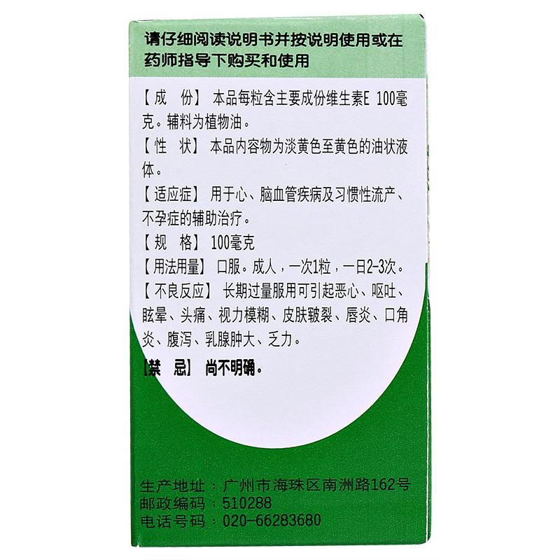 【成份】本品每粒含主要成份维生素E 100毫克,辅料为植物油。