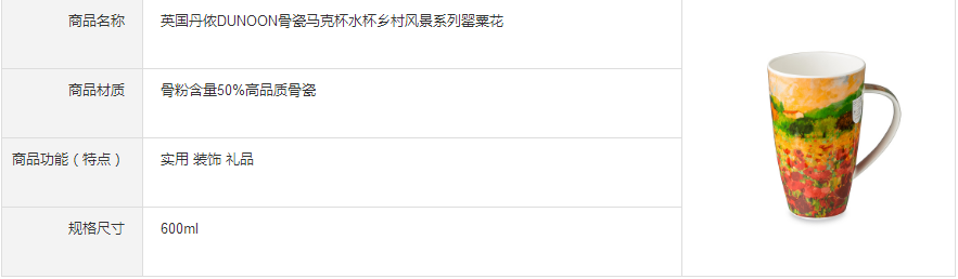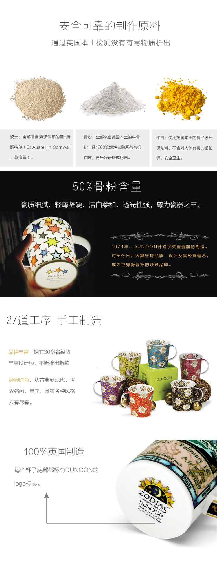 1、安全可靠的制作原料、通过英国本土测试没有有毒物质析出 2、50%骨粉含量、瓷质细腻、轻薄坚硬、洁白柔和、透光性强 3、27道工序,英国手工制作。