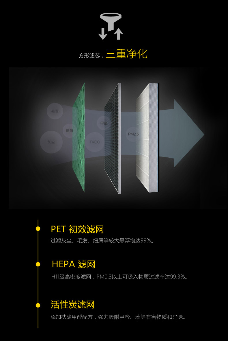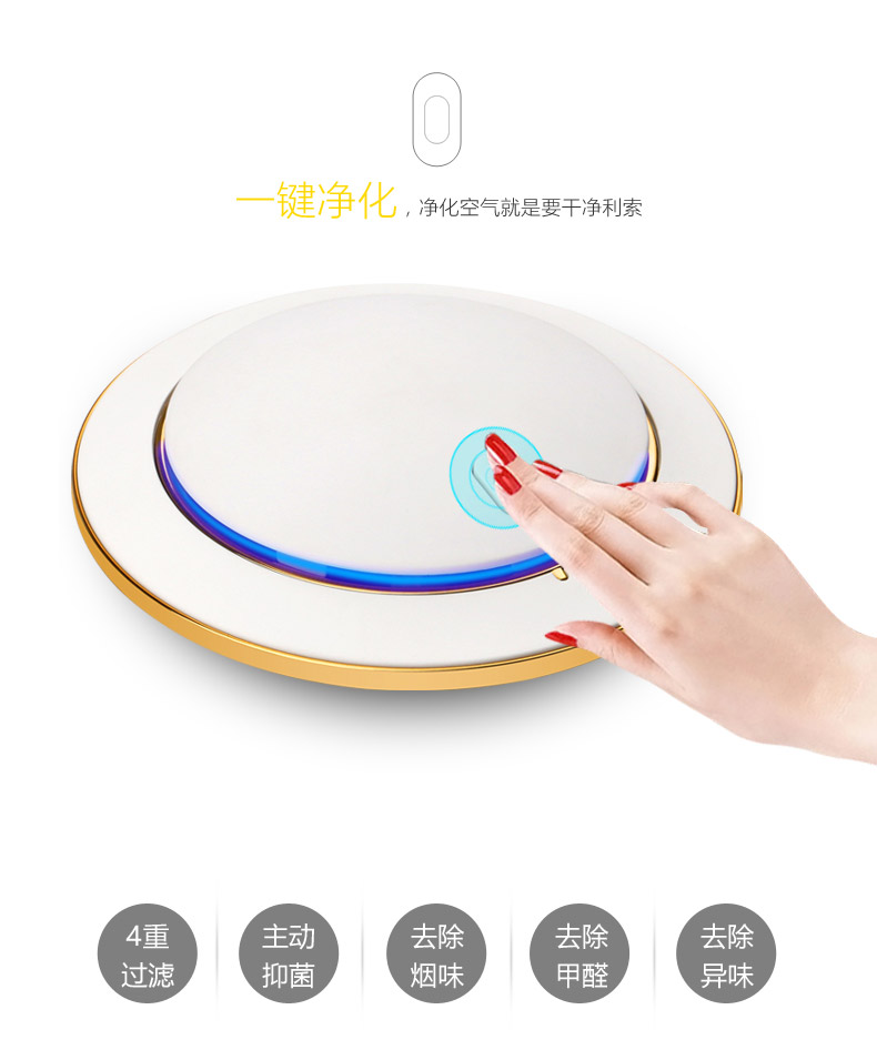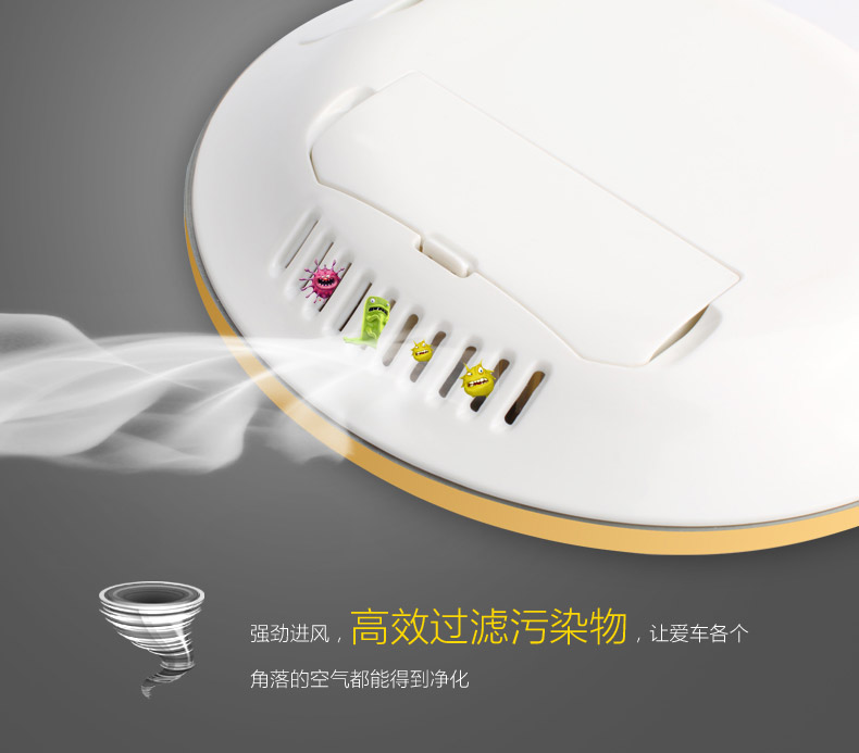 活性炭滤网、冷触酶、HEPA滤网,除尘/除臭/去烟味的作用。清新空气:香薰海绵注入天然植物萃取香薰精油原液,气味温和、芳香怡人,能有效的去除车内、家居、办公、休闲娱乐等场所异味,使空气清新宜人