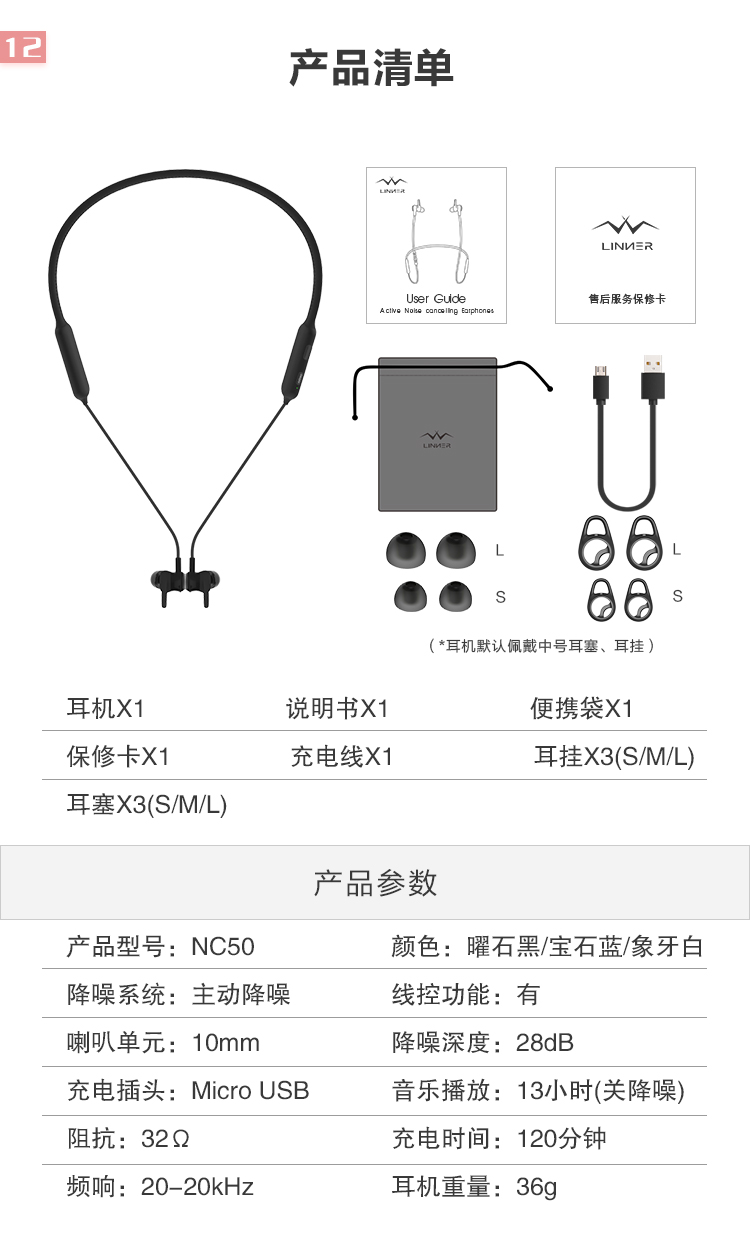 特性:无线蓝牙 主动降噪 挂脖式 13小时续航 IPX4生活防水