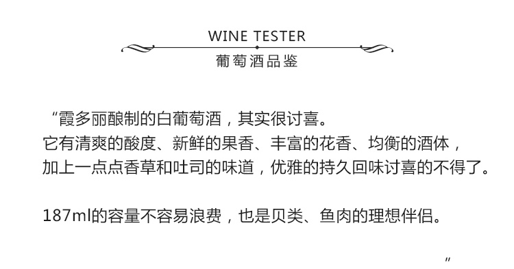 搭配菜肴: 鱼/贝类/白肉/沙拉