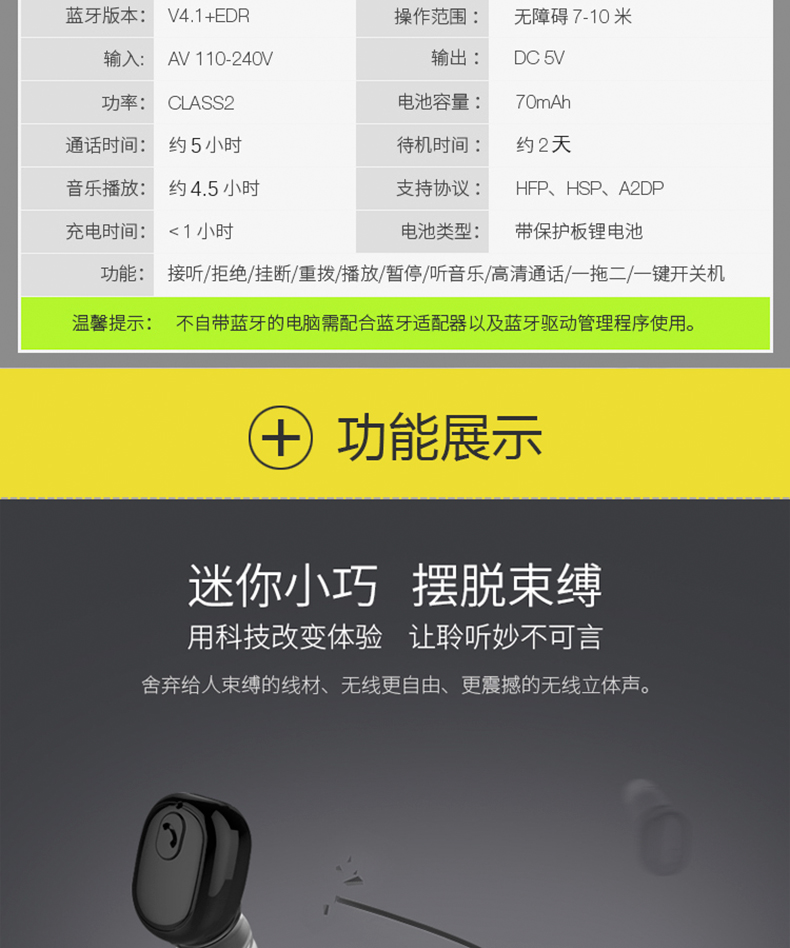 产品名称:颐电迷你超小隐形无线蓝牙耳机