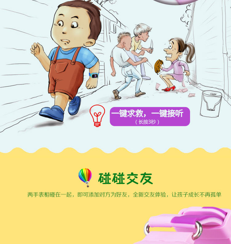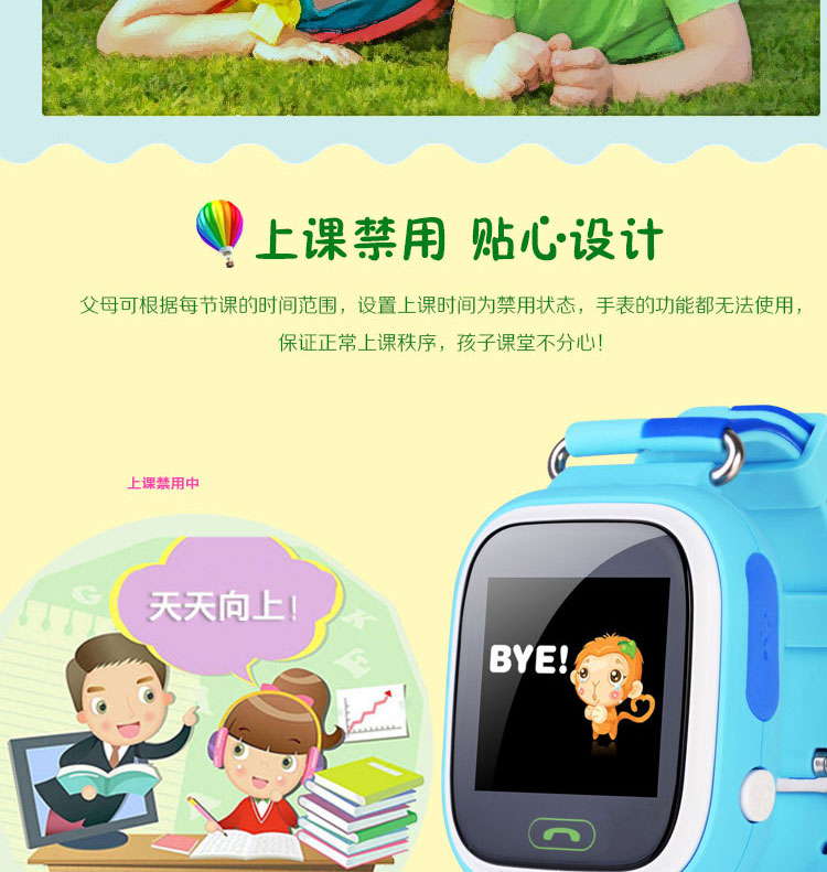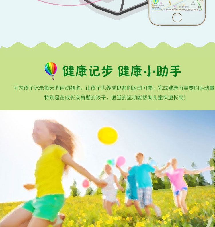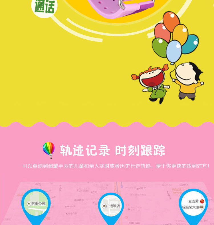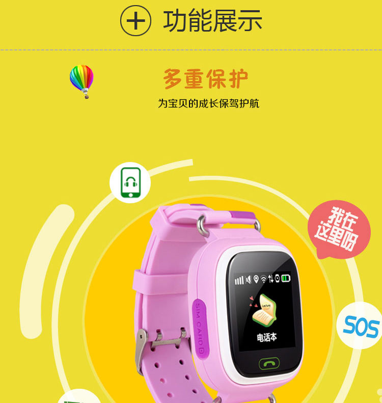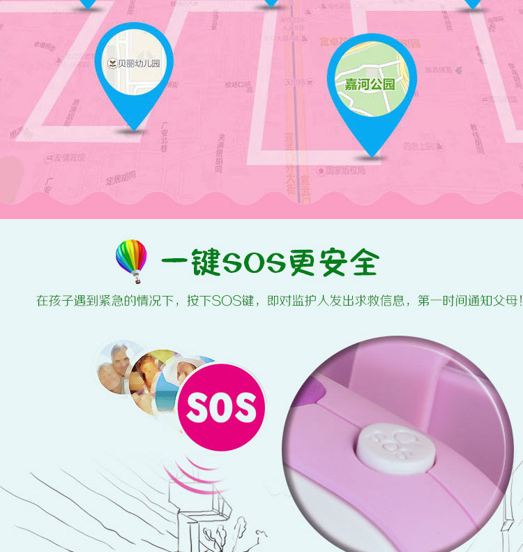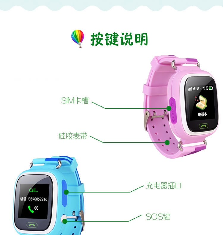 1、双向通话、健康足迹、手表闹钟、安全区域、一键SOS求救;